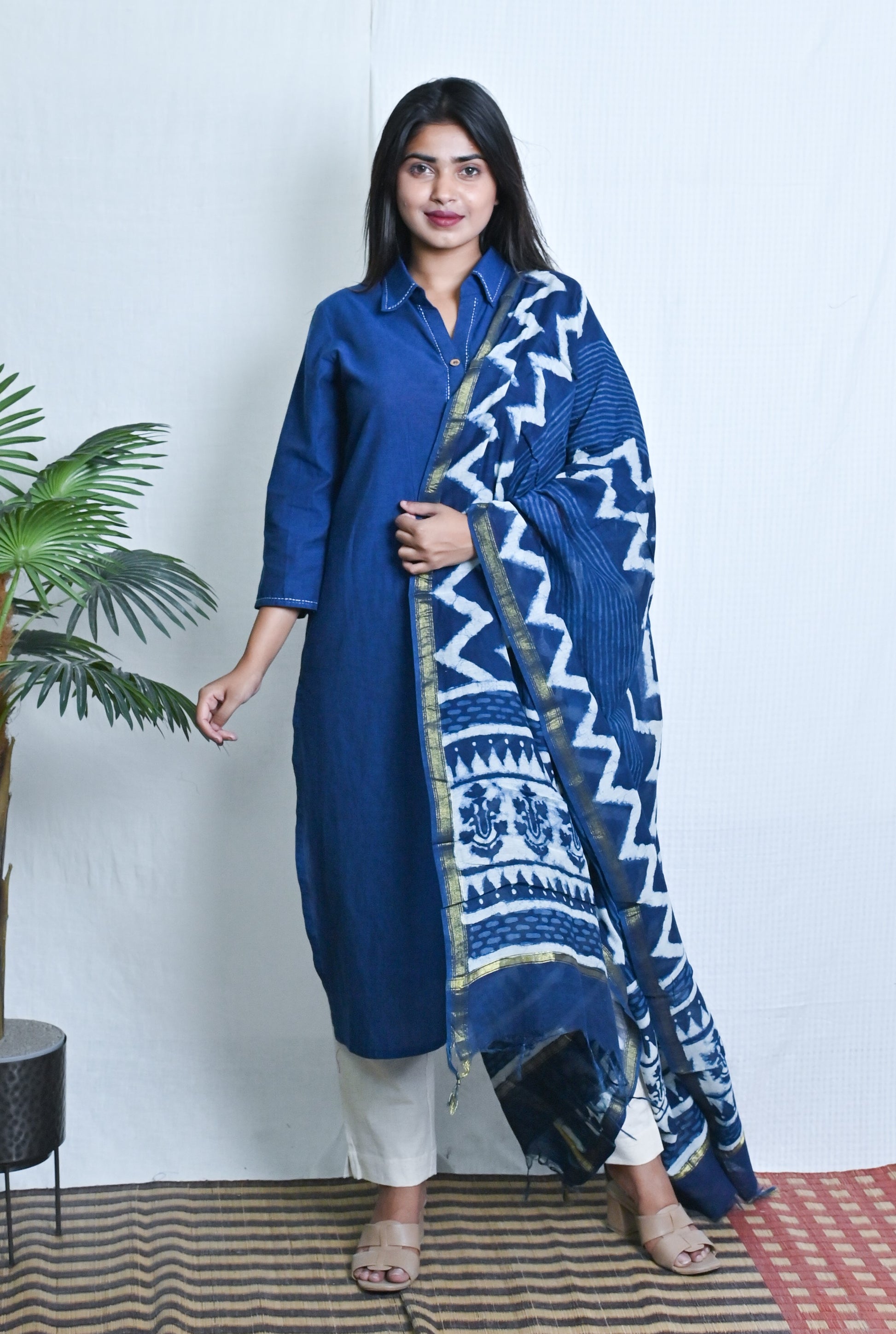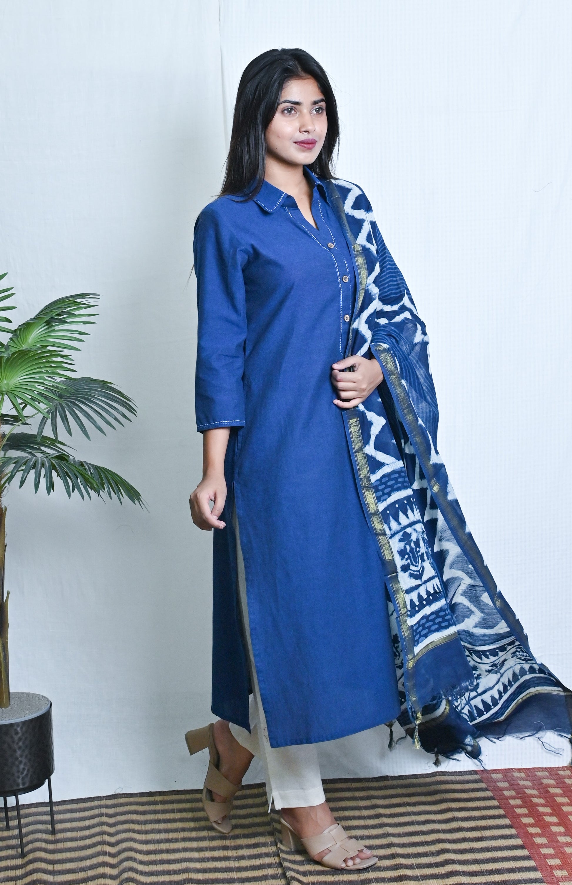 "Elevate your ethnic wardrobe with this Blue Kantha Hand Embroidered Kurta, featuring intricate Kantha embroidery on the placket and collar. The straight-cut design with a stylish shirt collar adds a modern touch to timeless craftsmanship."