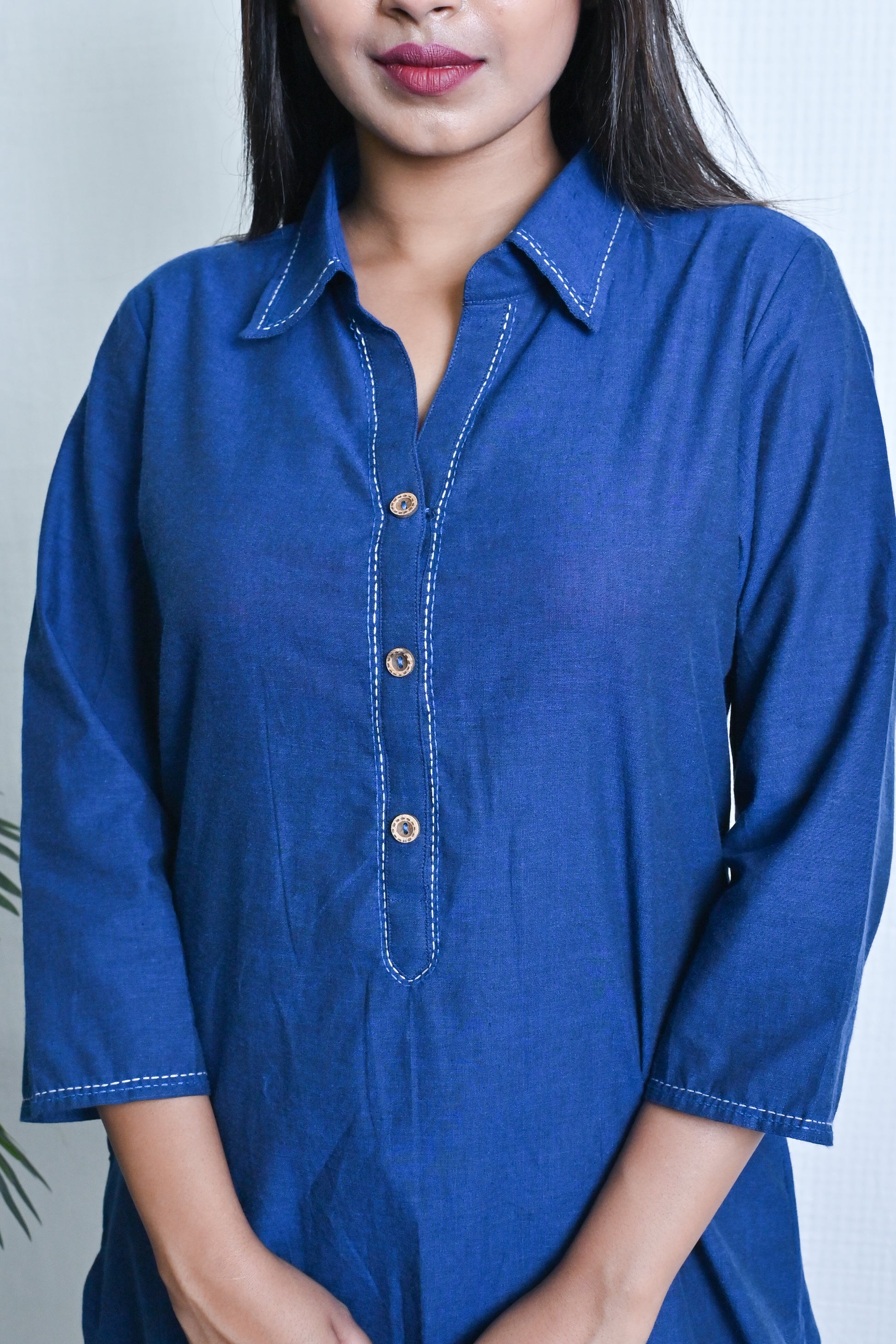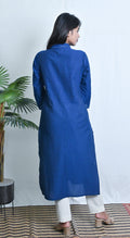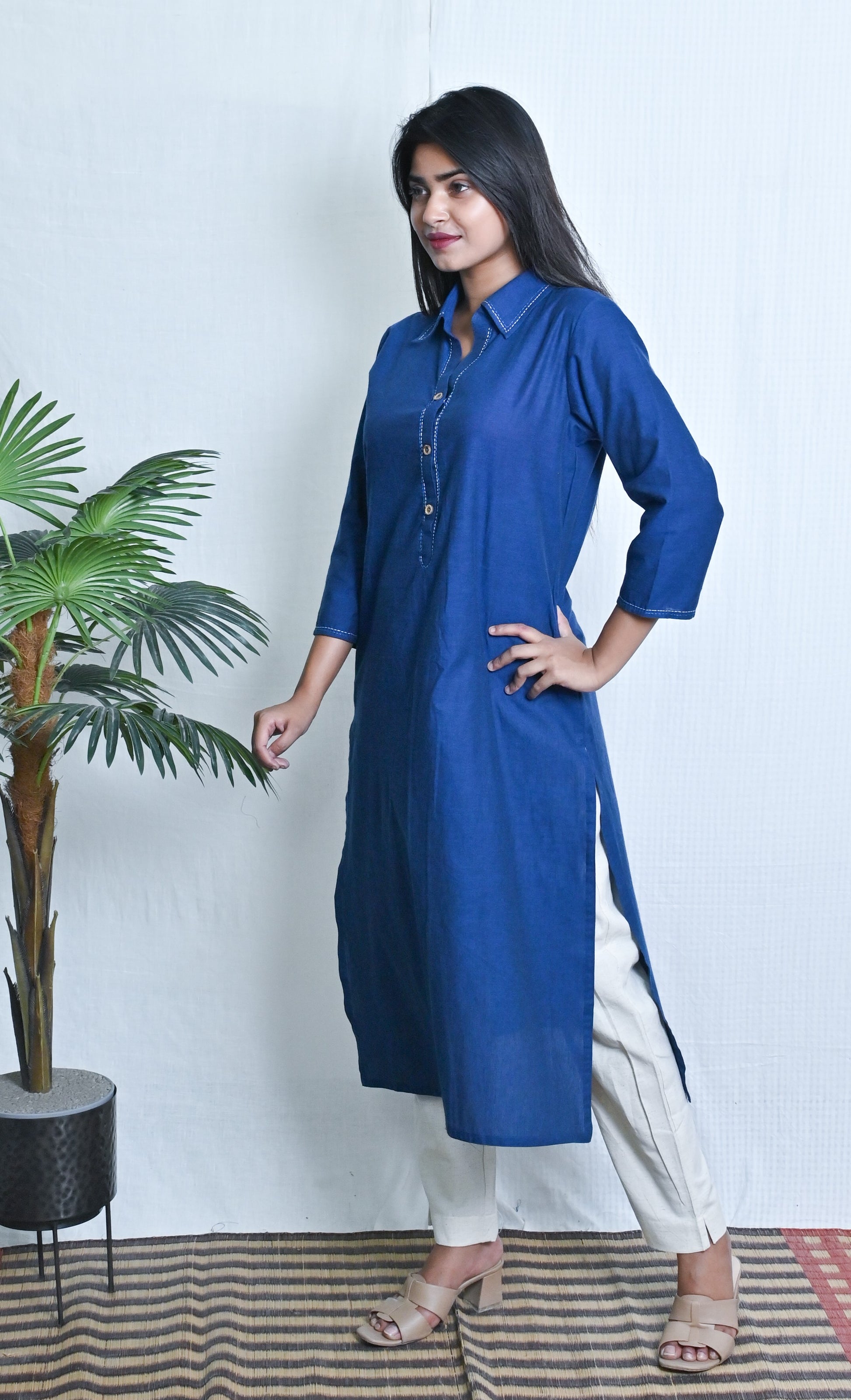 Blue Straight Cut Shirt Collar Kurta with Hand Embroidery Detailing