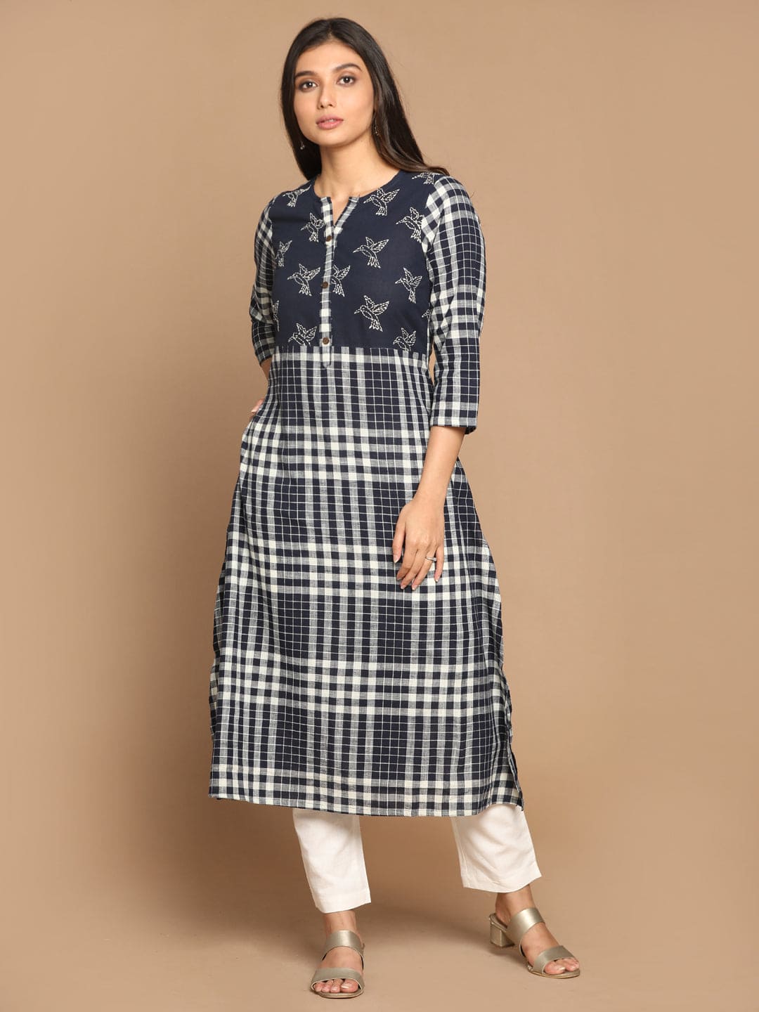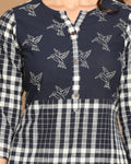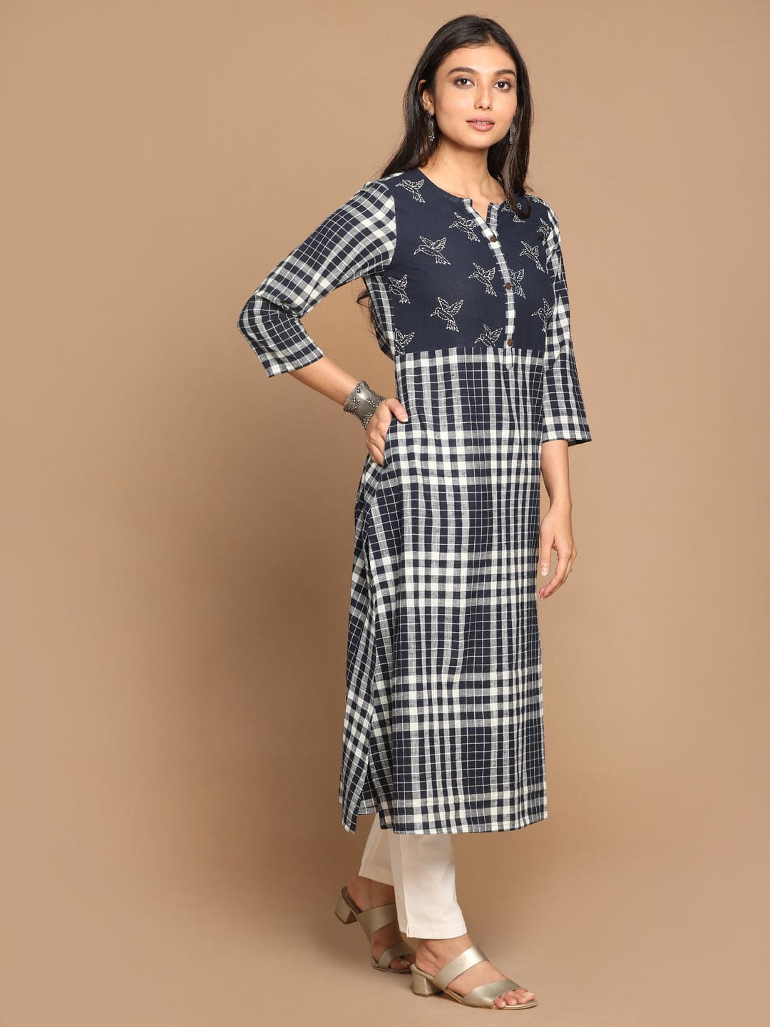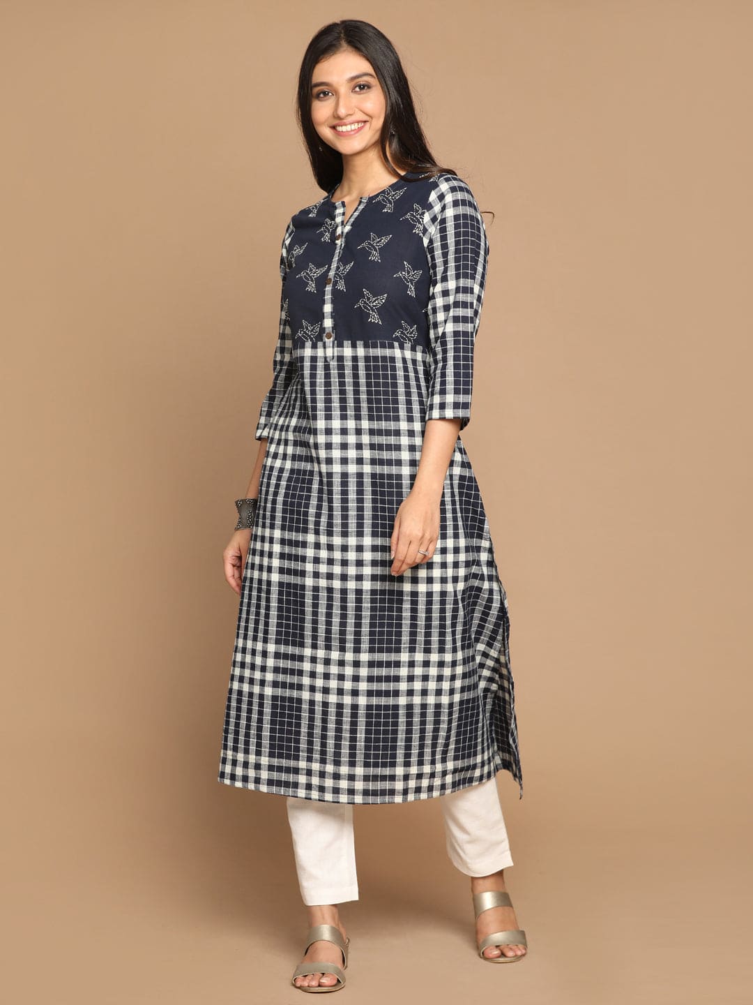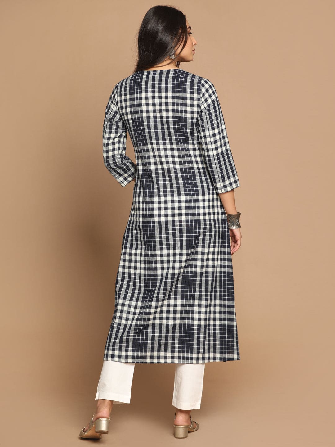Indigo Straight Cut Kurta with Checks & Hand Embroidery Detailing