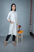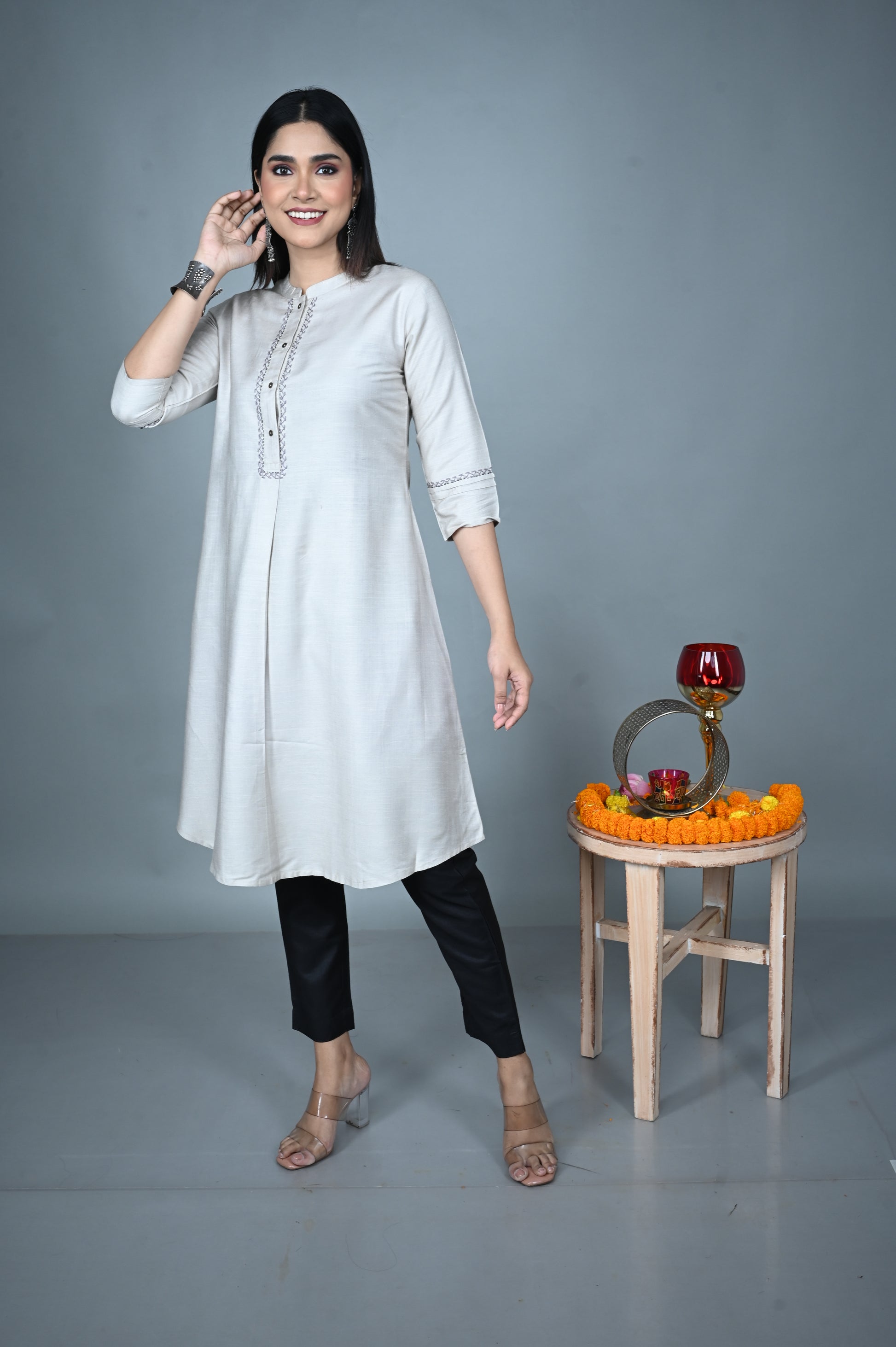 Crafted from soft silk slub, this ivory kurta features a flattering A-line silhouette and a graceful neckline adorned with delicate kantha hand embroidery. With three-quarter sleeves and a refined finish, this elegant piece blends timeless tradition with contemporary wearability β perfect for festive occasions and everyday sophistication.