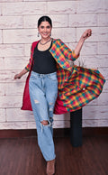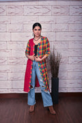 Red Handwoven Checks Front Open With Kantha Hand Embroidery Detailing. Can be styled as an overlay or a kurta.