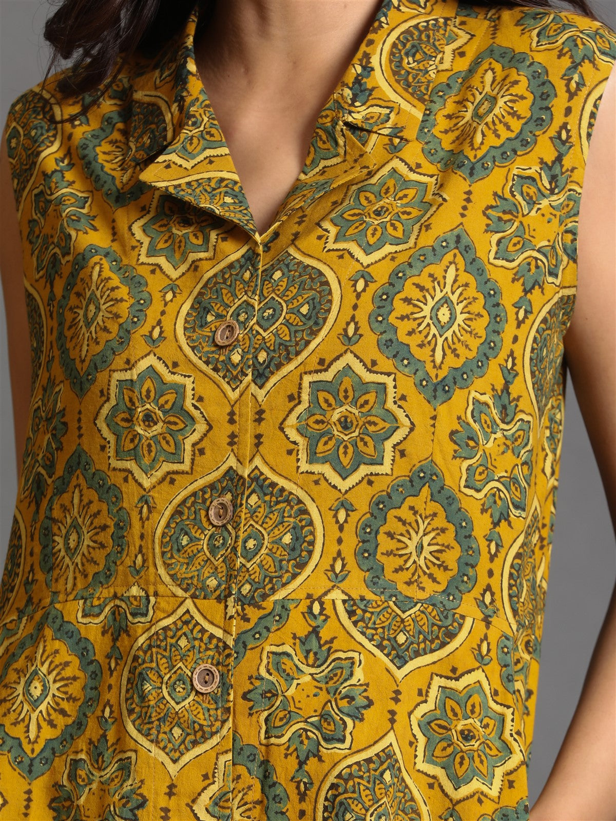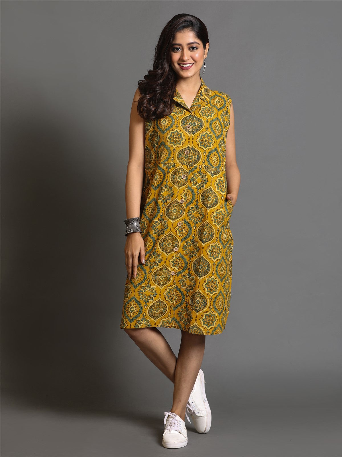 Mustard Ajrakh Block-Printed Shirt collar Dress