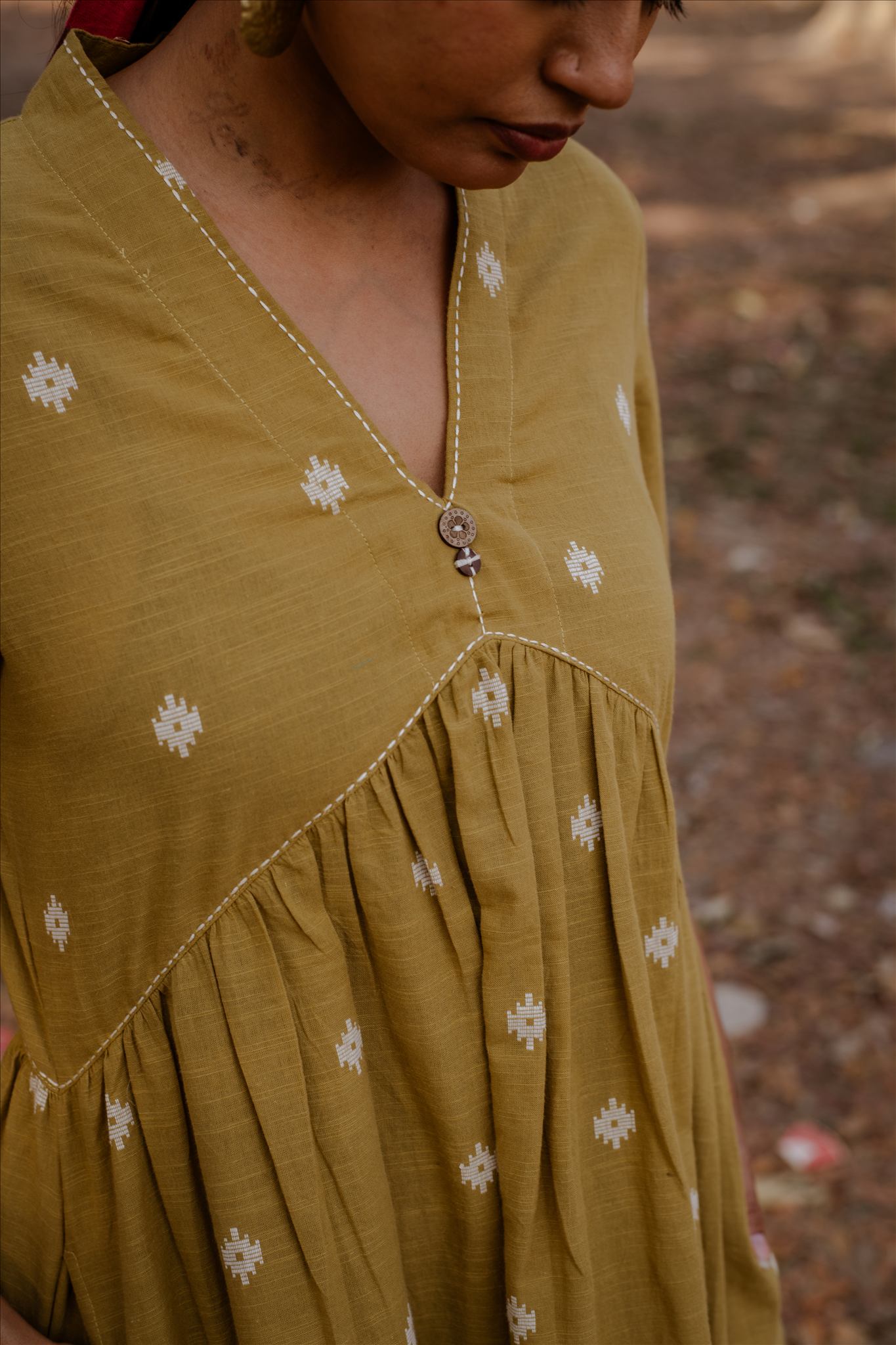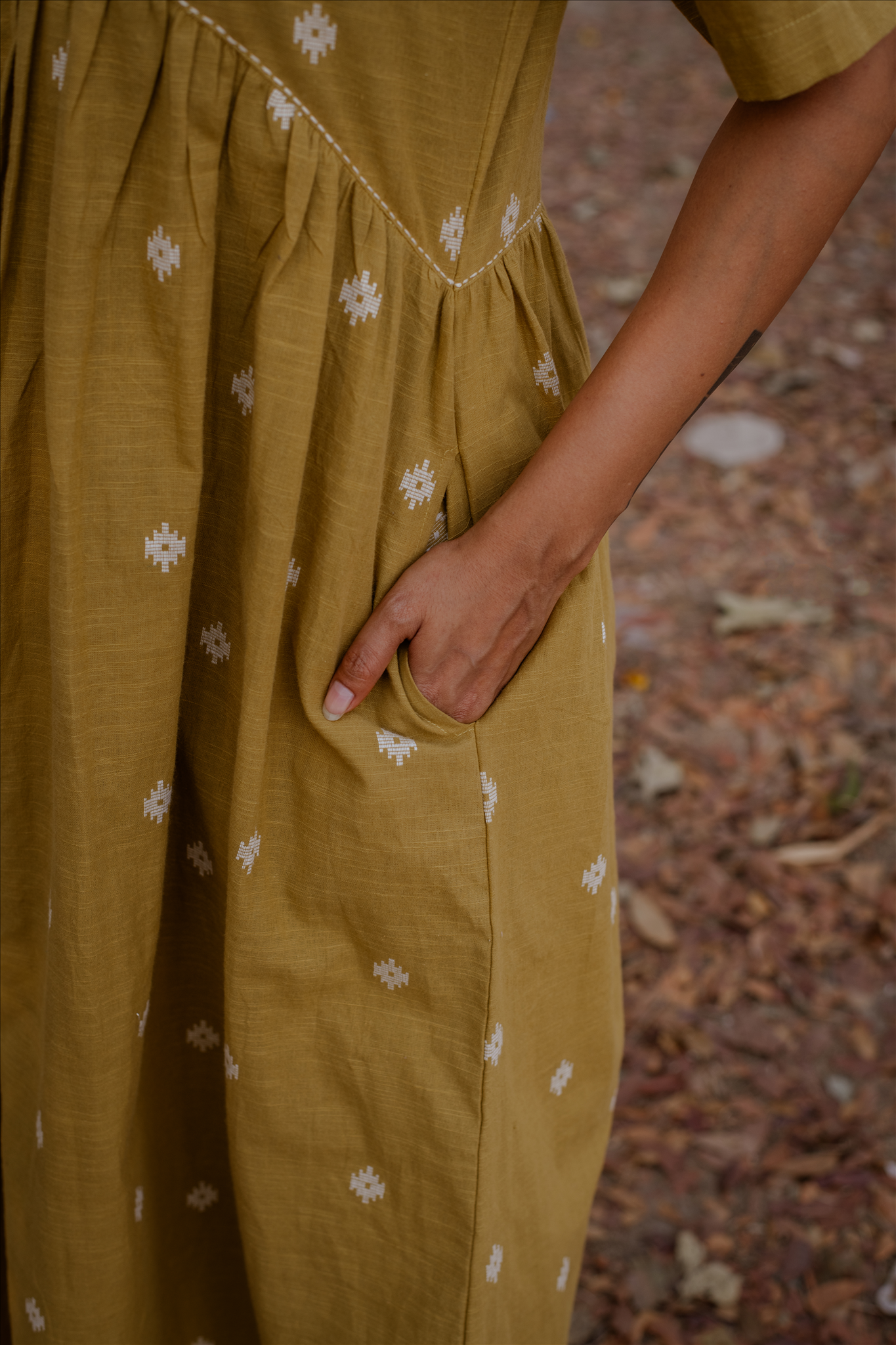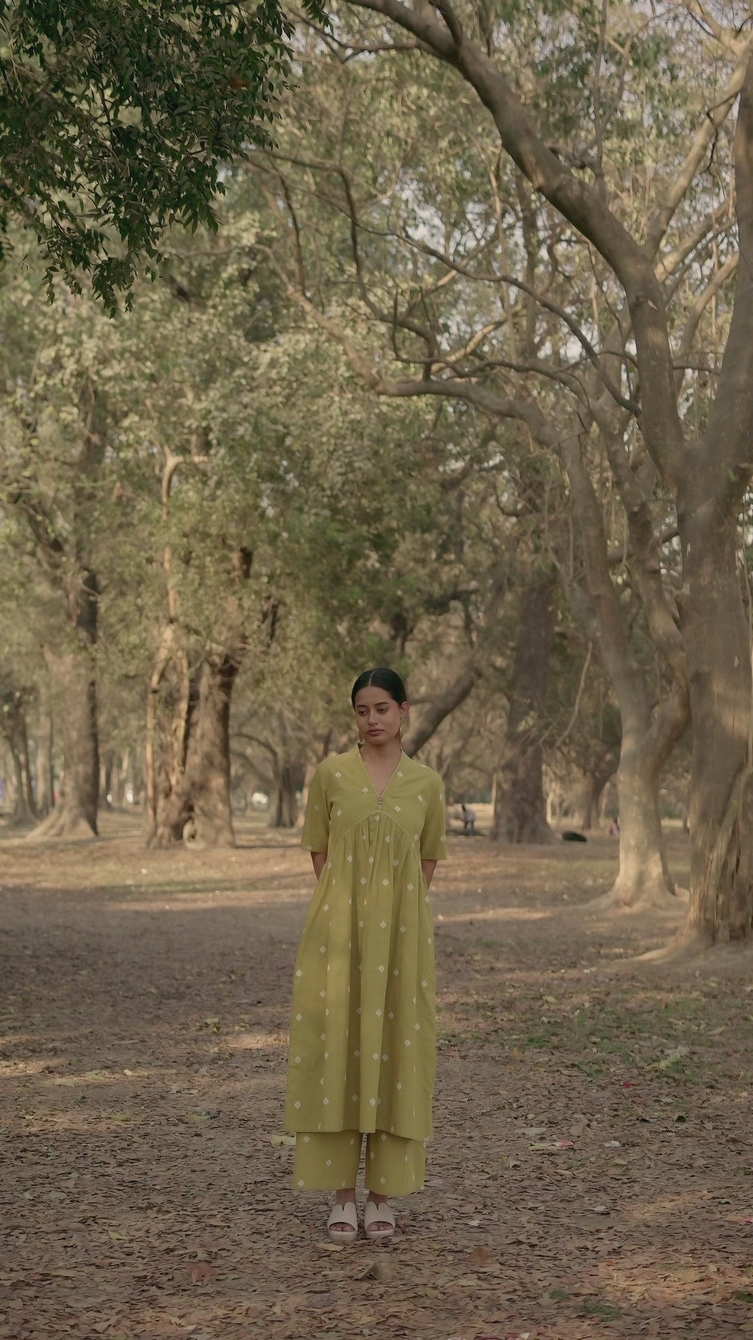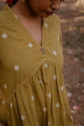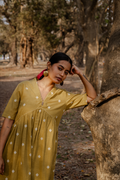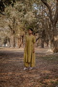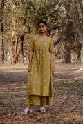 Crafted in breathable 100% cotton, this mustard cotton woven buti kurta set for women brings together handcrafted detailing and an easy, modern silhouette. The mustard cotton kurta features delicate woven buti motifs that add subtle texture, along with a soft V-neckline and gentle gathers that create a relaxed cotton A-line kurta silhouette. Paired with matching mustard cotton wide-leg pants, the set offers comfort, fluid movement, and everyday versatility. Rooted in traditional weaving yet styled with minimal elegance, this pure cotton kurta set for women is designed for effortless, all-day wear.