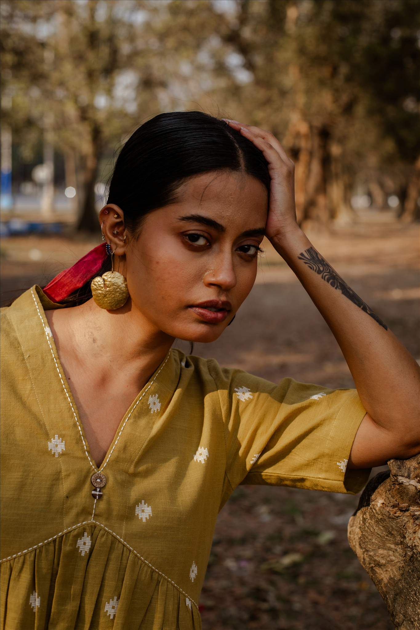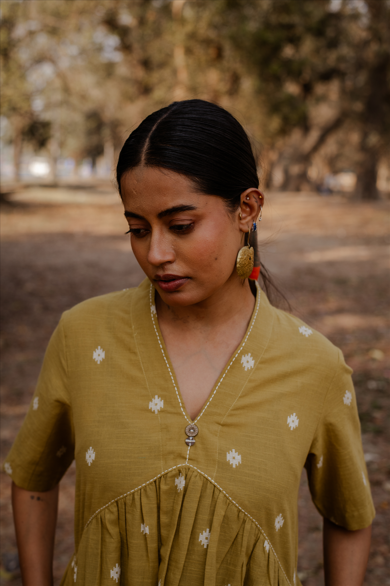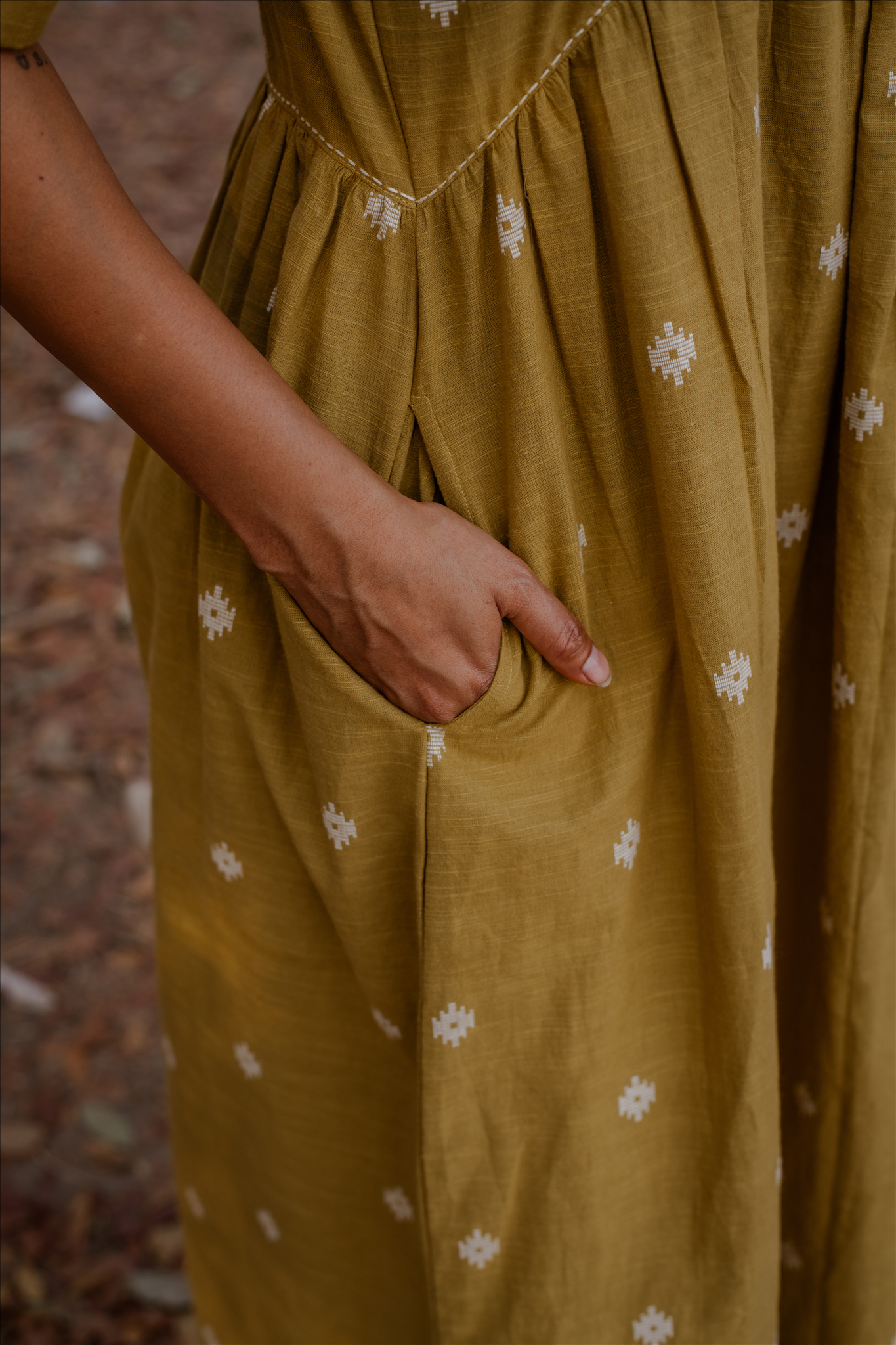 Crafted in breathable 100% cotton, this mustard cotton woven buti kurta set for women brings together handcrafted detailing and an easy, modern silhouette. The mustard cotton kurta features delicate woven buti motifs that add subtle texture, along with a soft V-neckline and gentle gathers that create a relaxed cotton A-line kurta silhouette. Paired with matching mustard cotton wide-leg pants, the set offers comfort, fluid movement, and everyday versatility. Rooted in traditional weaving yet styled with minimal elegance, this pure cotton kurta set for women is designed for effortless, all-day wear.