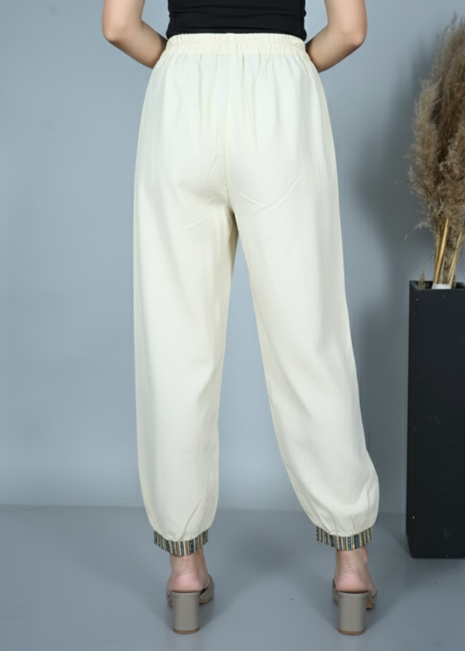 Classic off-white Pathani pants elevated with delicate Ajrakh hand block print trims. Crafted for comfort and style, these pants bring a subtle traditional charm to a timeless silhouette, perfect for pairing with handwoven kurtas or tunics for a refined, artisanal look.