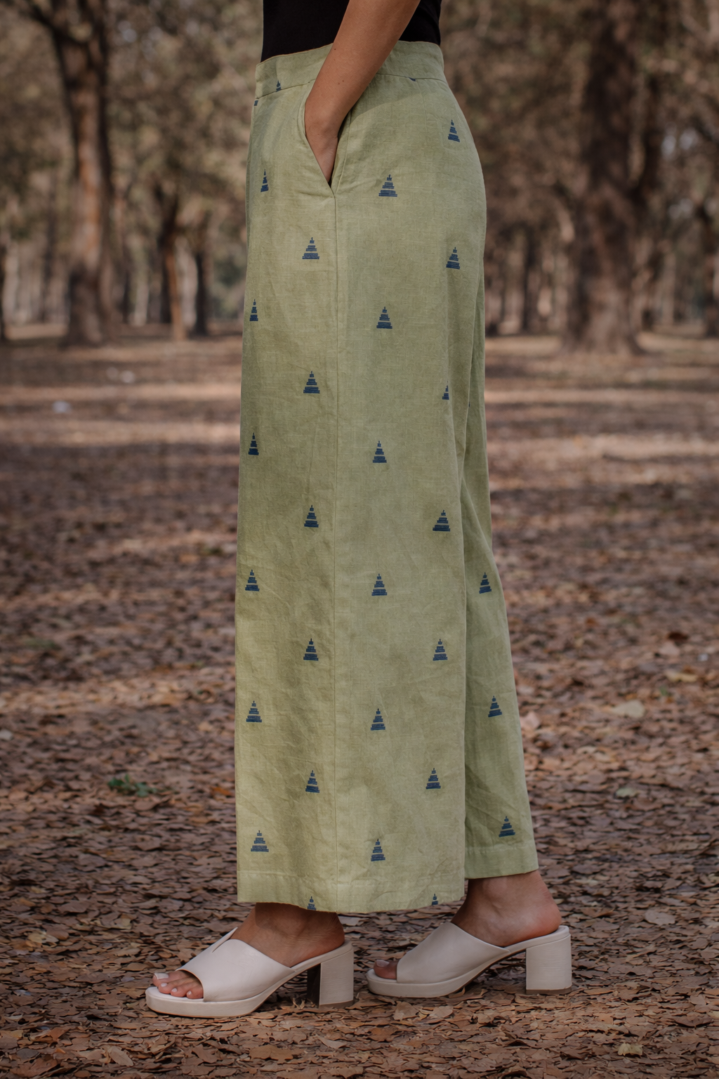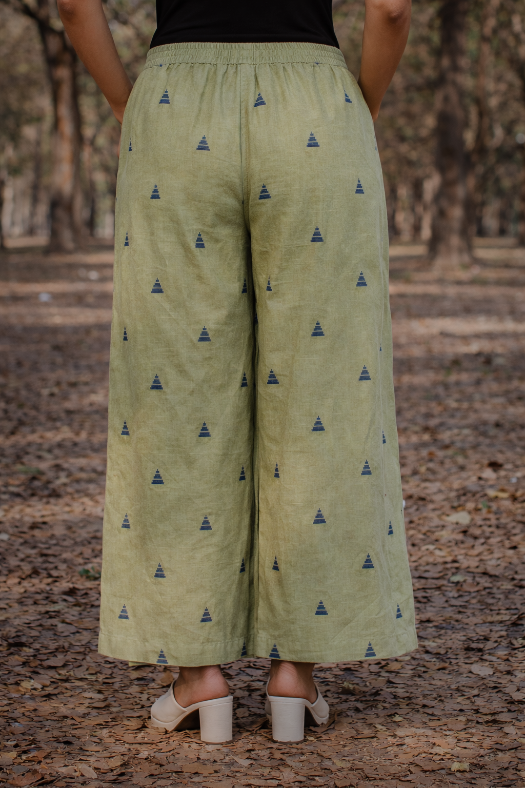 Crafted in breathable 100% pure cotton, these olive green cotton wide-leg pants for women feature delicate woven buti motifs that add quiet character to the fabric. The relaxed cotton wide-leg silhouette allows easy movement while maintaining a clean, effortless look. Designed with a comfortable waistband and practical pockets, these olive green cotton trousers for women combine handcrafted detailing with everyday versatility. Easy to style with kurtas, shirts, or co-ord tops, these pure cotton pants for women offer comfort, simplicity, and understated elegance.