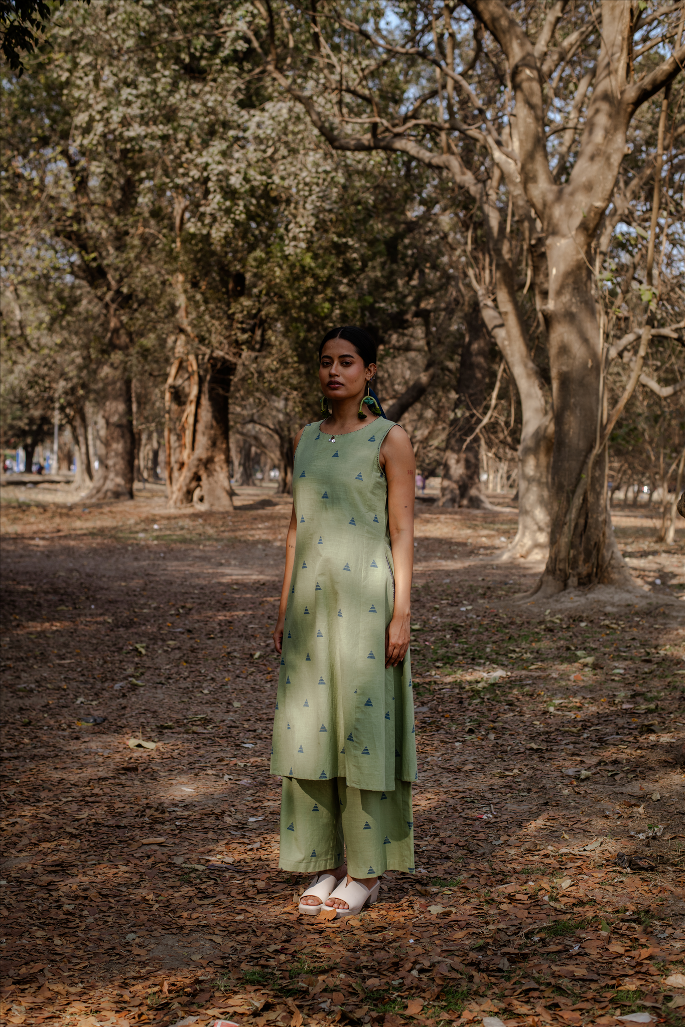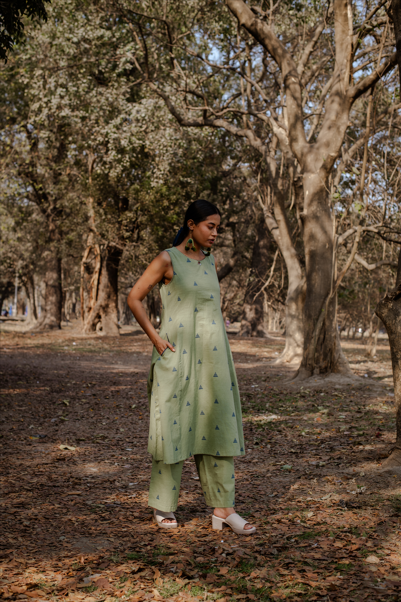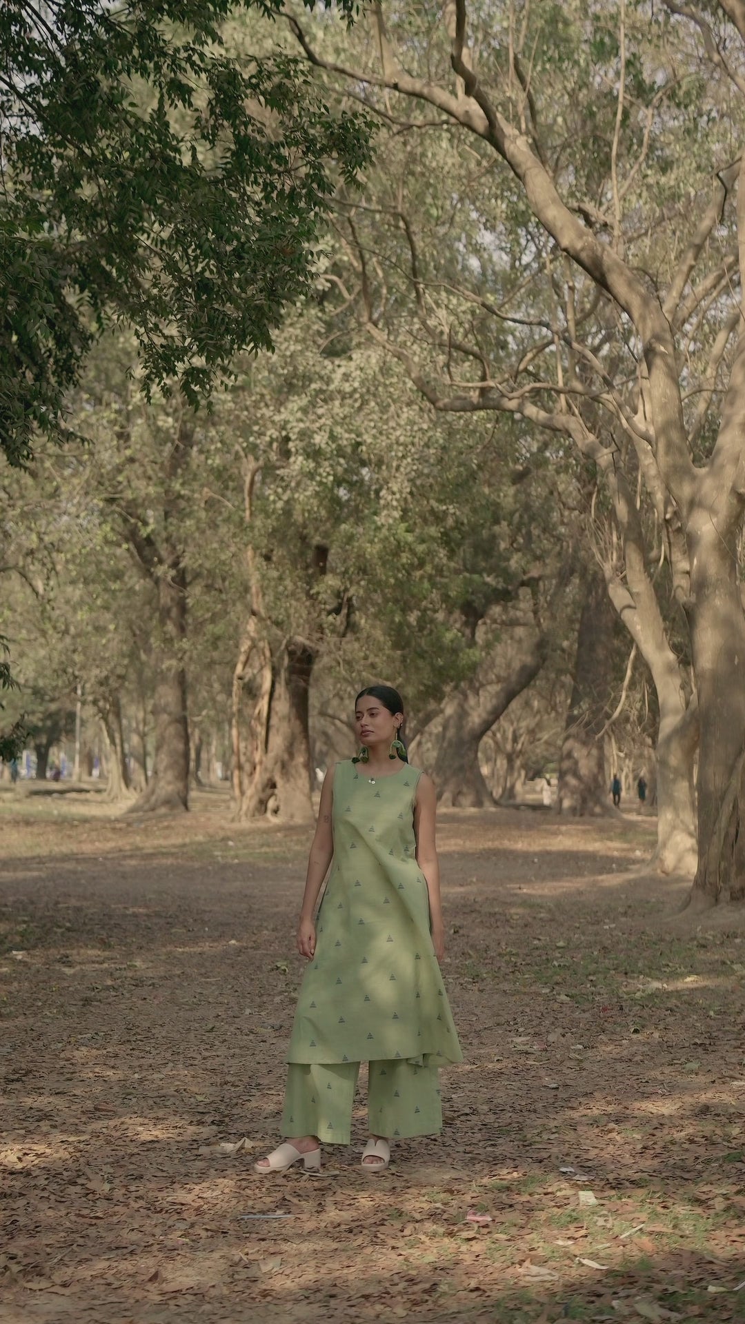 A breathable cotton co-ord in a muted olive tone, detailed with small minimal motifs. The sleeveless kurta falls into a gentle A-line, allowing easy movement through the day. Paired with relaxed pants in the same fabric, it stays light and comfortable even in the heat. Wear it together or style the kurta on its own as a dress for a softer look.