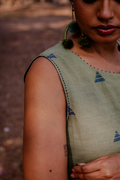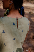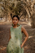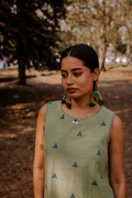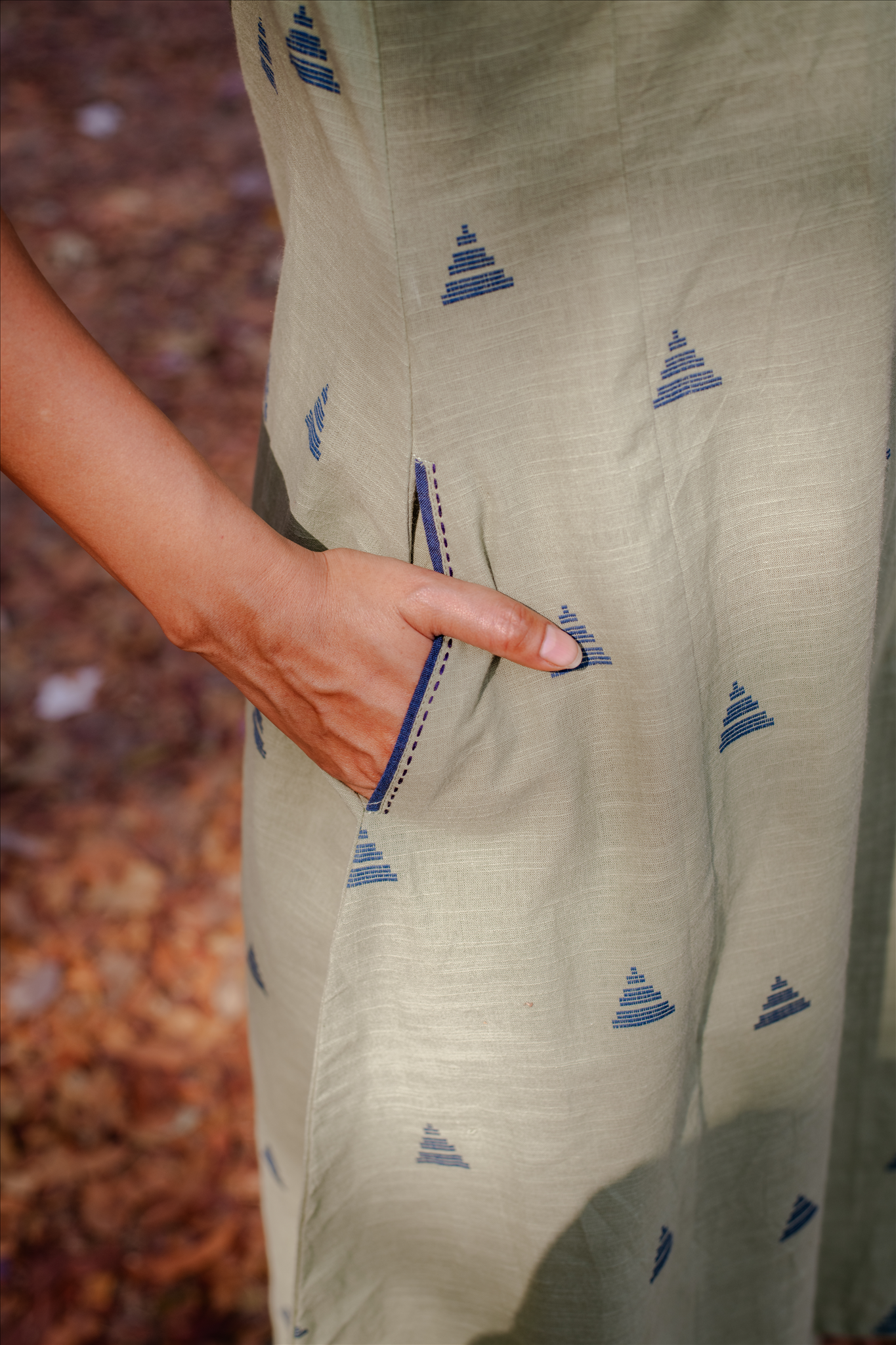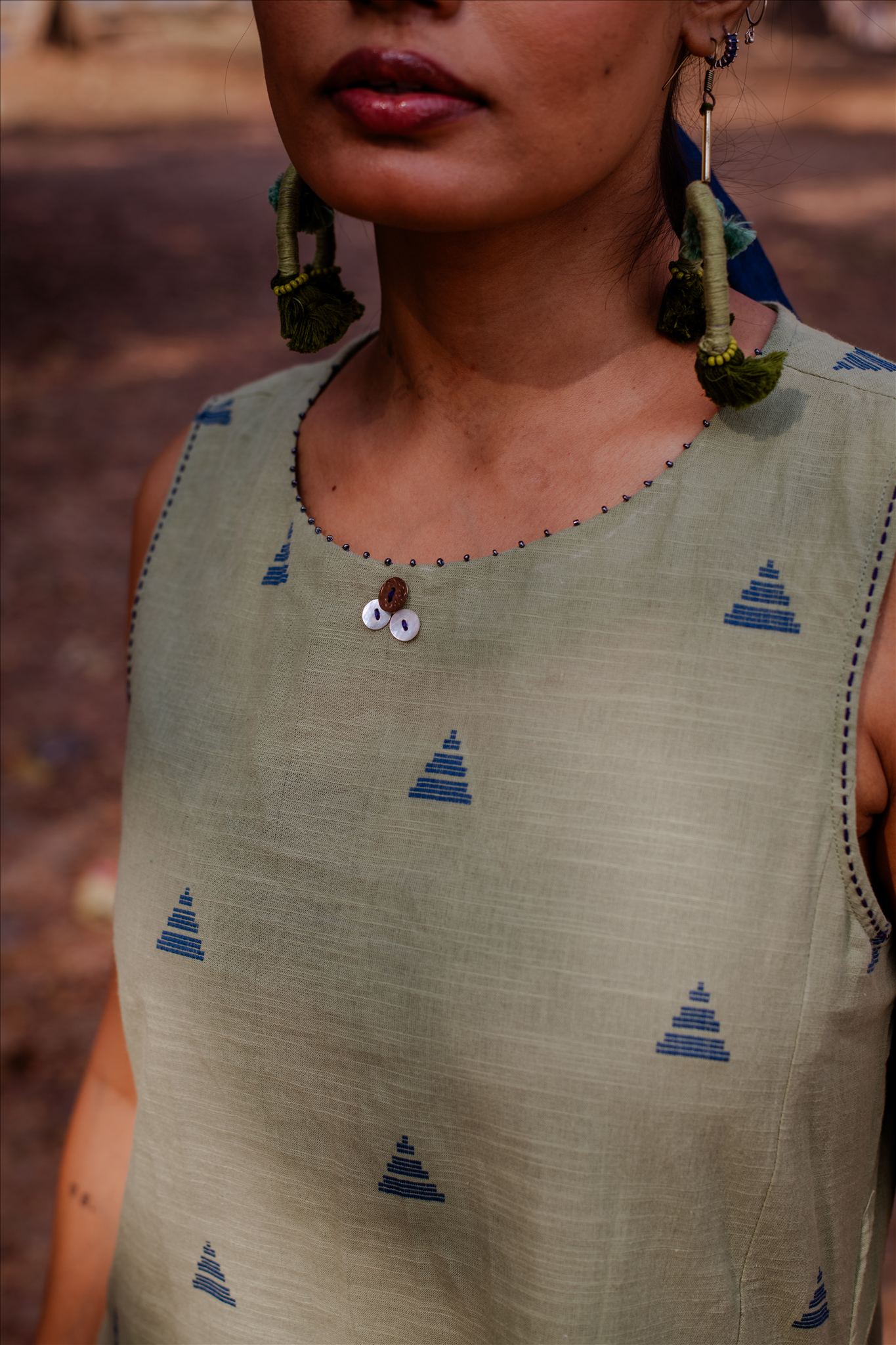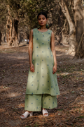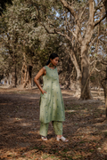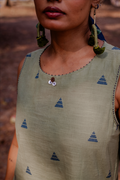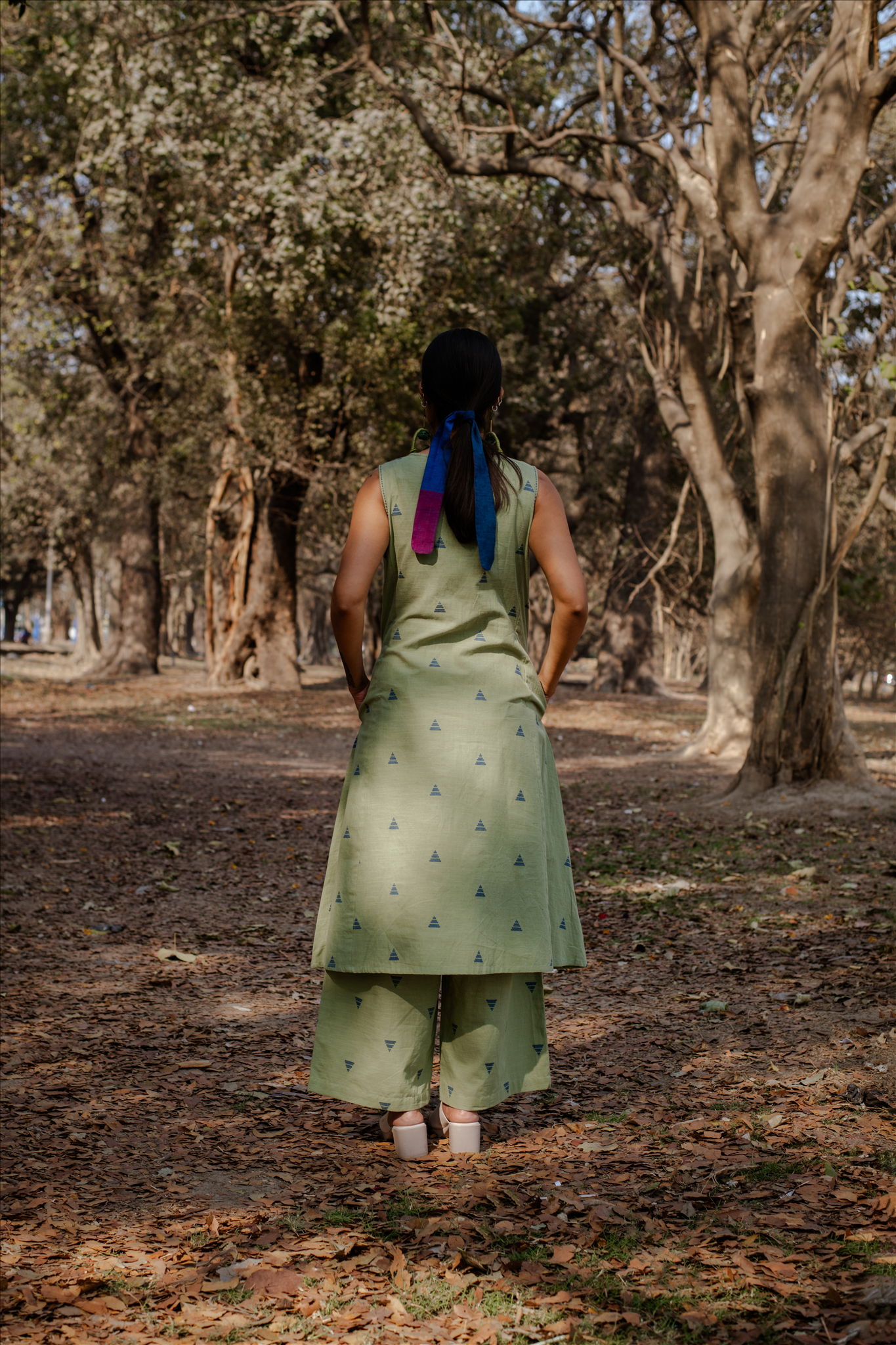 A breathable cotton co-ord in a muted olive tone, detailed with small minimal motifs. The sleeveless kurta falls into a gentle A-line, allowing easy movement through the day. Paired with relaxed pants in the same fabric, it stays light and comfortable even in the heat. Wear it together or style the kurta on its own as a dress for a softer look.