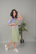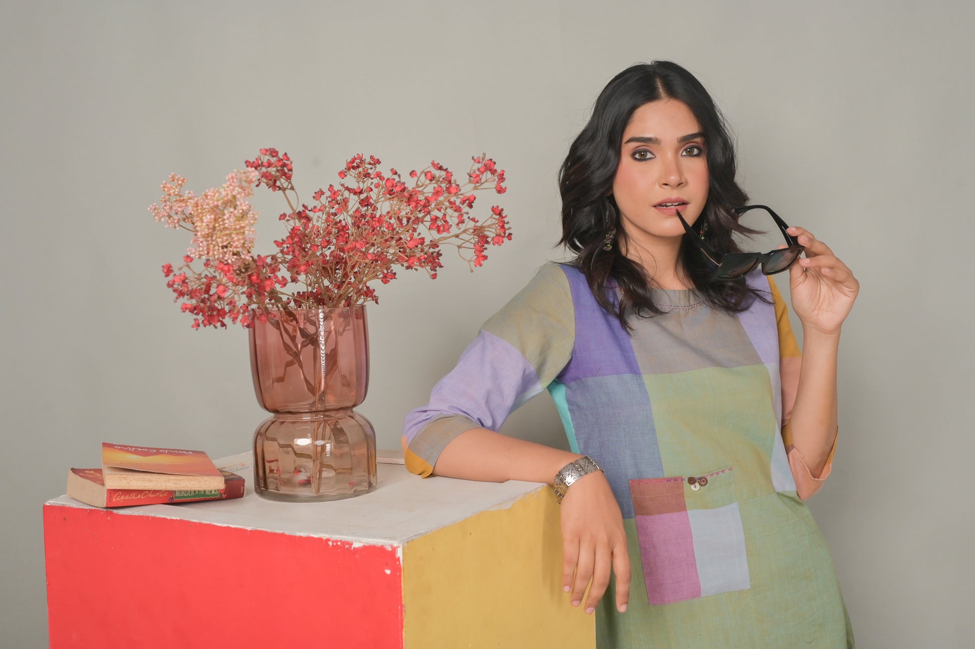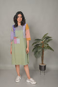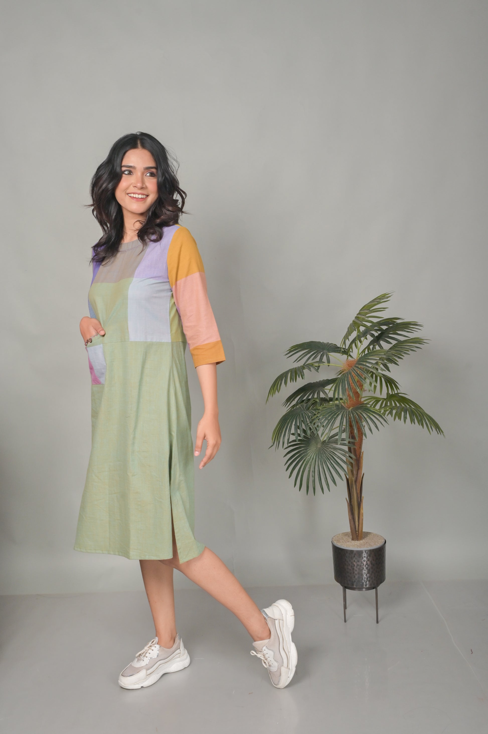 Crafted from handwoven cotton, this pastel checks dress brings together comfort and artistry in a breezy silhouette. The multi-color patchwork yoke with a neat pocket detail adds a playful touch, while the solid light green A-line body ensures a flattering, relaxed fit. Side slits enhance ease of movement, making it ideal for all-day wear. Style it with sneakers for a casual vibe or sandals for a chic outing look.