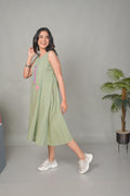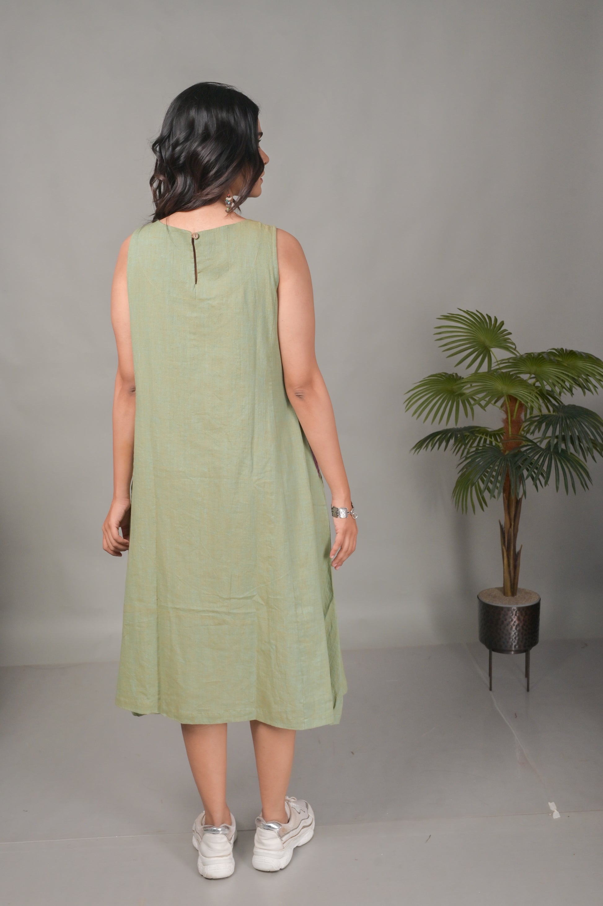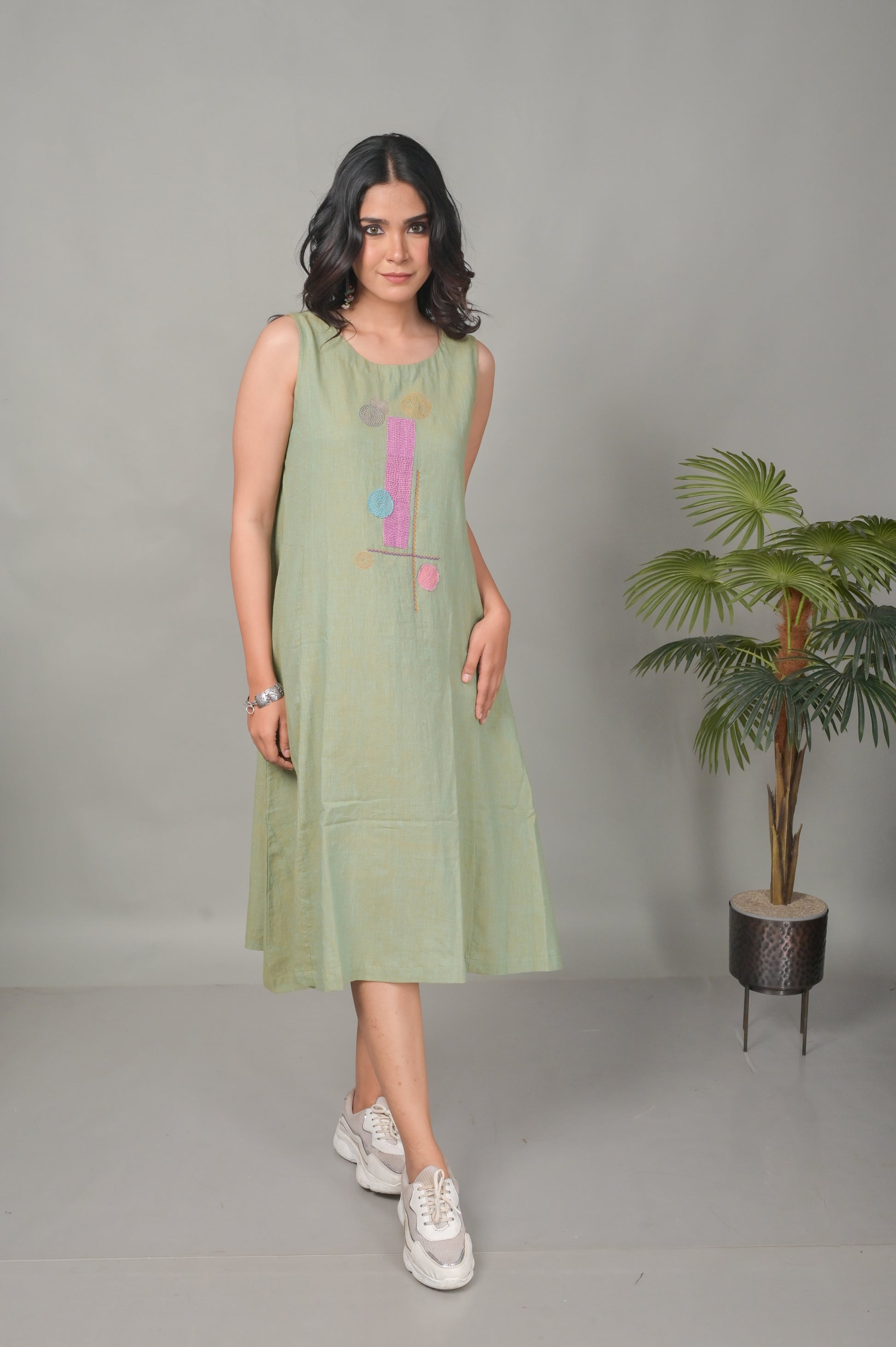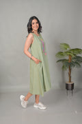 Effortlessly chic and breathable, this sleeveless pastel green dress is crafted from handwoven fabric and finished with playful patchwork details. Delicate kantha hand embroidery adds a touch of artisanal charm, making it as unique as it is comfortable. Perfect for day outings, brunches, or relaxed evenings, this smart silhouette keeps you stylish and at ease all day.