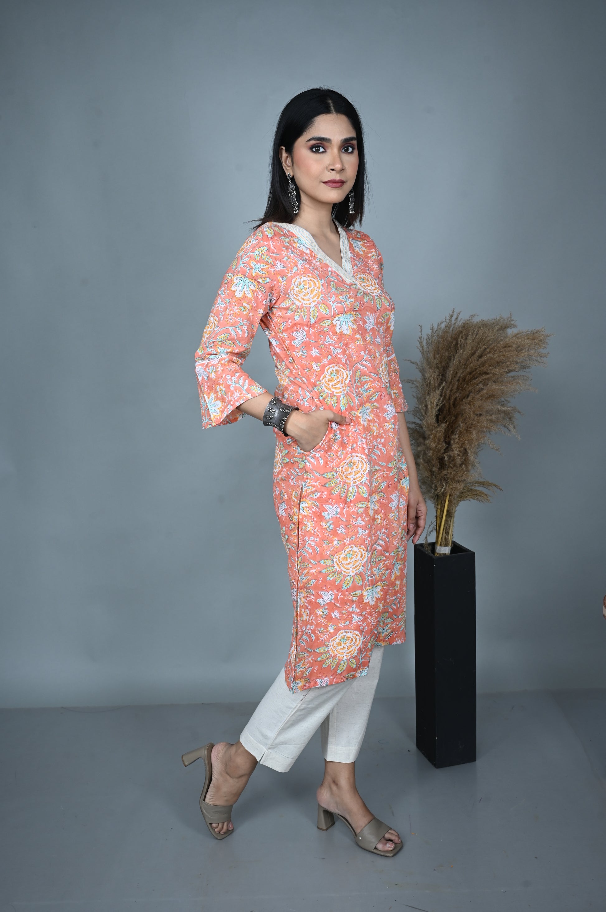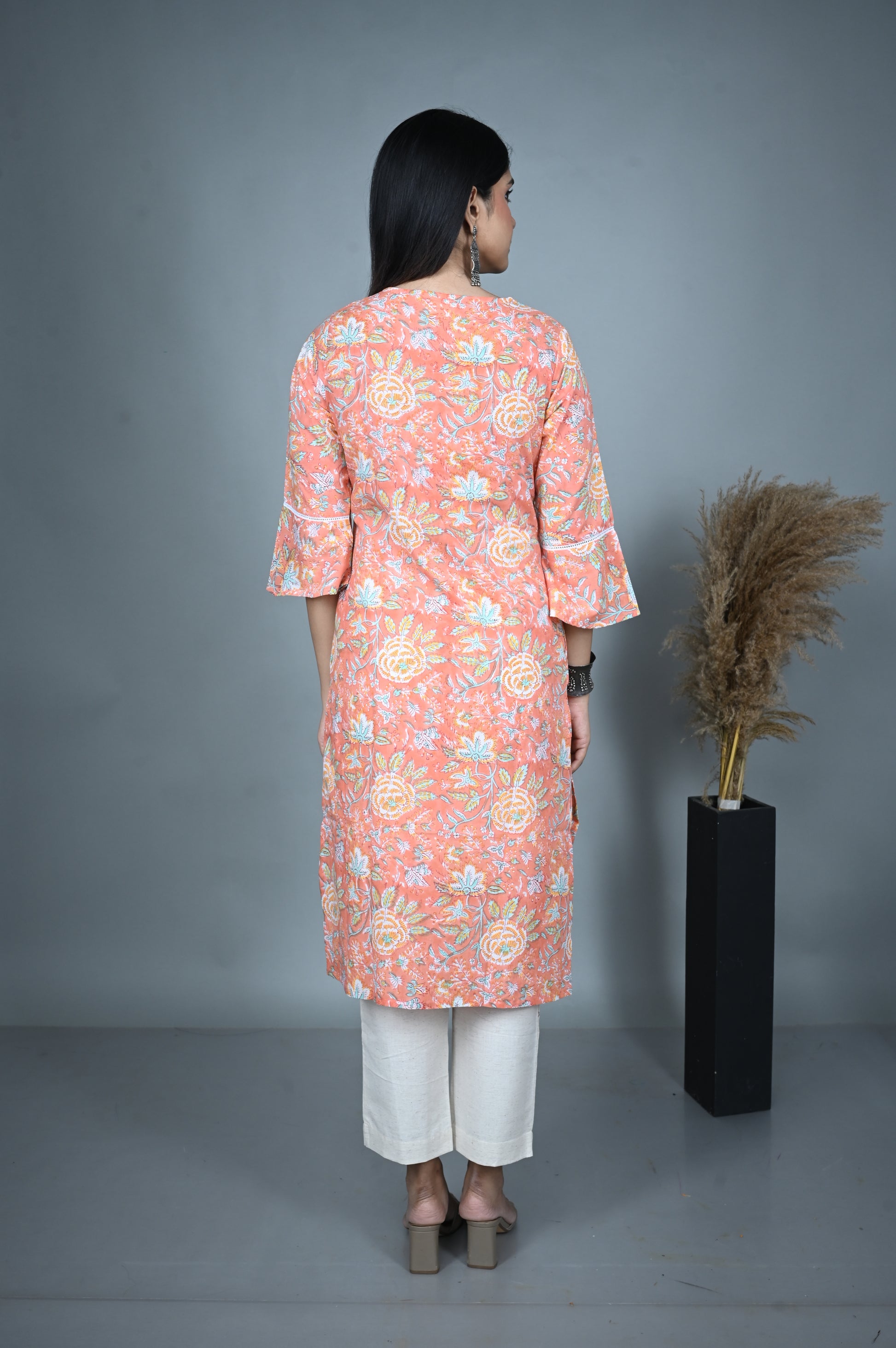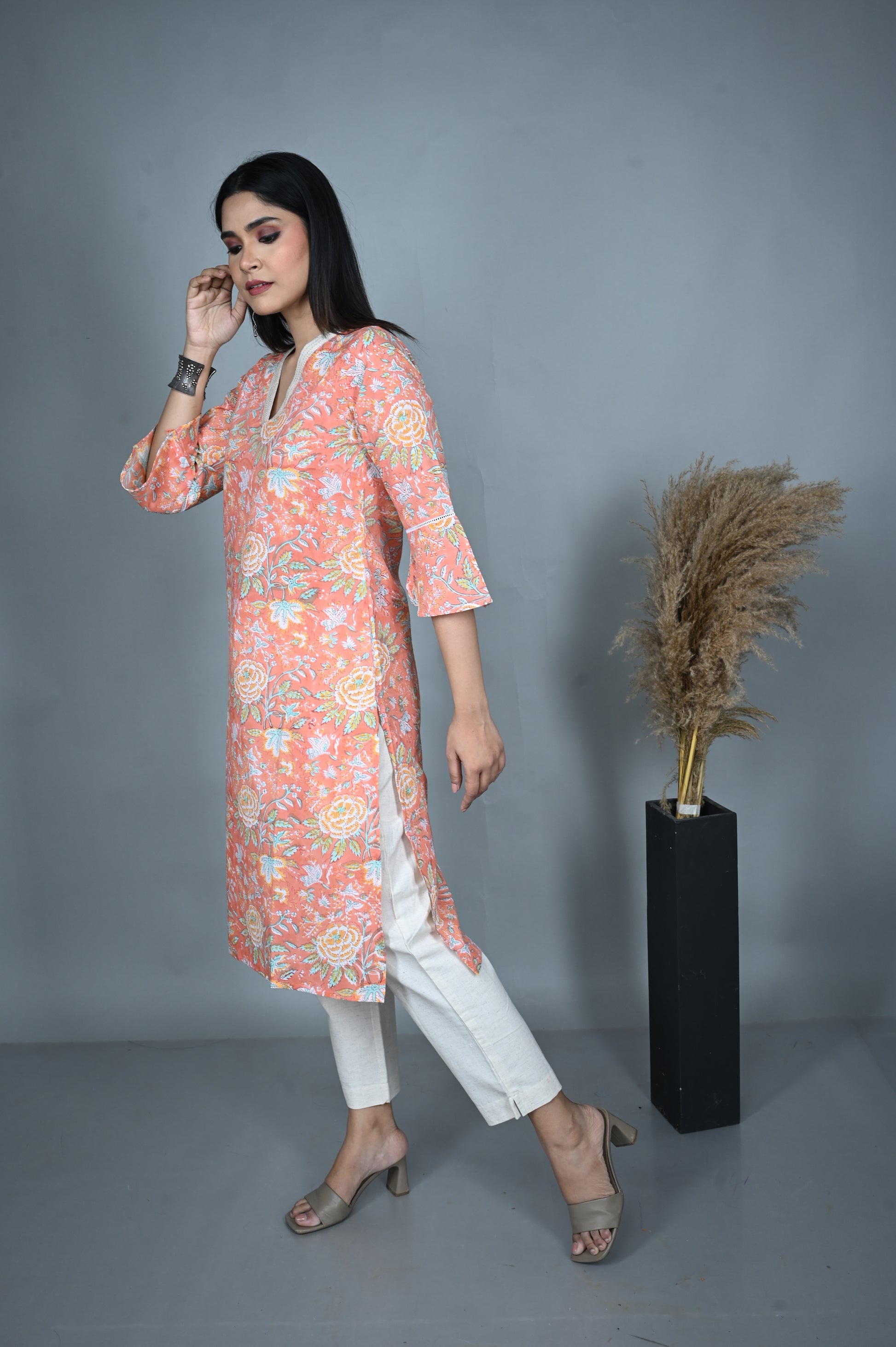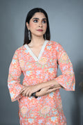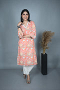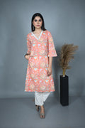 Breathe elegance into your everyday style with this 100% cotton A-line kurta in a soft pastel peach hue. Adorned with graceful floral dabu prints, it carries the timeless beauty of hand block artistry while keeping you cool and comfortable. The design features a flattering V-neckline enhanced with delicate hand embroidery, adding a subtle yet refined charm.