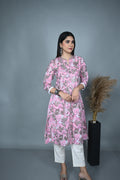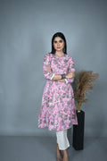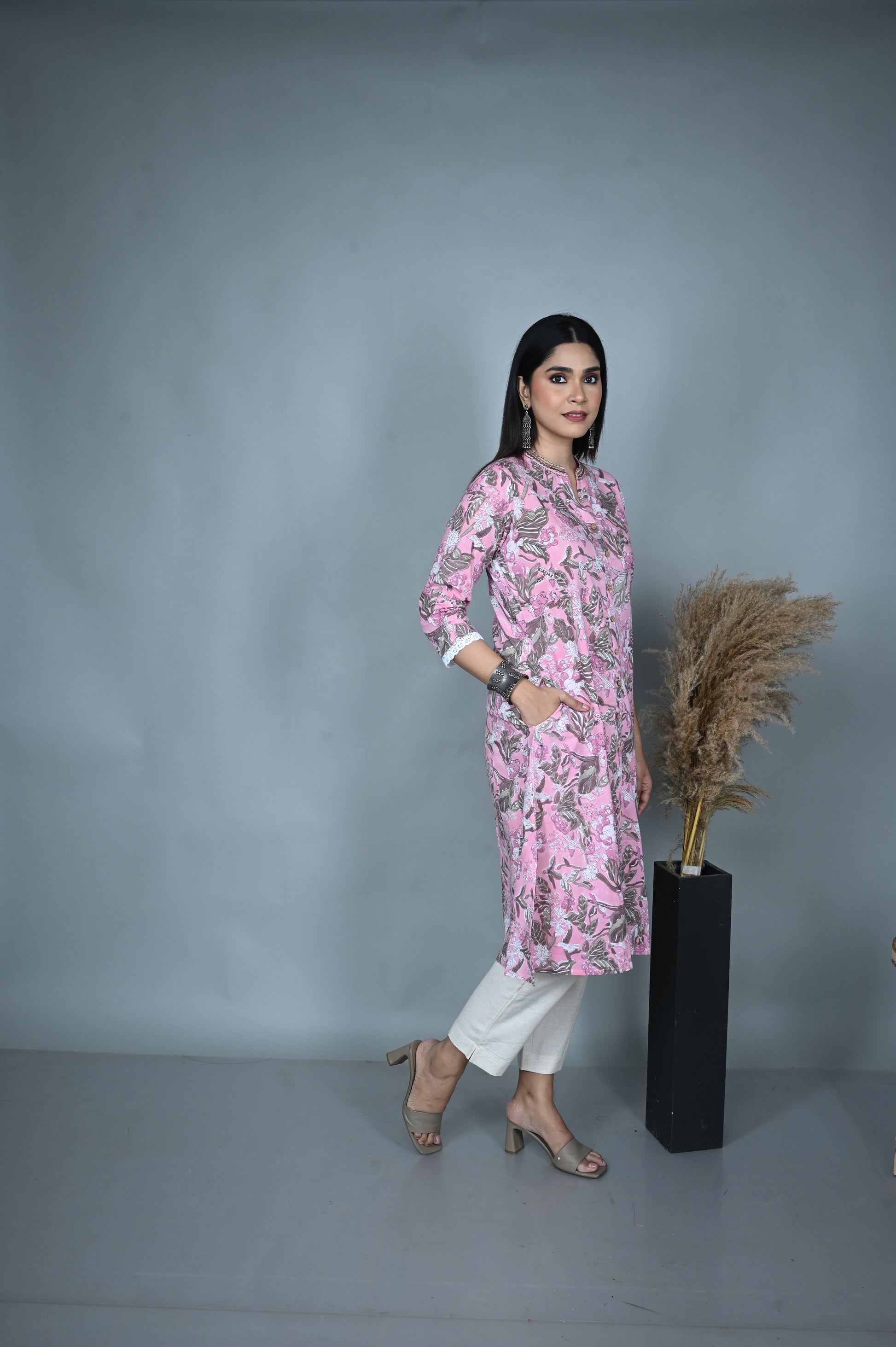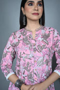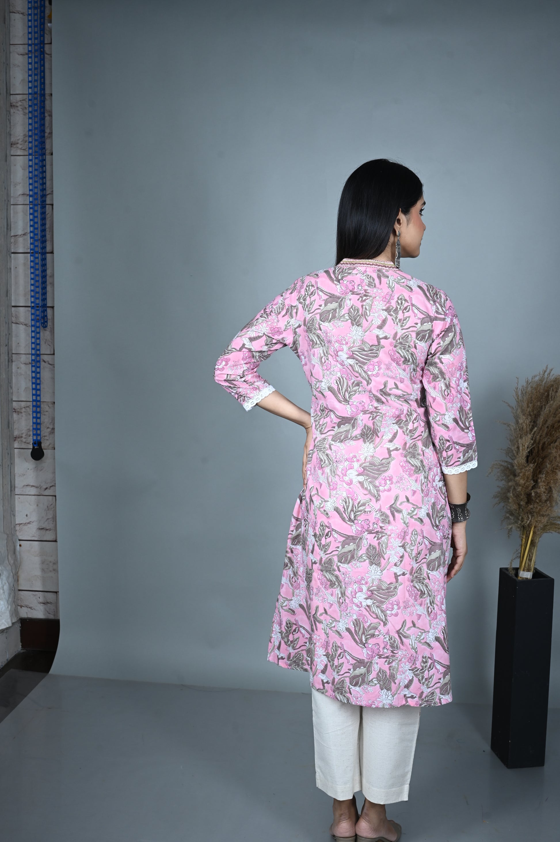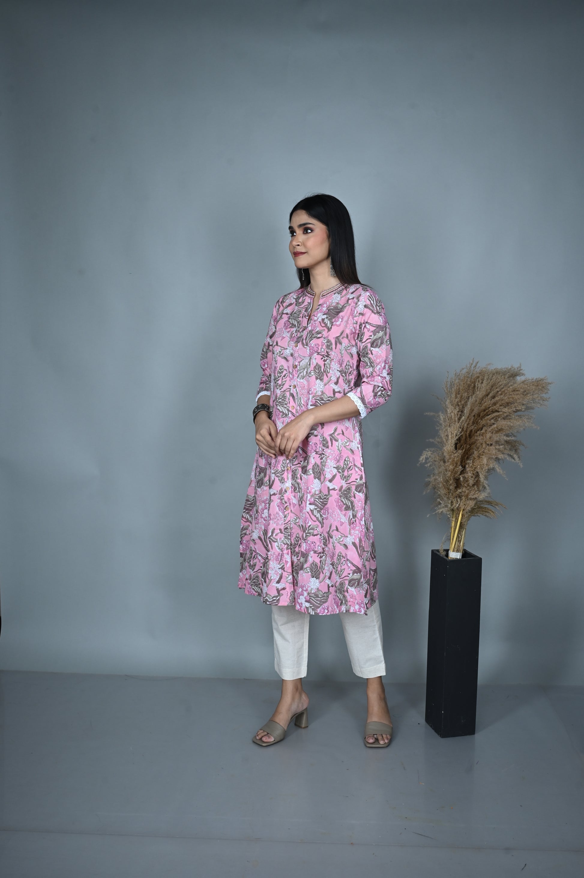 Pink Floral Block Printed A-line Kurta with Hand Embroidered Collar