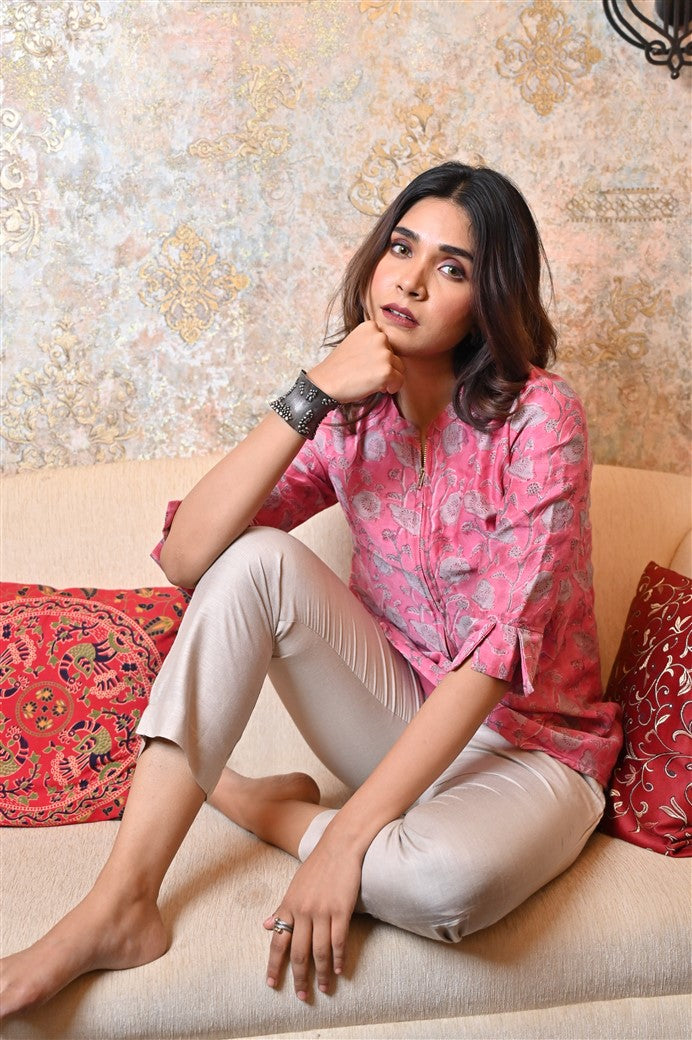 Pink Chanderi Zipper Top