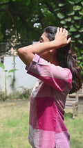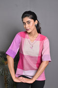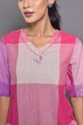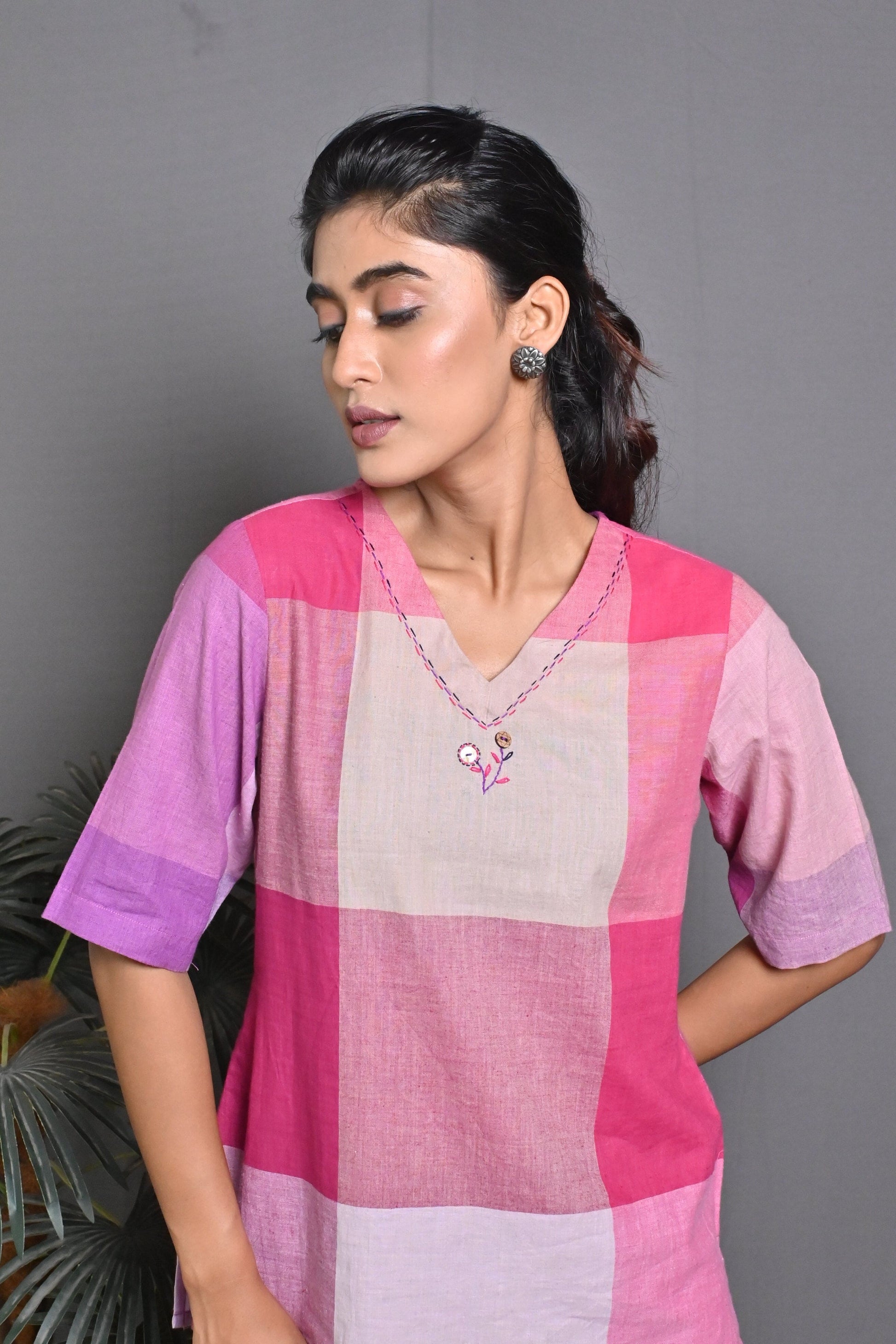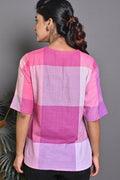 Pink-White Checks Handwoven Top with Hand Embroidery Detailing