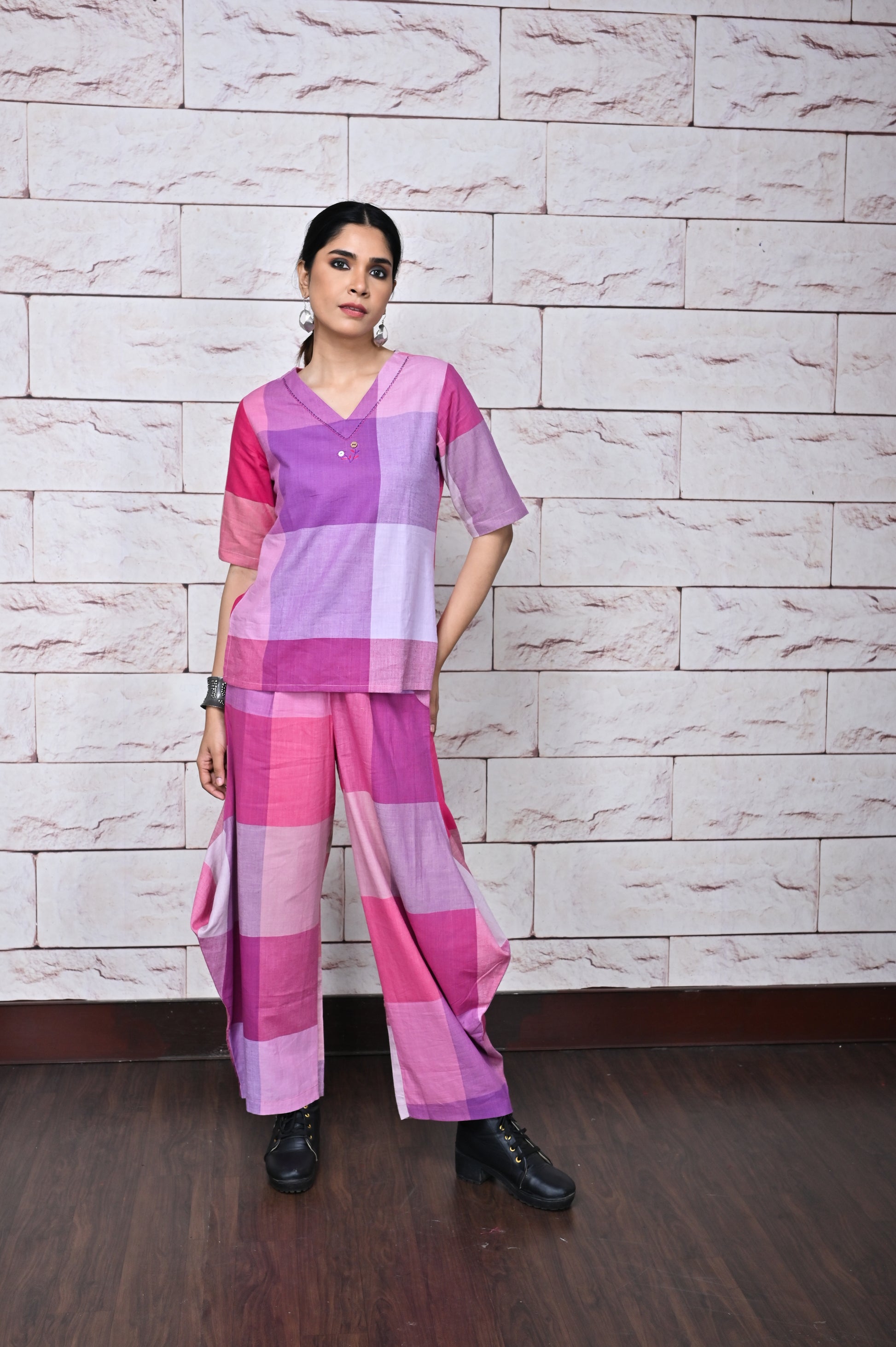 Pink-White Checks Handwoven Cowl Pants