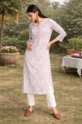 White Pink Cotton Floral Print Kurta With Hand Embroidery And Mirror Work