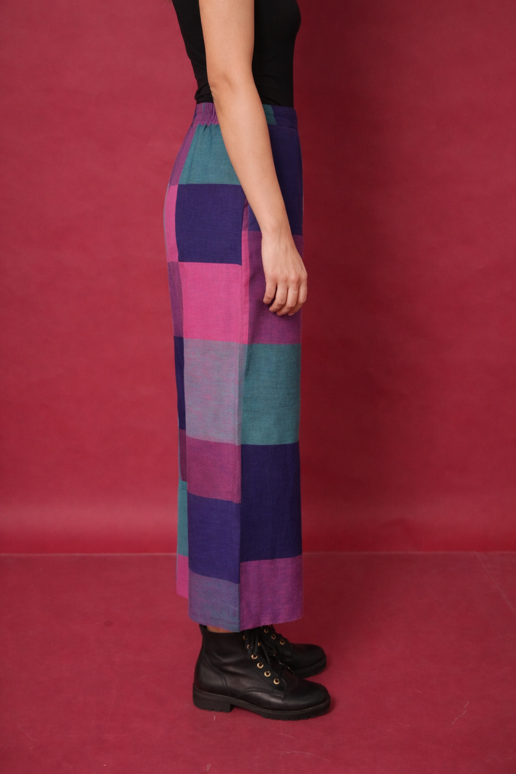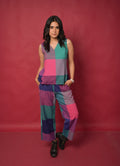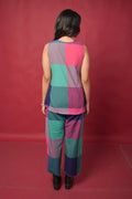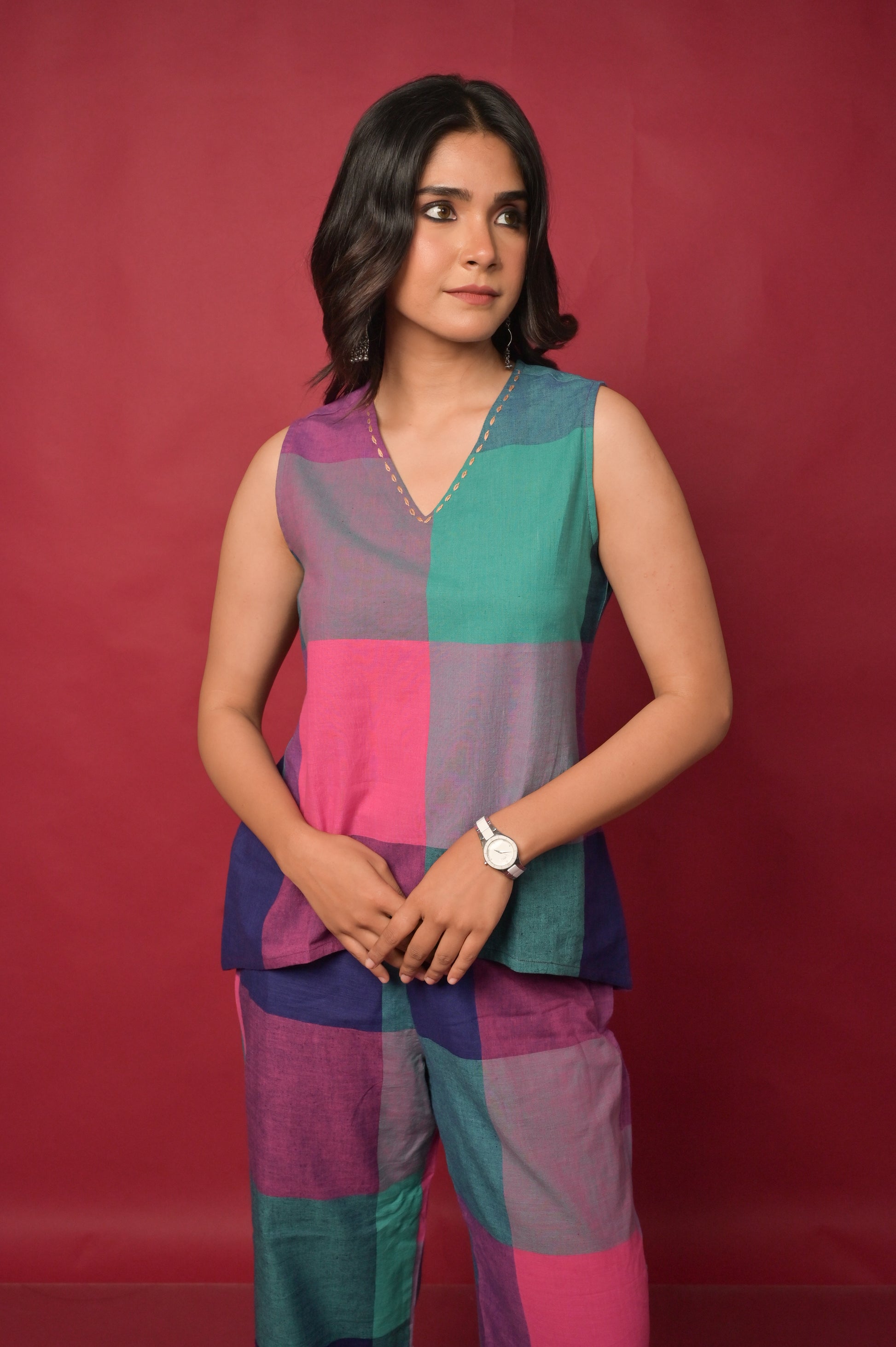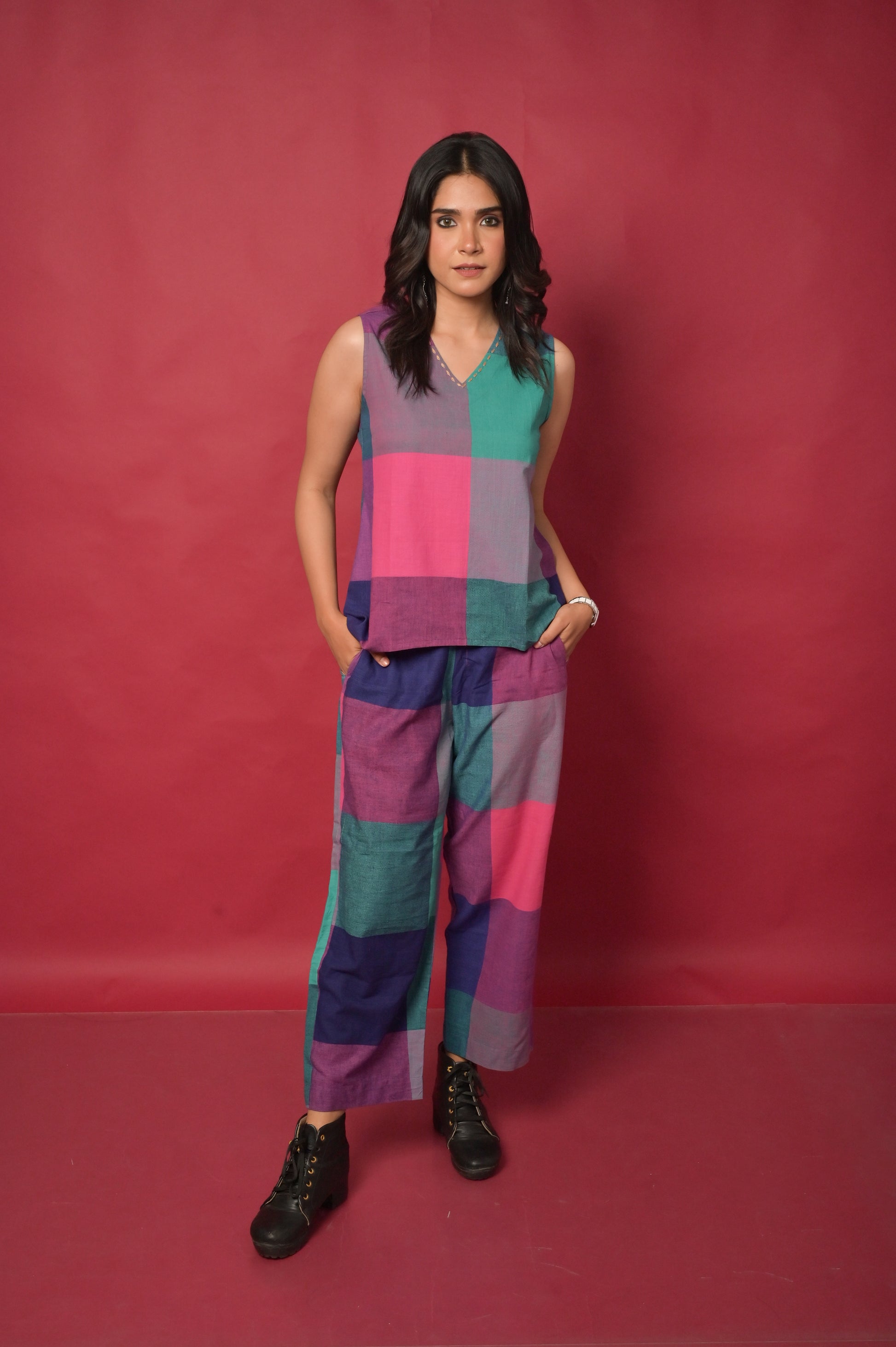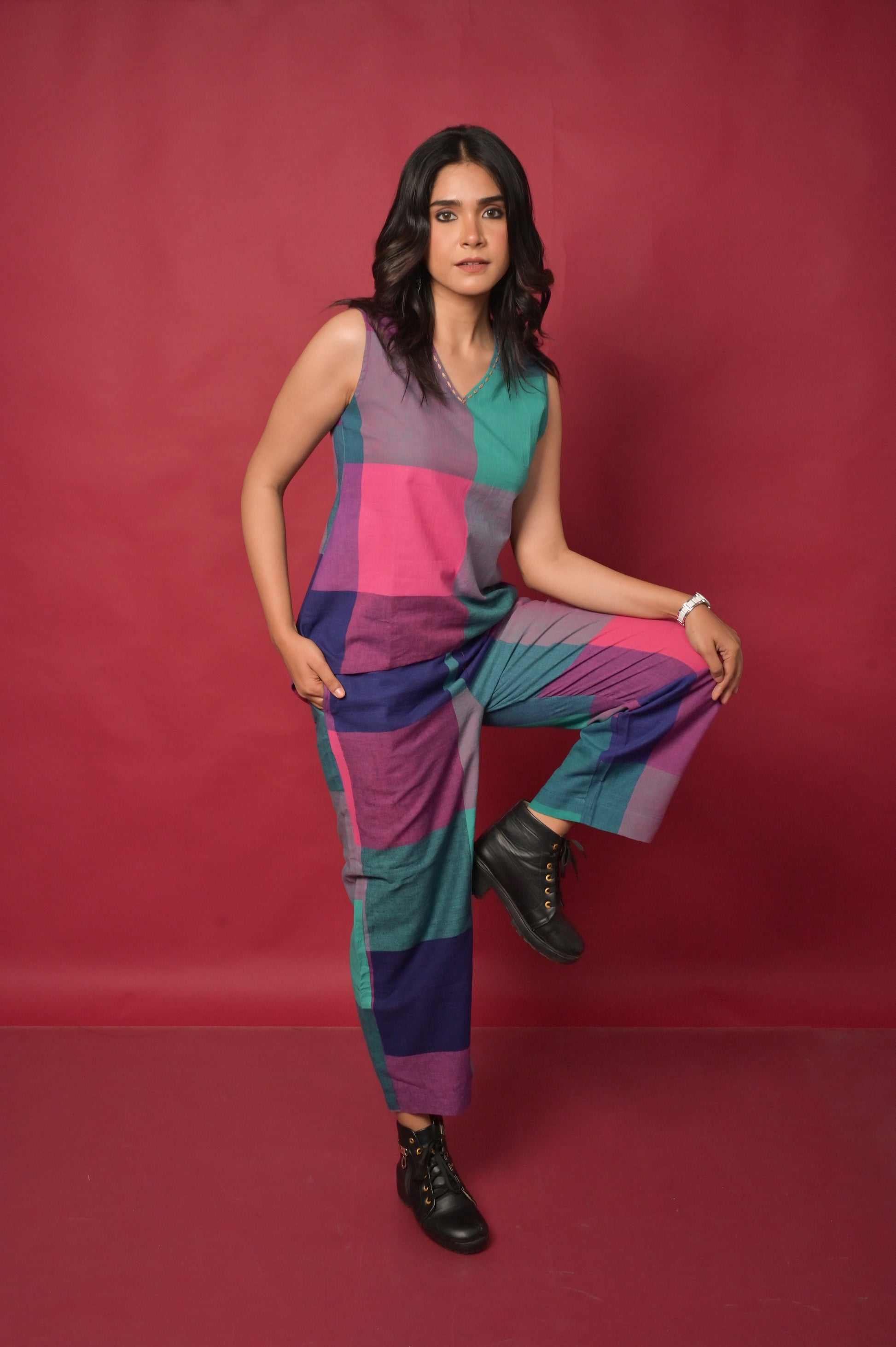 This handwoven cotton check co-ord set features a sleeveless, relaxed-fit top paired with easy straight pants. Crafted in breathable cotton with soft, multicolour checks, the set offers comfort, movement, and a modern handcrafted feel. Designed for warm days, travel, and everyday wear, it’s a versatile ensemble that balances ease with quiet statement dressing.