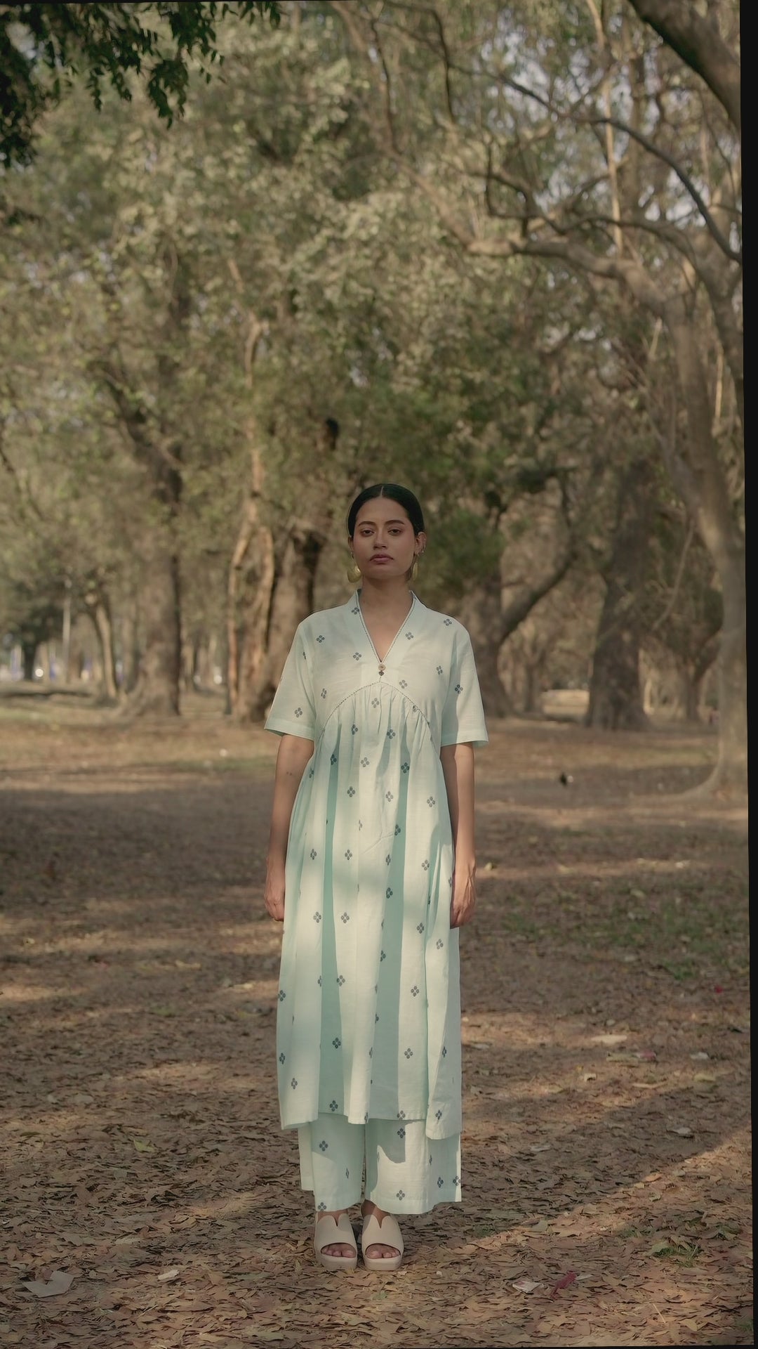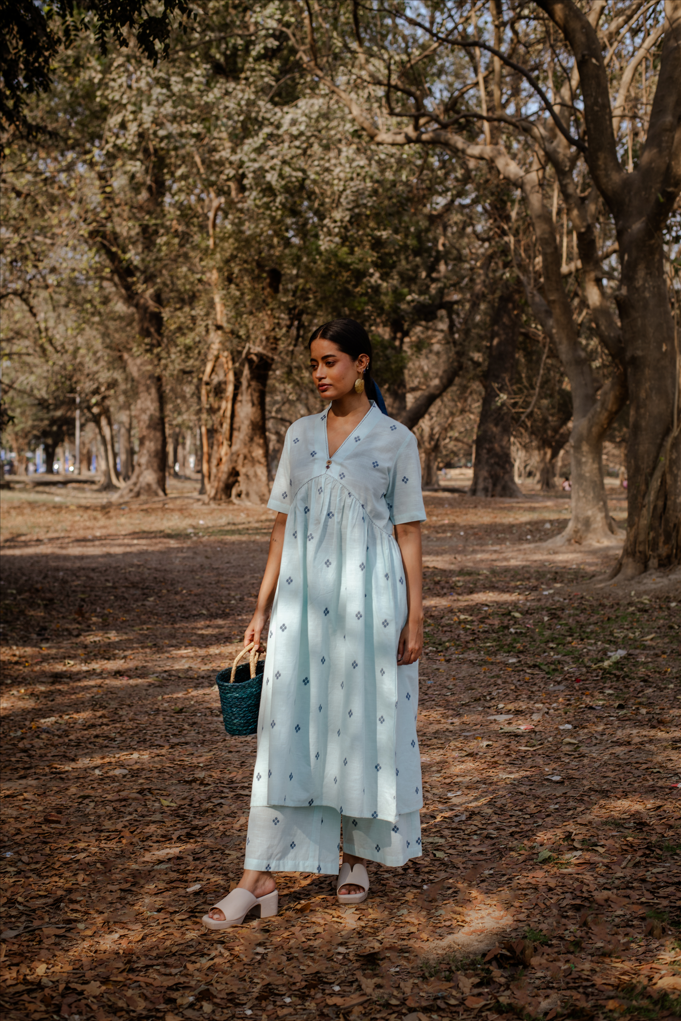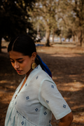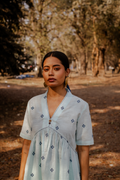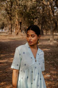 Crafted in breathable 100% cotton, this powder blue cotton woven buti kurta set for women blends handcrafted detail with an easy, modern silhouette. The powder blue cotton kurta features delicate woven buti motifs scattered across the fabric, adding subtle texture and artisanal charm. Designed with a soft V-neckline, short sleeves, and gentle gathers that create a relaxed cotton A-line kurta silhouette, it pairs effortlessly with matching powder blue cotton pants. Comfortable, minimal, and versatile, this pure cotton kurta set for women offers everyday ease while staying rooted in craft and understated elegance.