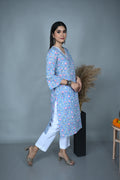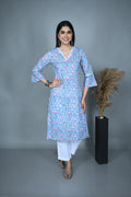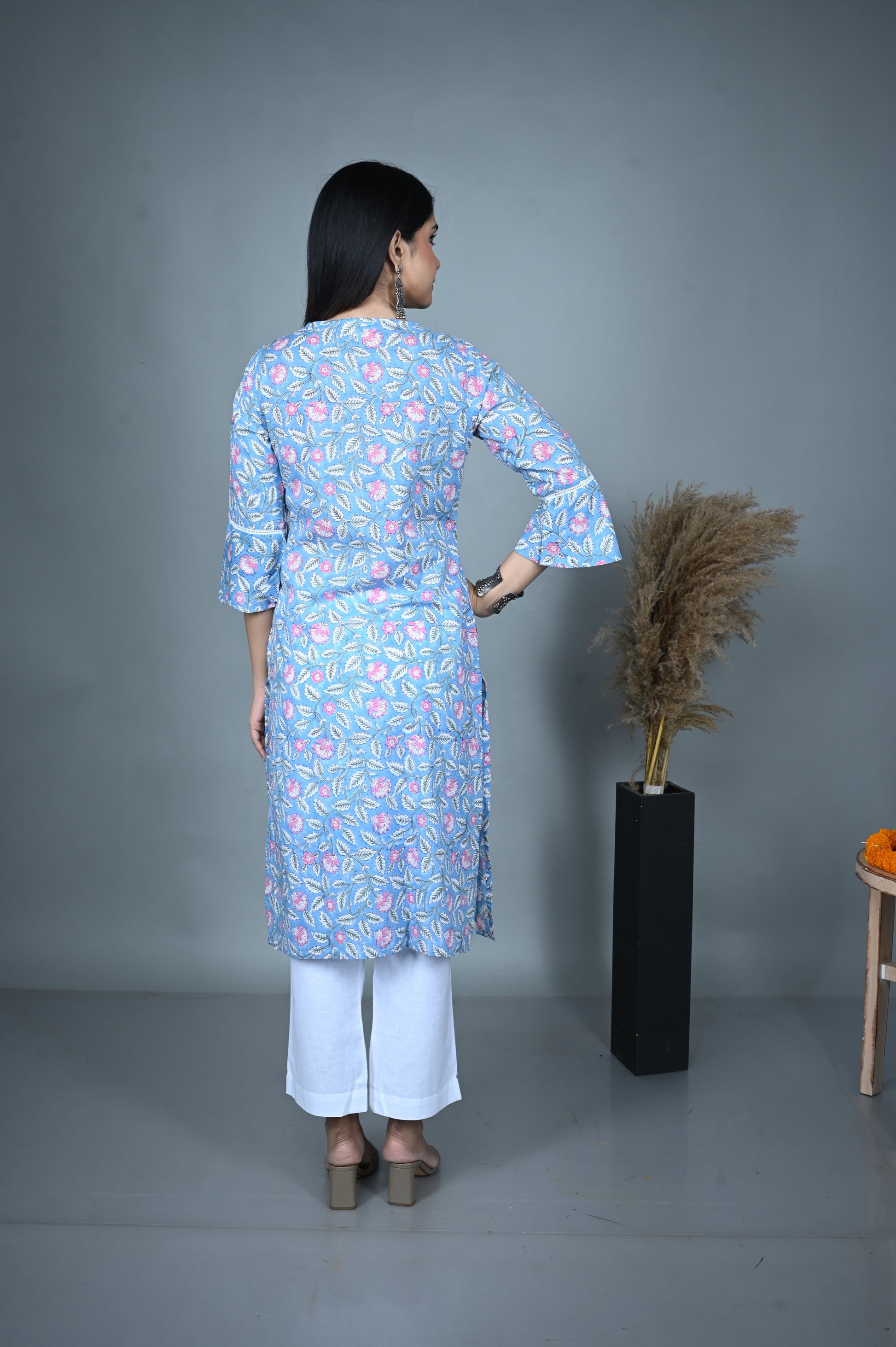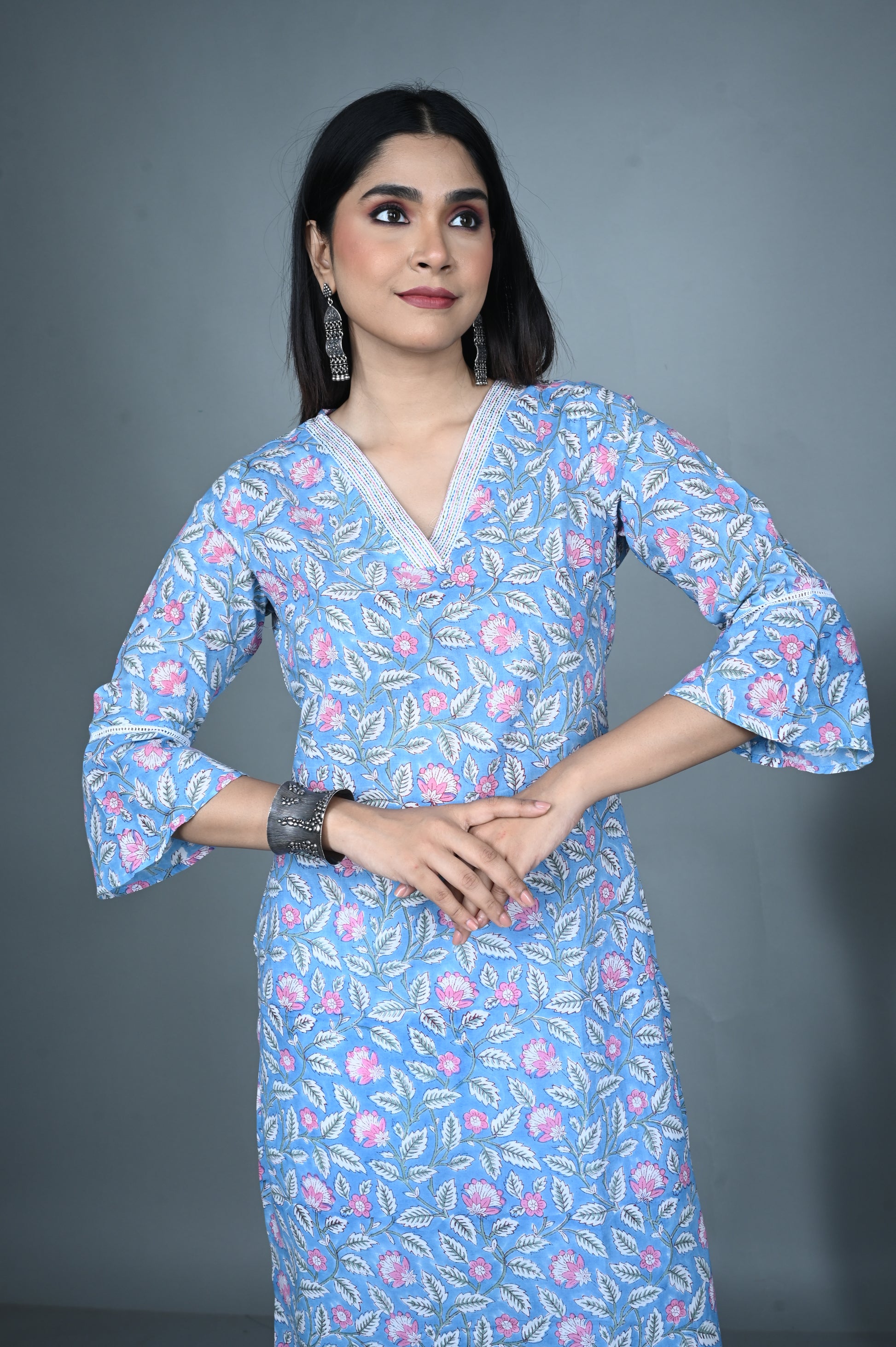 Crafted from pure 100% cotton, this kurta is crafted using hand block printing, bringing together heritage and comfort in one piece. Set against a serene sky blue base, it features delicate floral motifs in soft pink and leafy accents, creating a refreshing and graceful look. The kurta comes with a flattering V-neckline highlighted with fine thread detailing and three-quarter flared sleeves, adding a feminine and elegant touch.