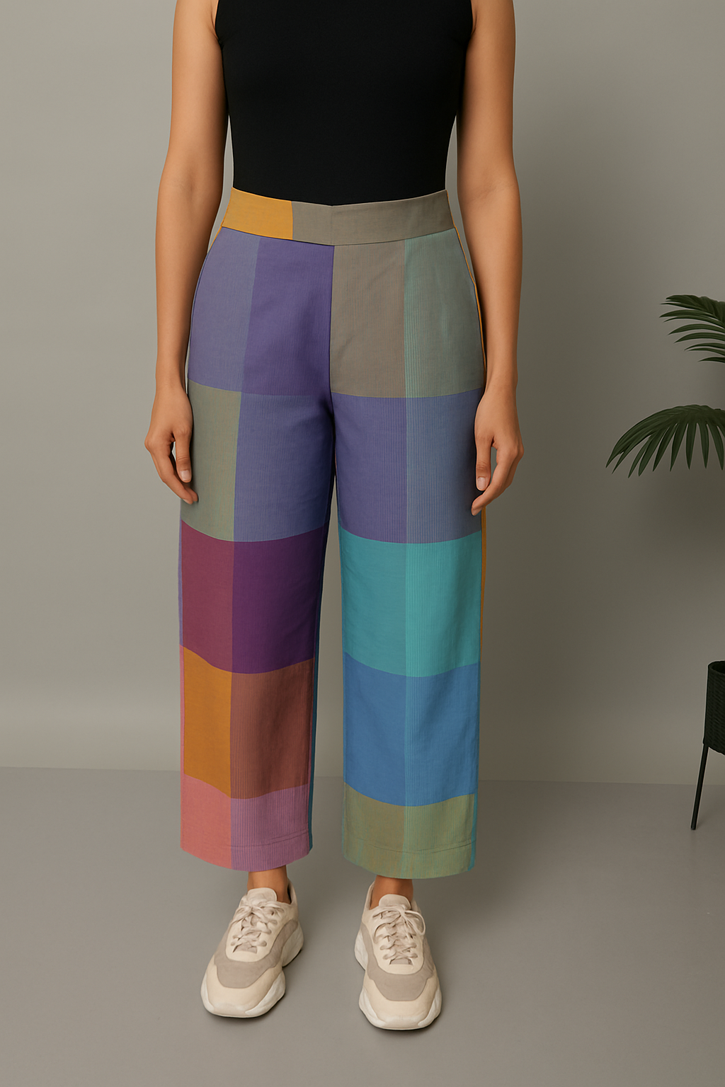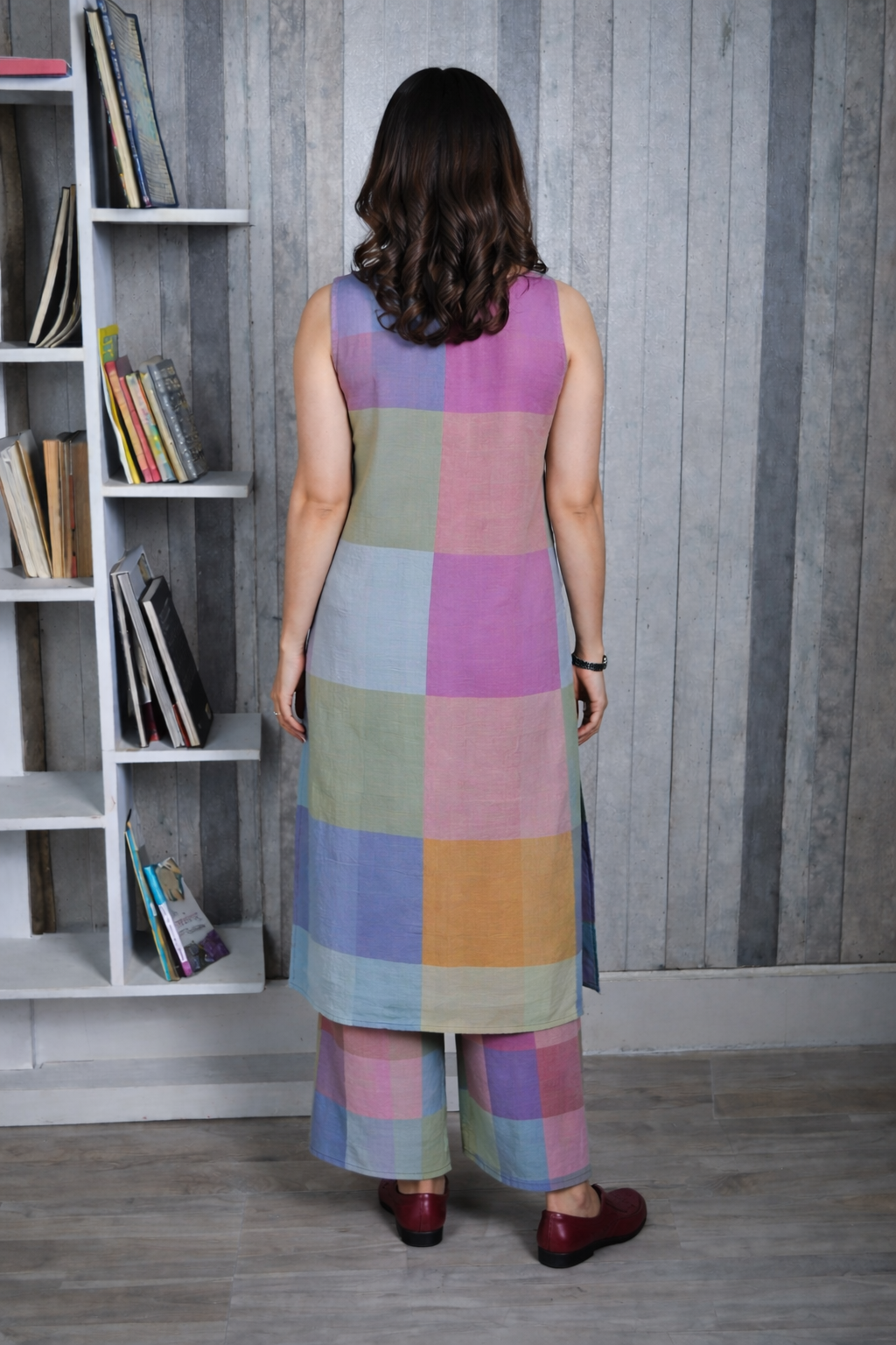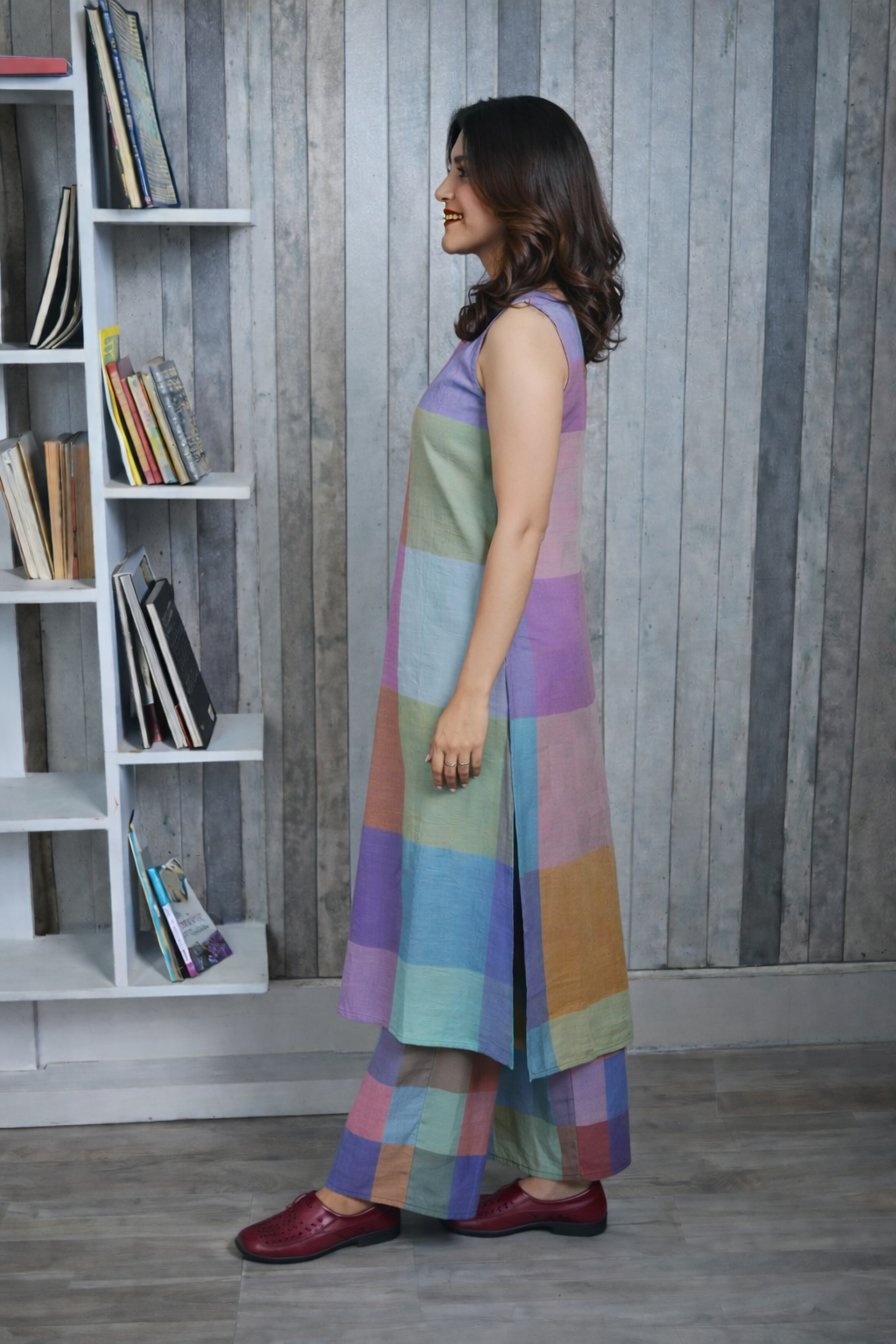 Crafted in breathable handloom cotton, this purple-blue pastel checks kurta set features a halter neck kurta paired with matching flared pants. The soft checks create a coordinated yet easygoing look that feels light, comfortable, and versatile through the day. Wear the pieces together for a balanced ensemble or style them separately for multiple everyday outfits—ideal for relaxed outings, travel, and casual gatherings with effortless ease.