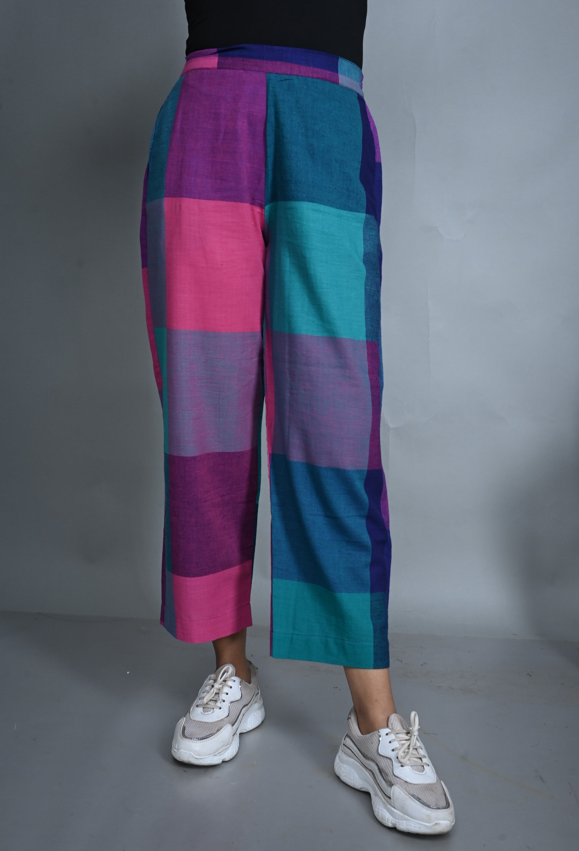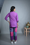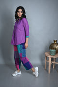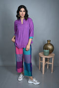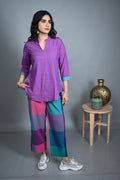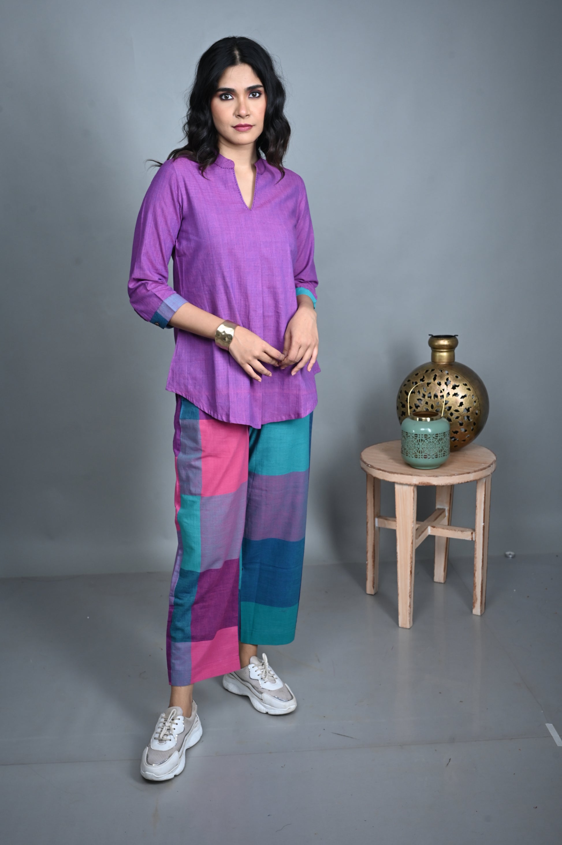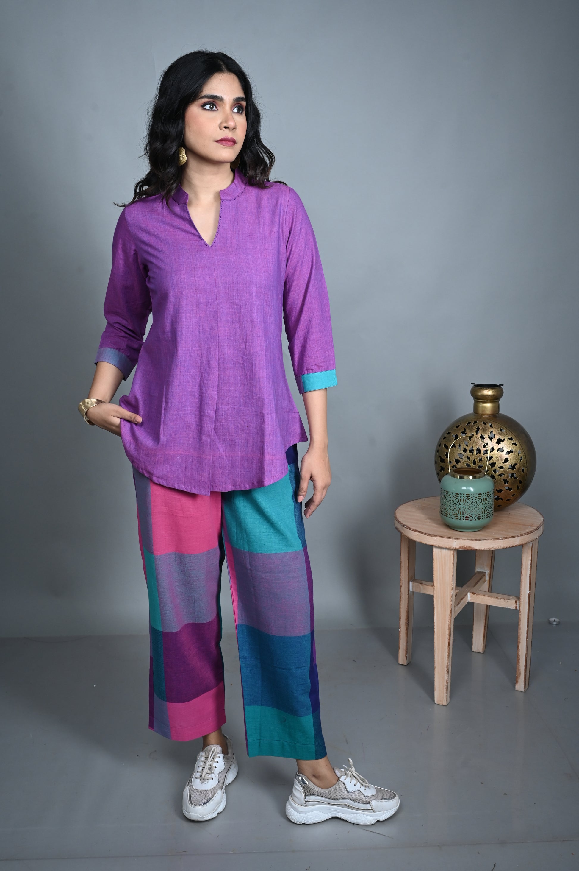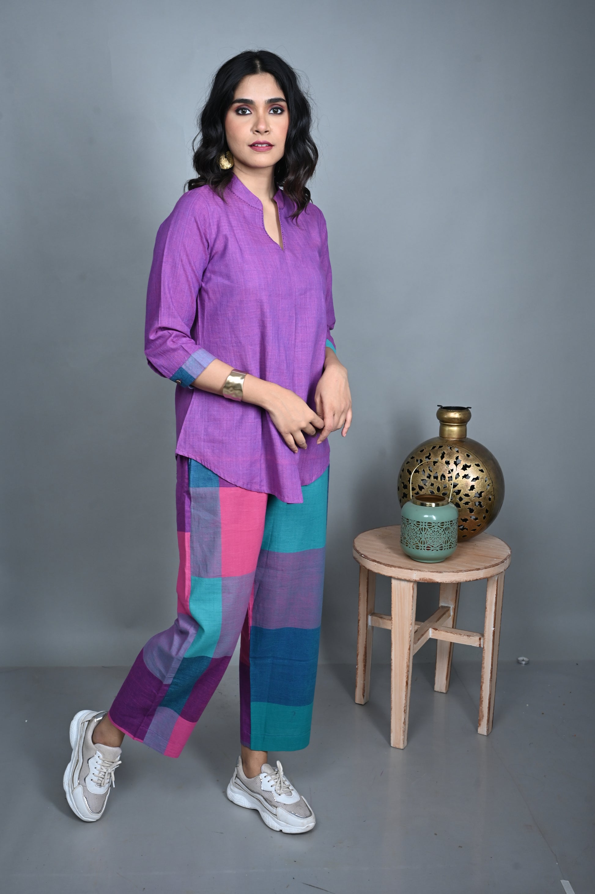 Purple Handwoven Front-Pleat Top with Pink-Purple Check Pants Co-ord Set (set of 2)