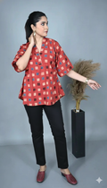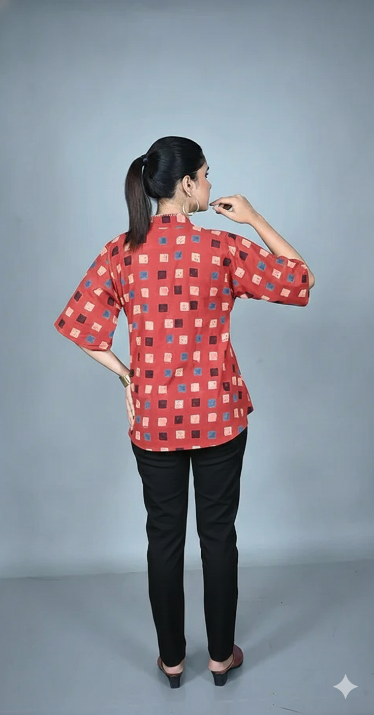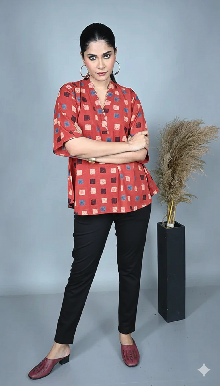 This vibrant red antifit top is adorned with traditional Ajrakh block prints, bringing artisanal charm to a contemporary silhouette. Crafted for comfort and effortless style, its relaxed fit and breathable fabric make it perfect for everyday wear, while the intricate geometric motifs add a touch of heritage elegance. Pair it with your favorite jeans or palazzo pants for a look that effortlessly blends tradition with modernity.