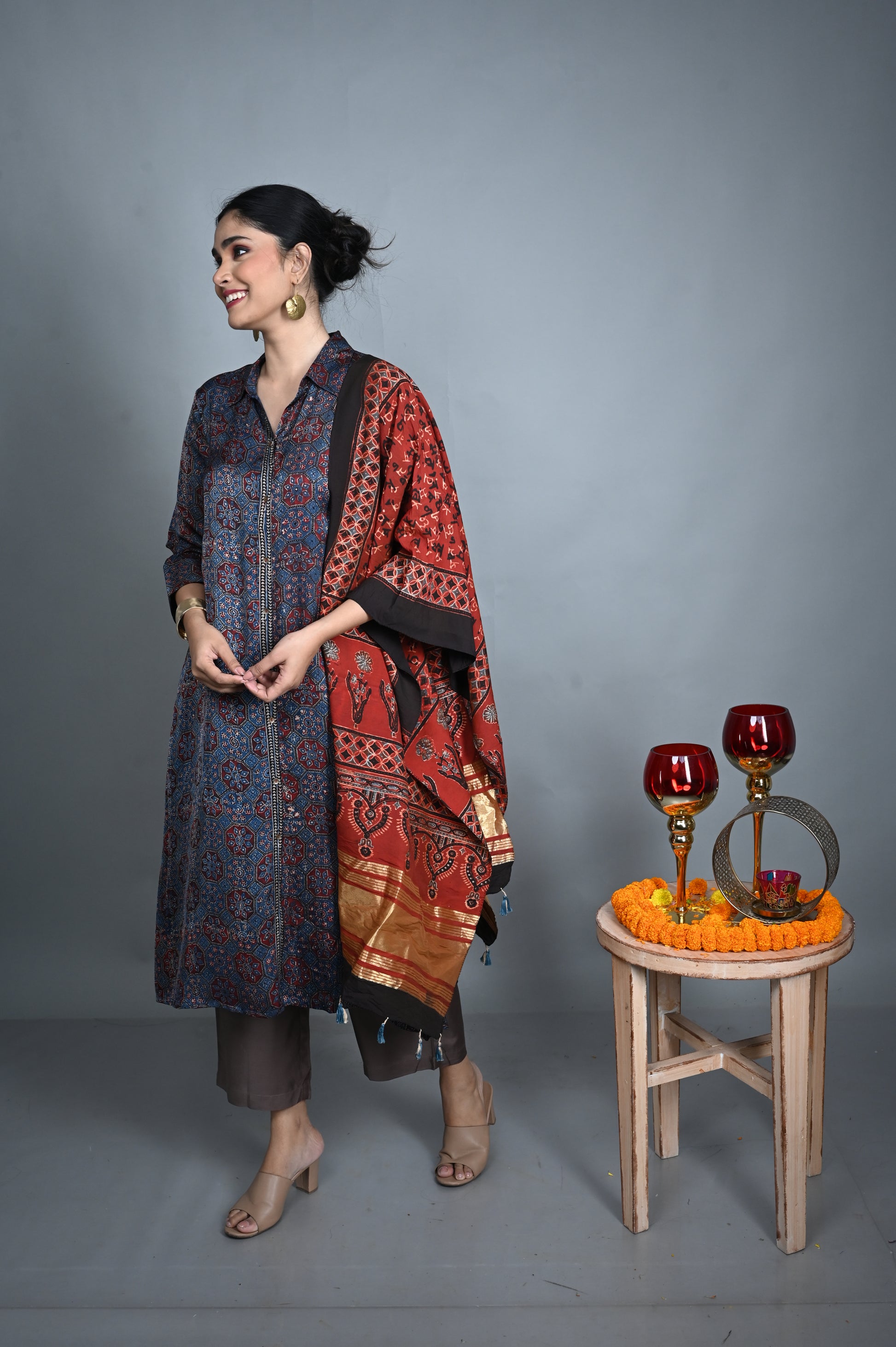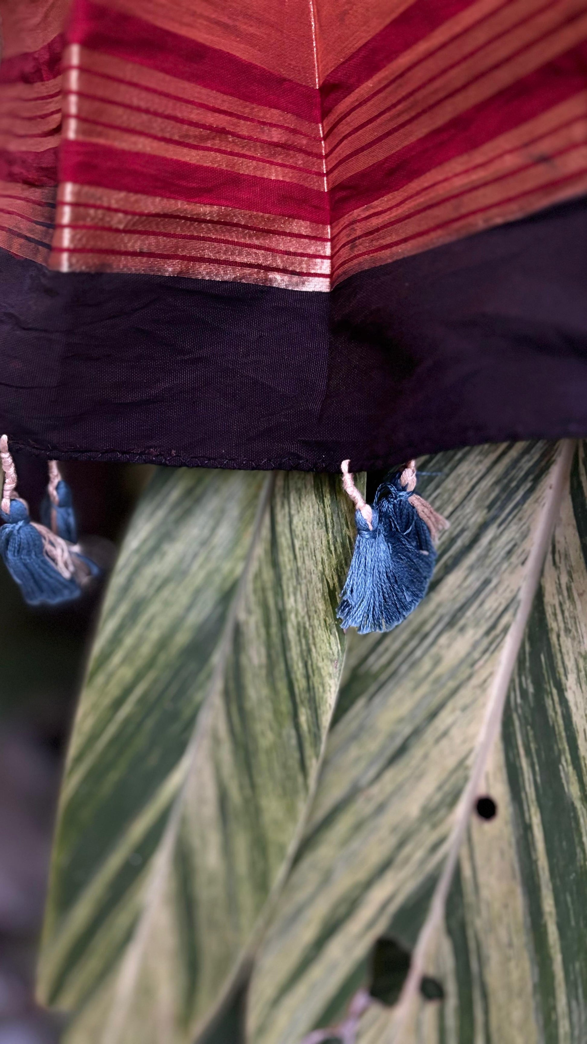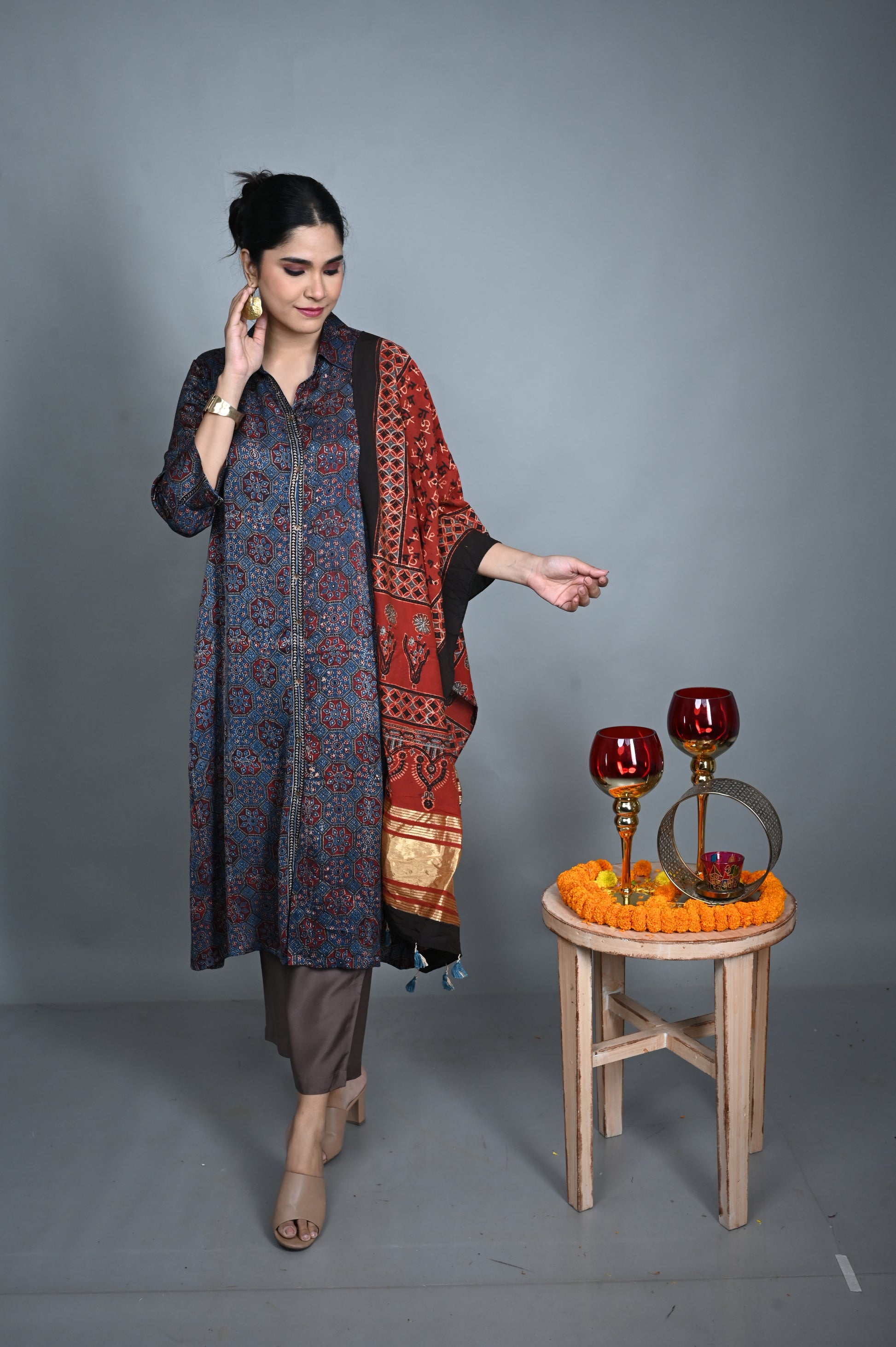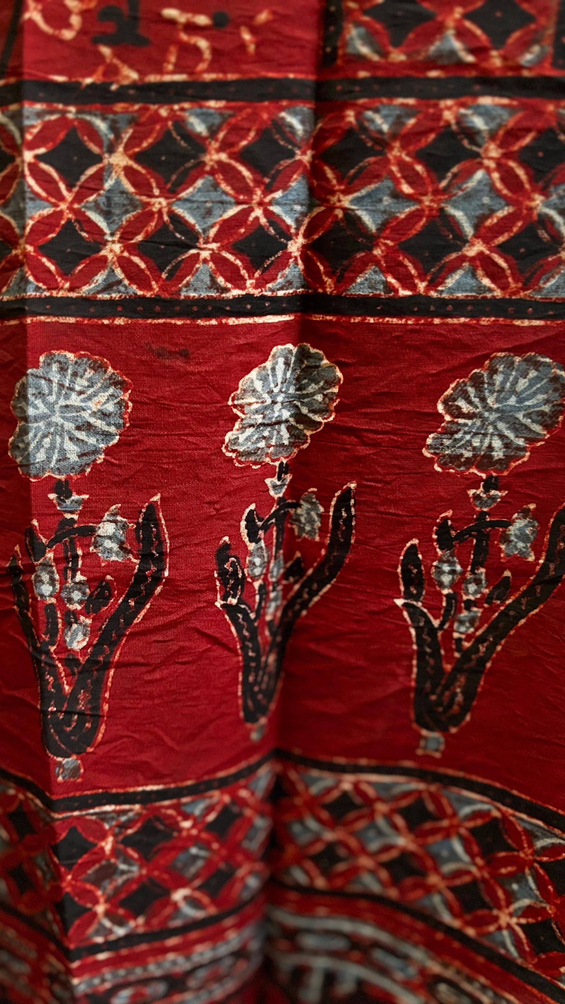 This red ajrakh cotton stole blends traditional craftsmanship with understated elegance. Accented with delicate chanderi silk along the borders, it brings a refined artisanal touch to any kurta. Lightweight and versatile, it’s perfect for both festive occasions and everyday styling