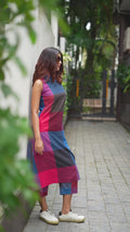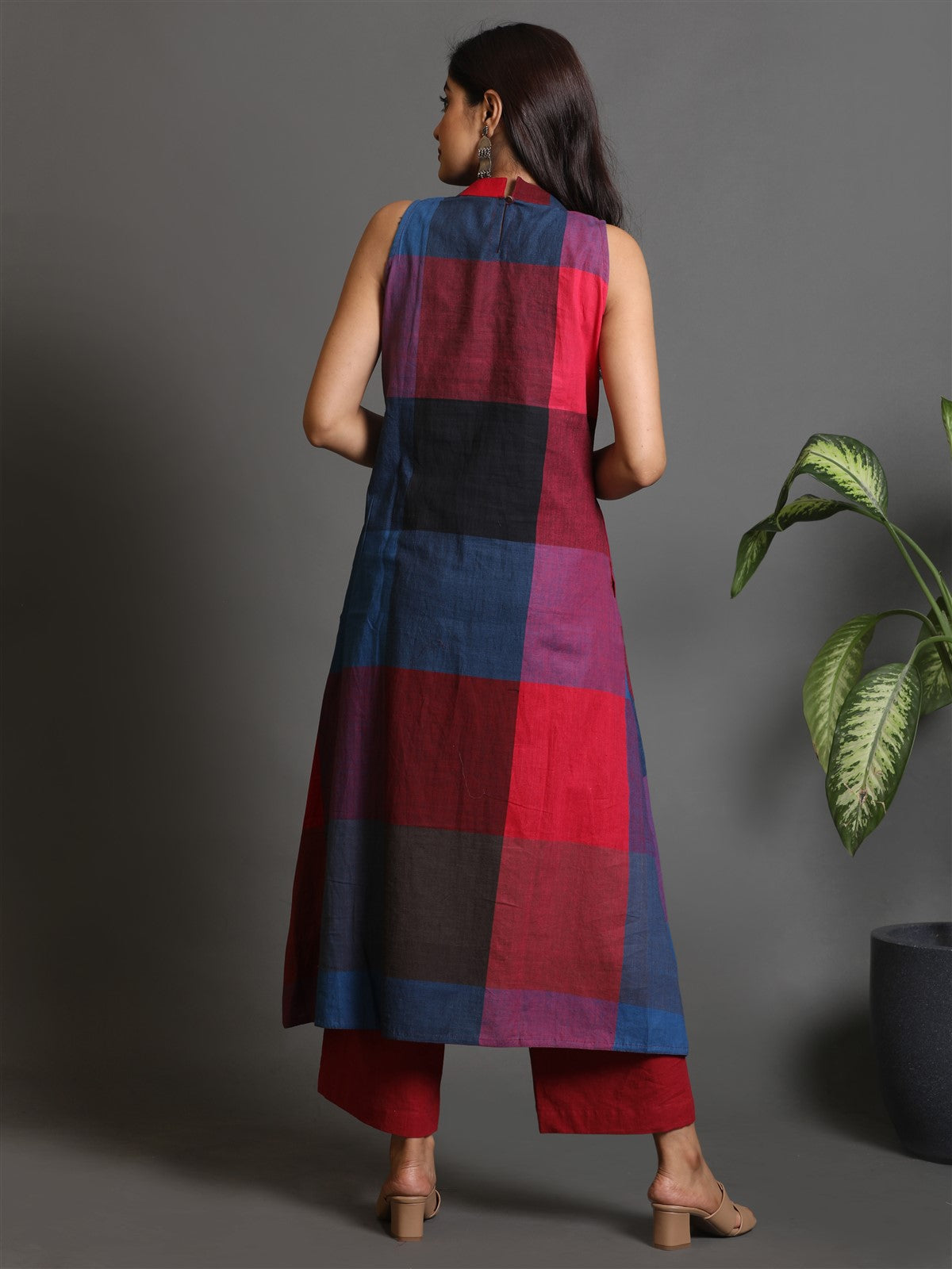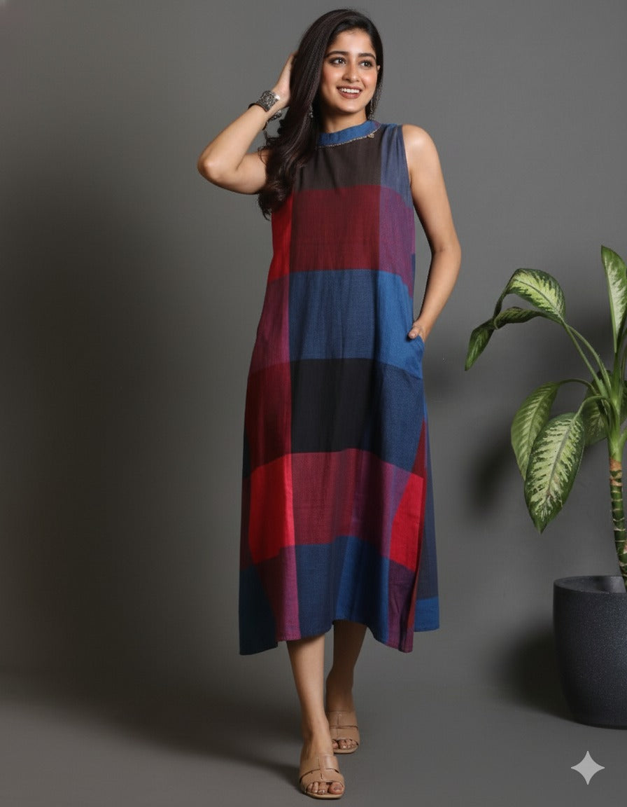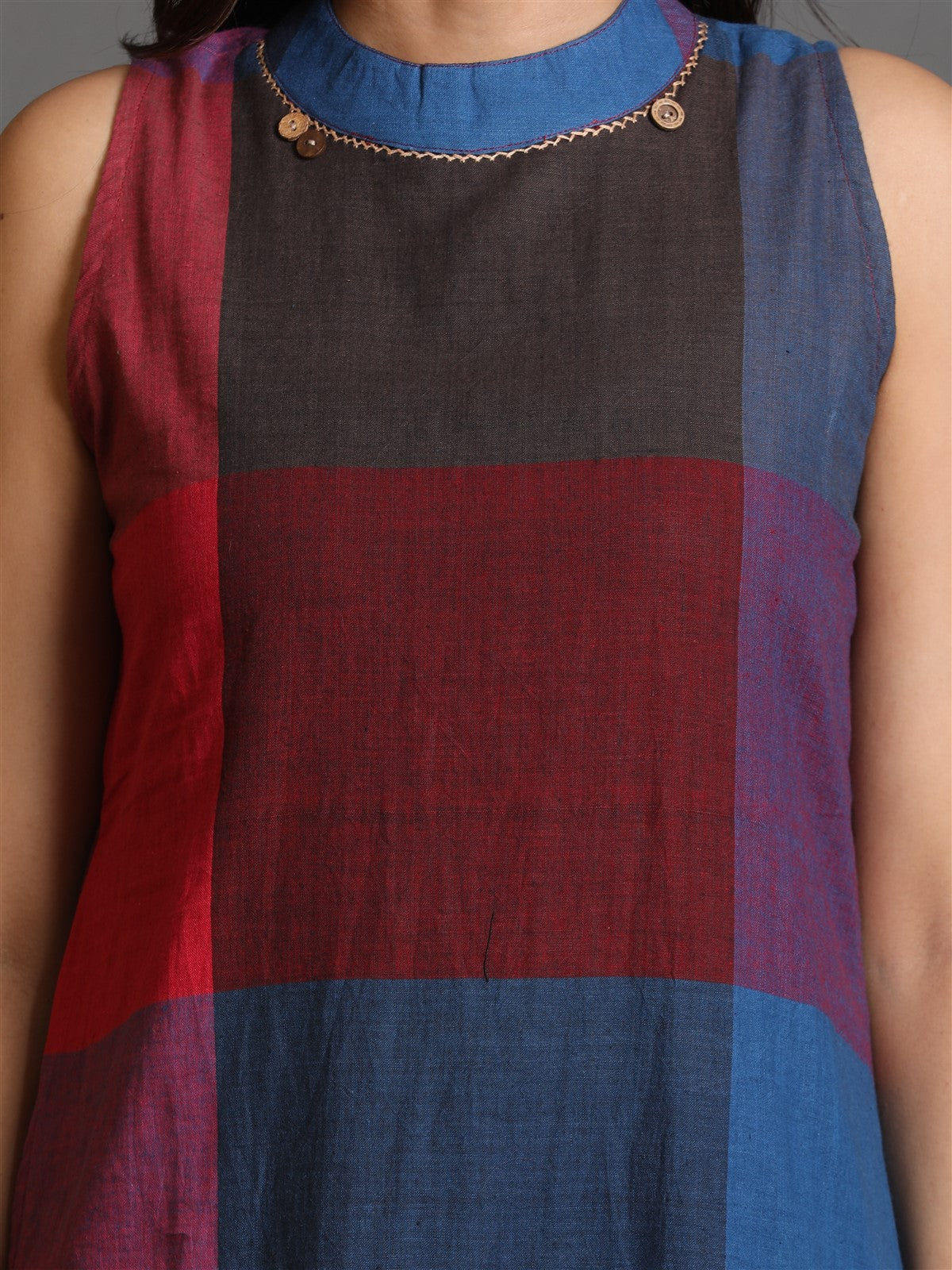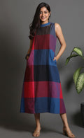Red-Blue Checks Handwoven Long Halter Neck Dress with Hand Embroidery detailing