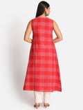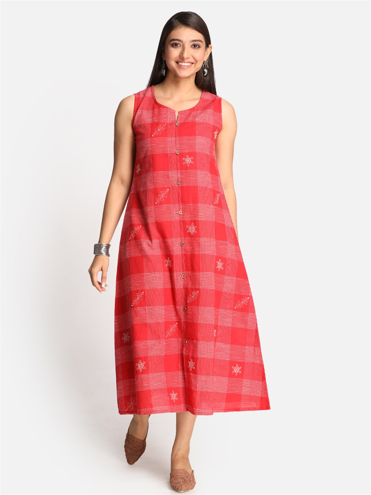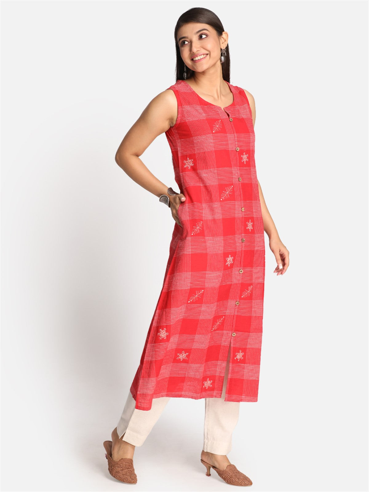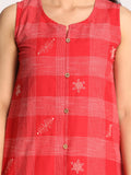 Red Checks A Line Sleeveless Kurta with Hand Embroidery Detailing