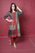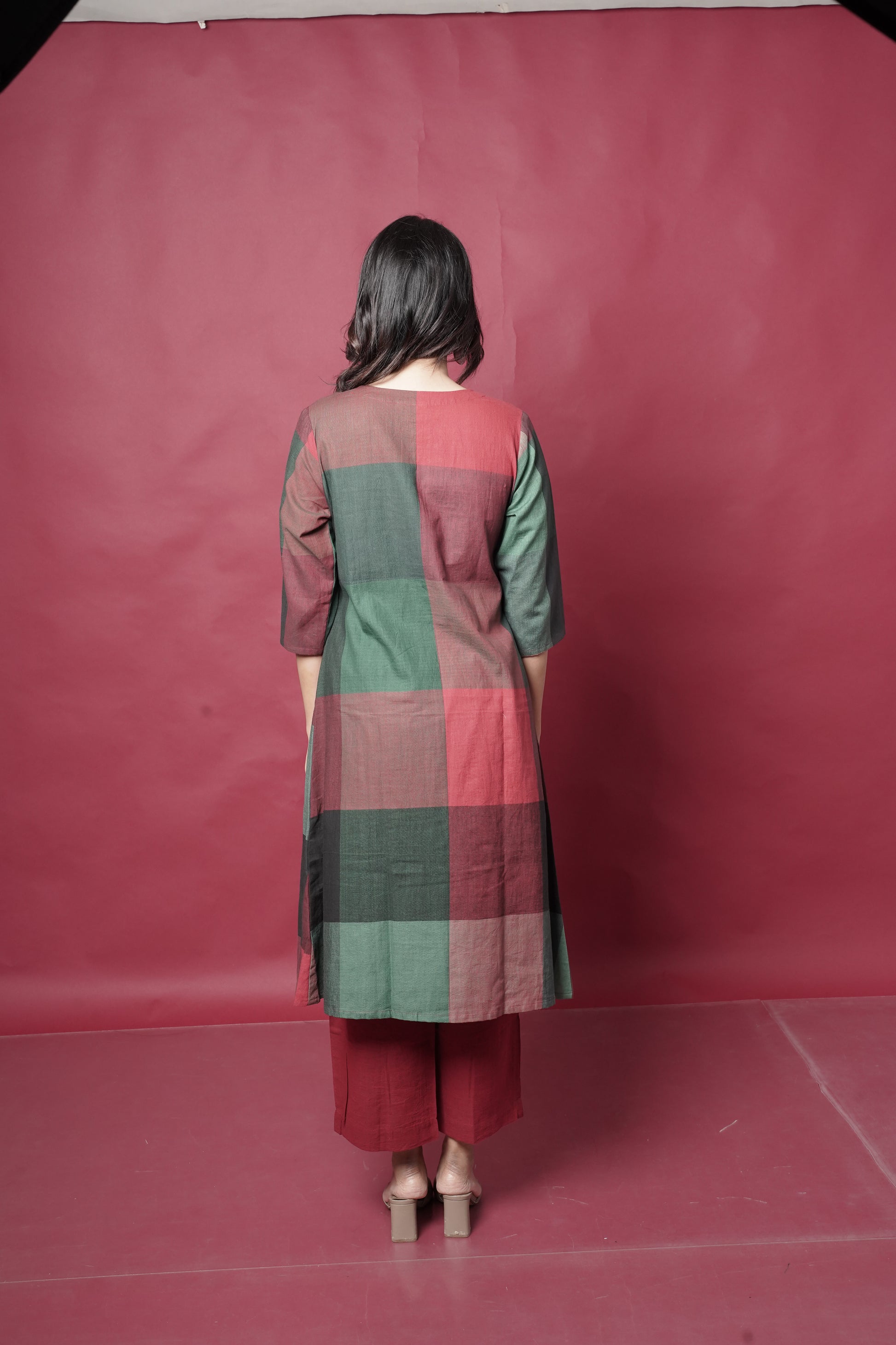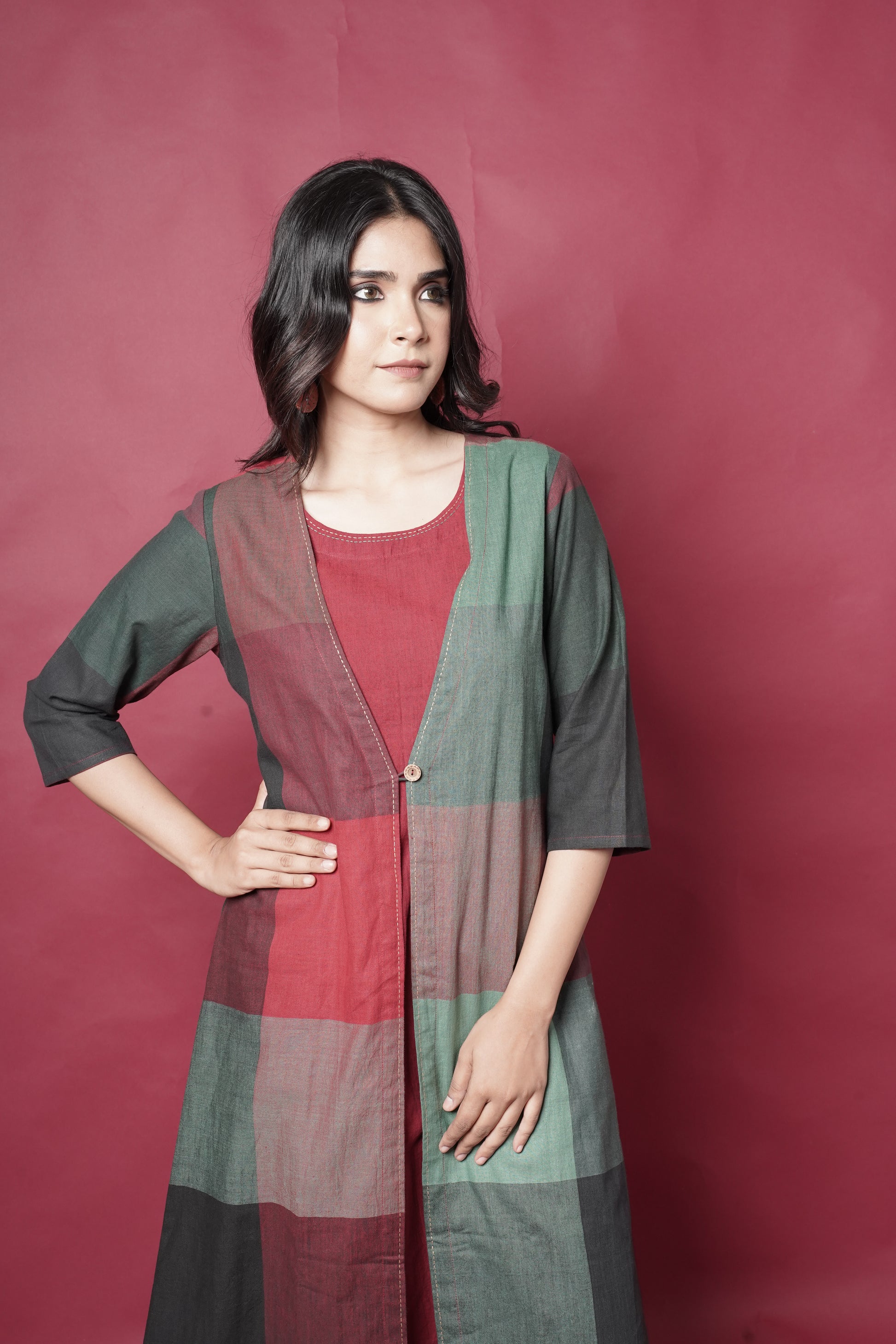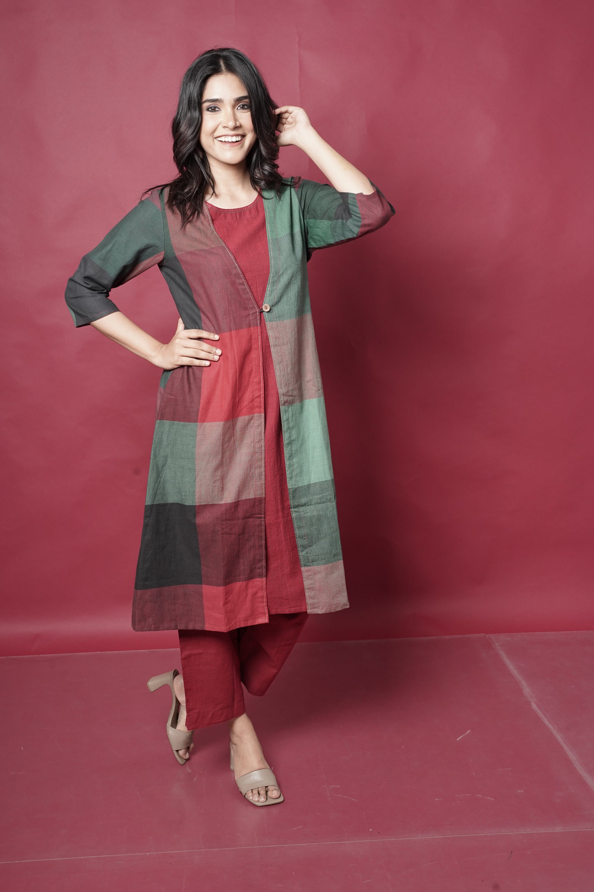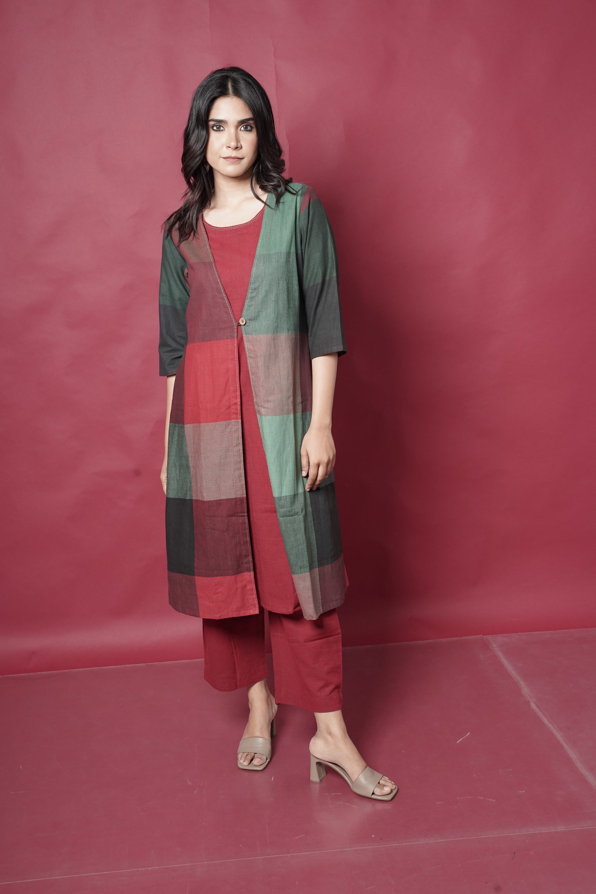 Red-Green Checks Handwoven Layered Jacket Dress with Red Flare Pants Co-ord Set (set of 2)
