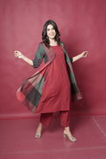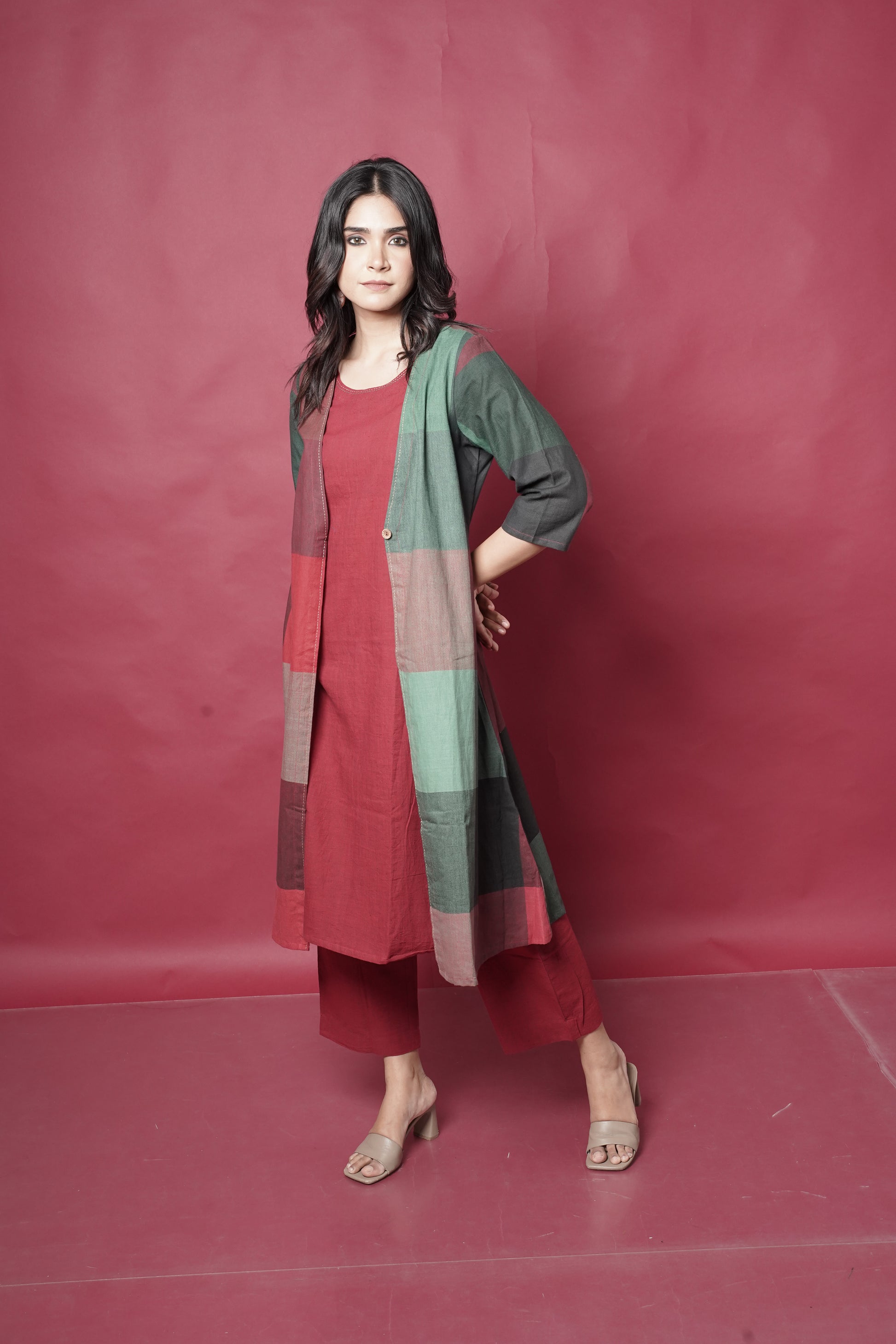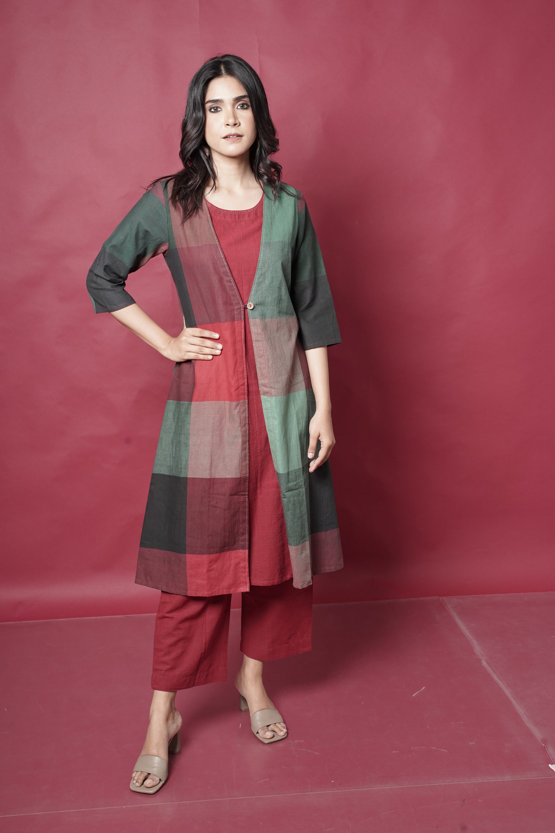 A contemporary take on heritage weaving, this jacket styled kurta is crafted in rich handwoven checks of red and green, bringing artisanal texture and timeless charm. Paired with solid red handwoven pants, the ensemble strikes the perfect balance of comfort and sophistication. The layered jacket style adds a modern edge while staying rooted in traditional craft — making it an ideal choice for festive gatherings or elegant everyday dressing.
