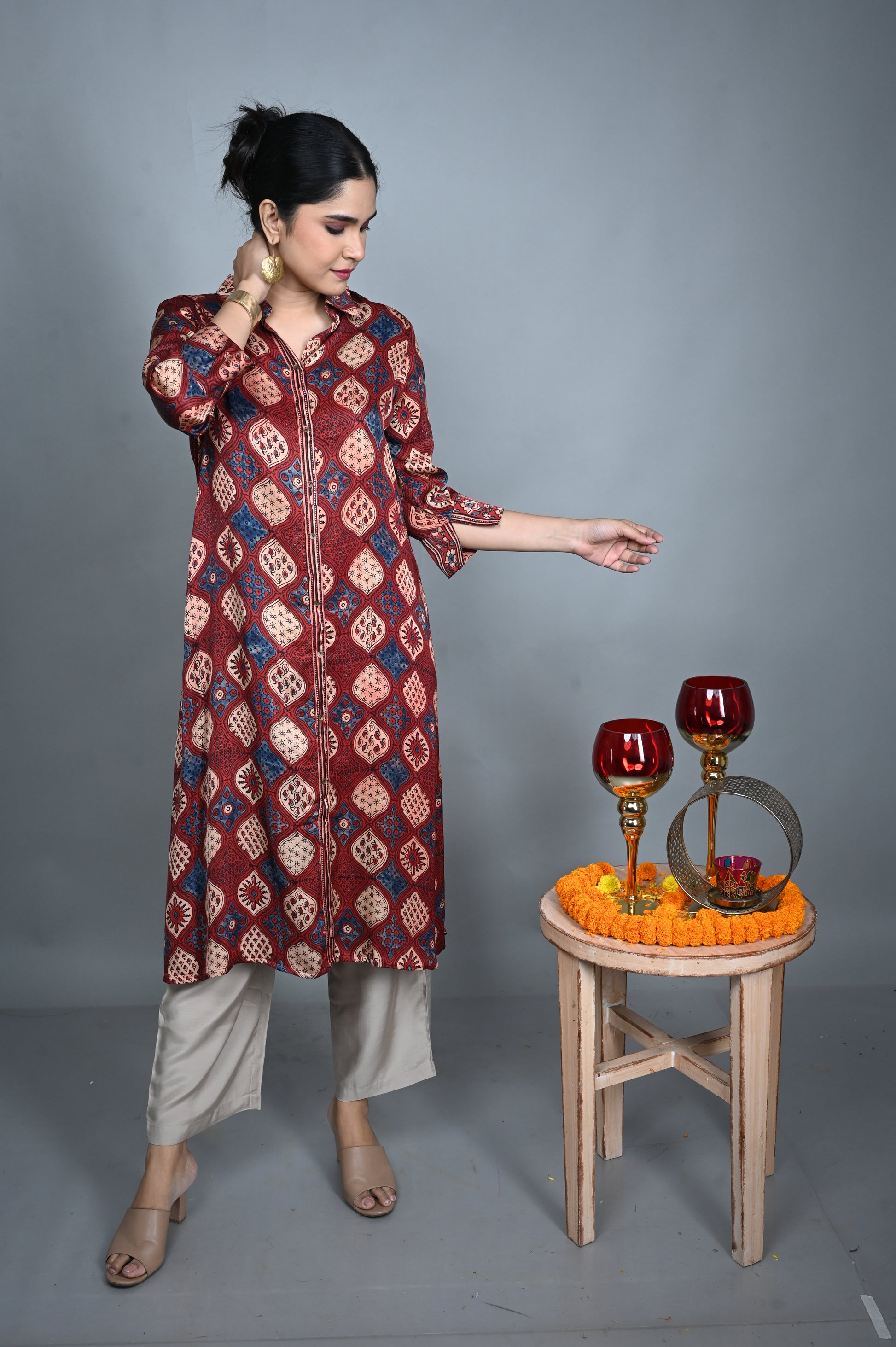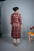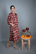 Crafted from smooth modal silk, this red dress features a structured shirt collar and exquisite intricate motif detailing throughout, adding artisanal charm to a contemporary silhouette. Lightweight and elegant, it’s perfect for festive occasions or sophisticated everyday wear.