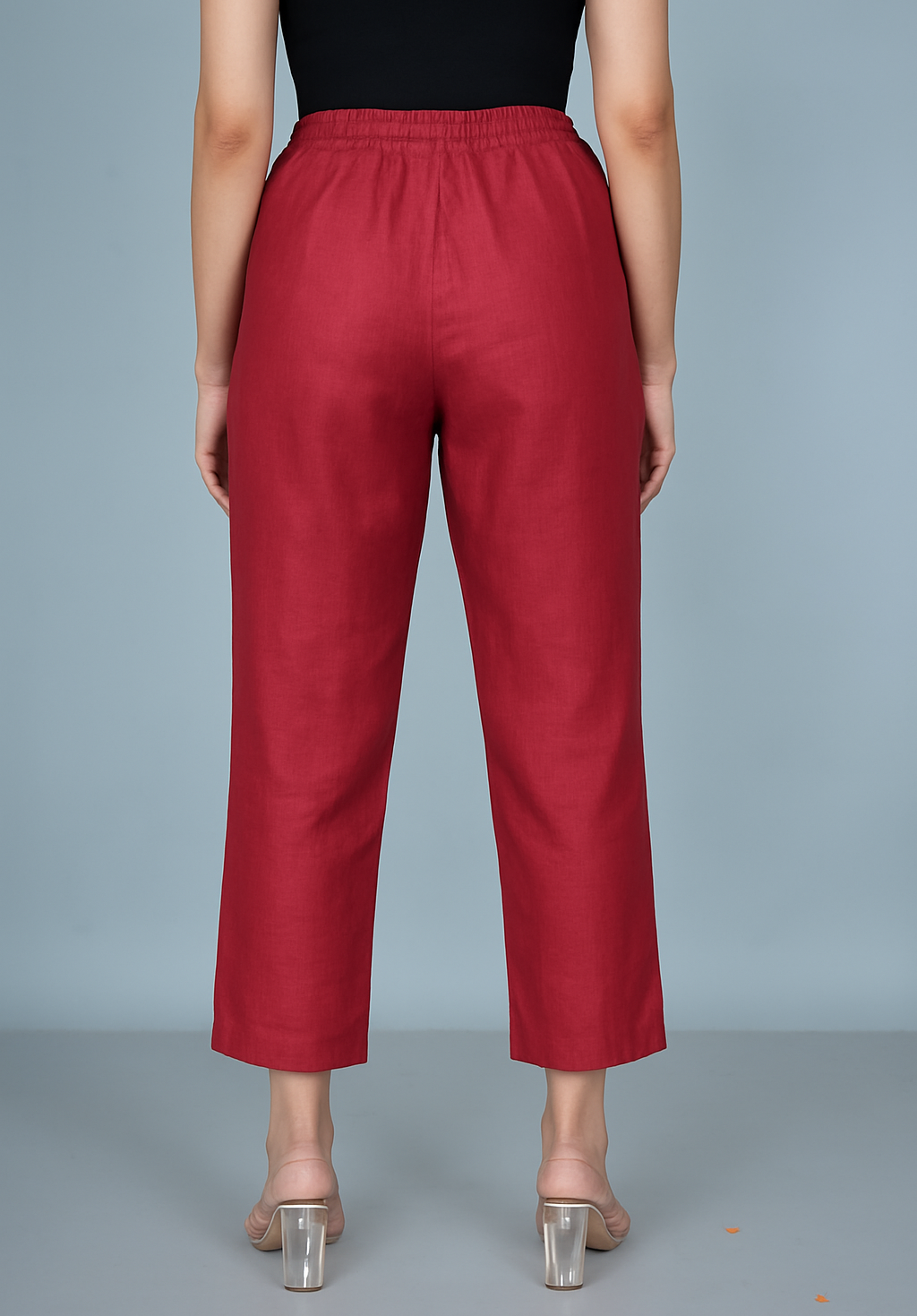 Tailored in rich red cotton silk, these pants bring together comfort and elegance with ease. The fabric is lightweight, breathable, and has a subtle sheen that adds sophistication to any look. Designed with a straight fit and side pockets for everyday functionality, these versatile pants pair effortlessly with kurtas, tops, or dupattas — making them a timeless wardrobe essential.