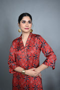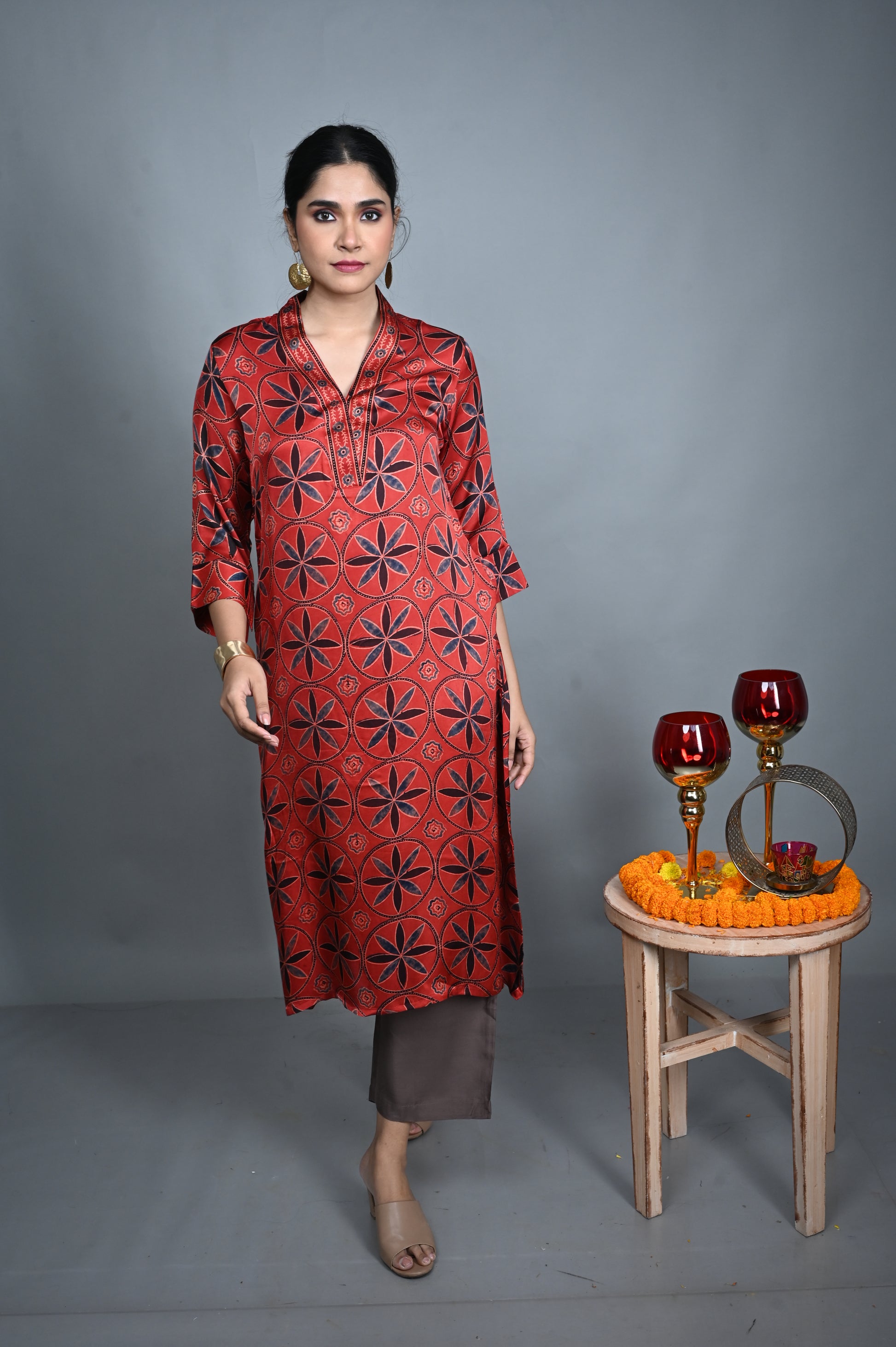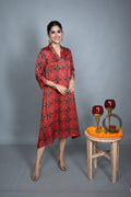 This vibrant red modal silk dress showcases a graceful V-neckline and subtle yet striking floral motif detailing throughout. Designed for a flowing, flattering silhouette, it effortlessly blends artisanal charm with contemporary style β perfect for festive occasions or stylish everyday wear