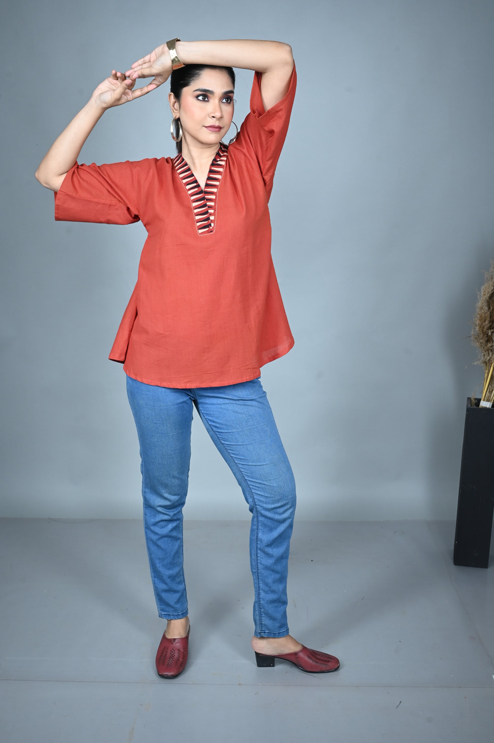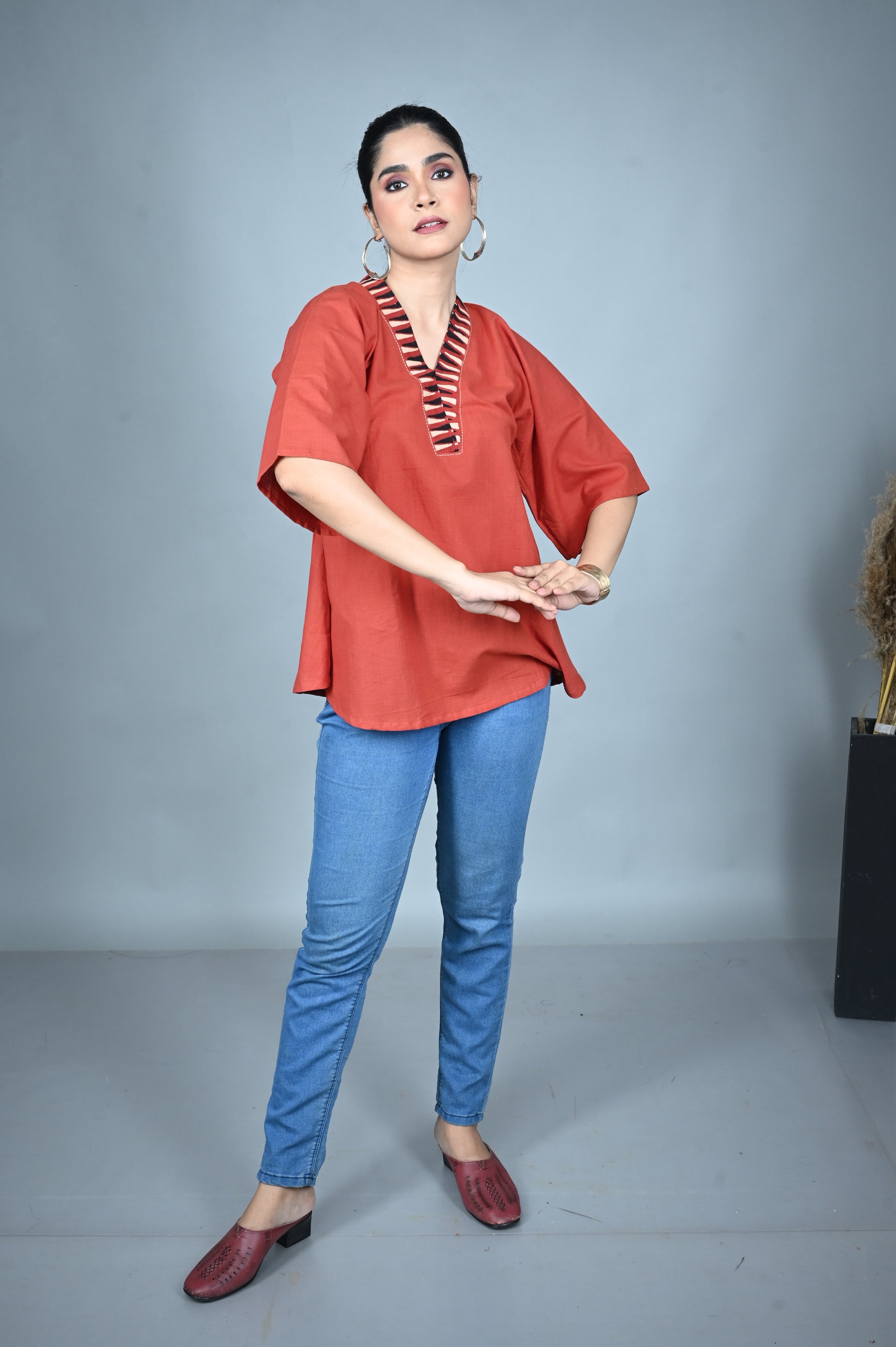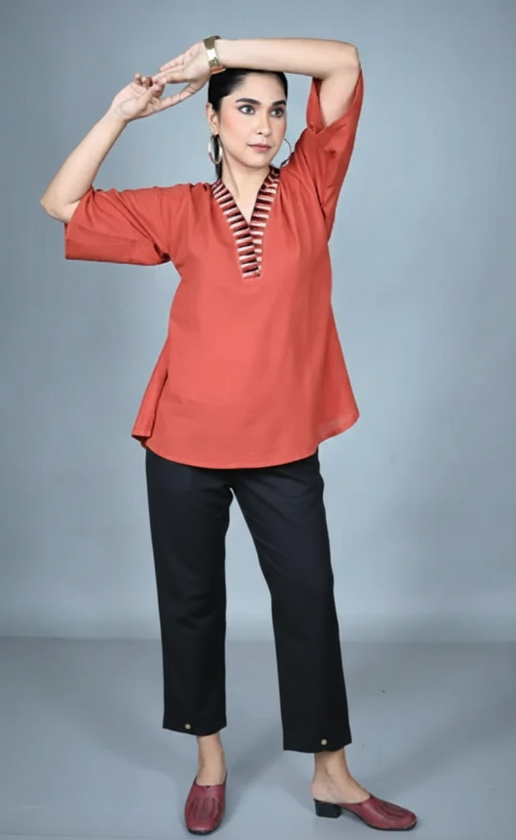 This rust-hued antifit top features a striking Ajrakh-printed placket, adding a handcrafted touch to a relaxed, contemporary silhouette. Made for comfort and style, the breathable fabric drapes effortlessly, making it ideal for casual outings or festive gatherings. The intricate Ajrakh motifs along the placket elevate the design, creating a perfect blend of traditional craftsmanship and modern ease.
