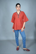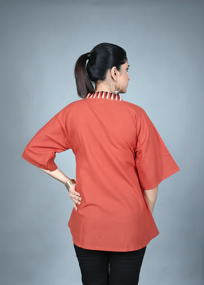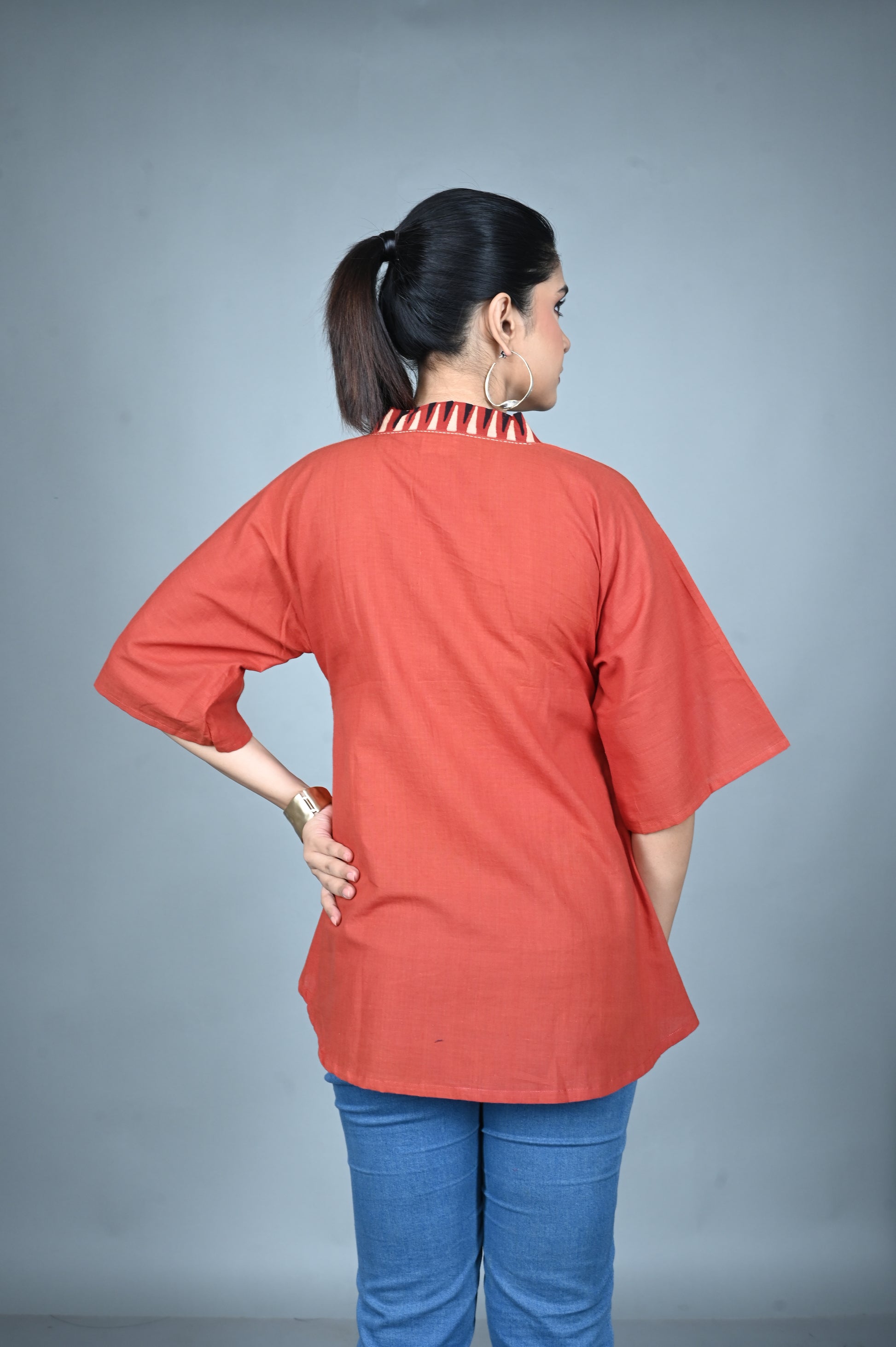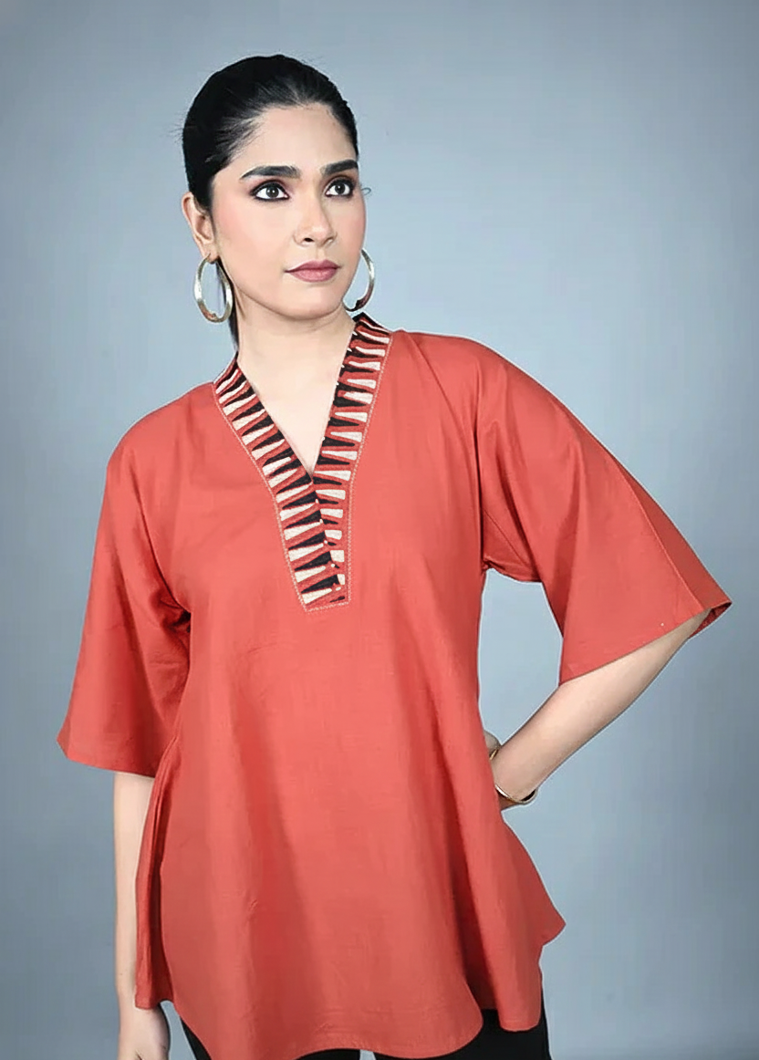 This rust-hued antifit top features a striking Ajrakh-printed placket, adding a handcrafted touch to a relaxed, contemporary silhouette. Made for comfort and style, the breathable fabric drapes effortlessly, making it ideal for casual outings or festive gatherings. The intricate Ajrakh motifs along the placket elevate the design, creating a perfect blend of traditional craftsmanship and modern ease.