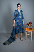 Blue Ajrakh Cotton Stole with Chanderi Silk Accents