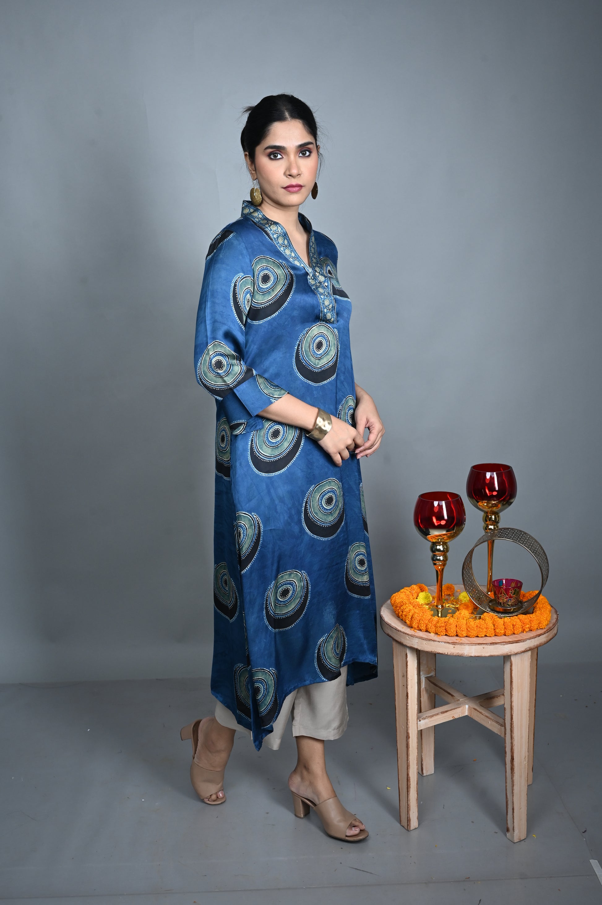 This flowing blue modal silk dress features a graceful V-neckline and intricately designed circle motifs that lend a modern artisanal appeal. Soft and lightweight, it drapes beautifully for a flattering silhouette, making it an ideal choice for festive gatherings or effortless everyday elegance.