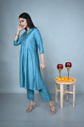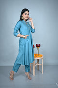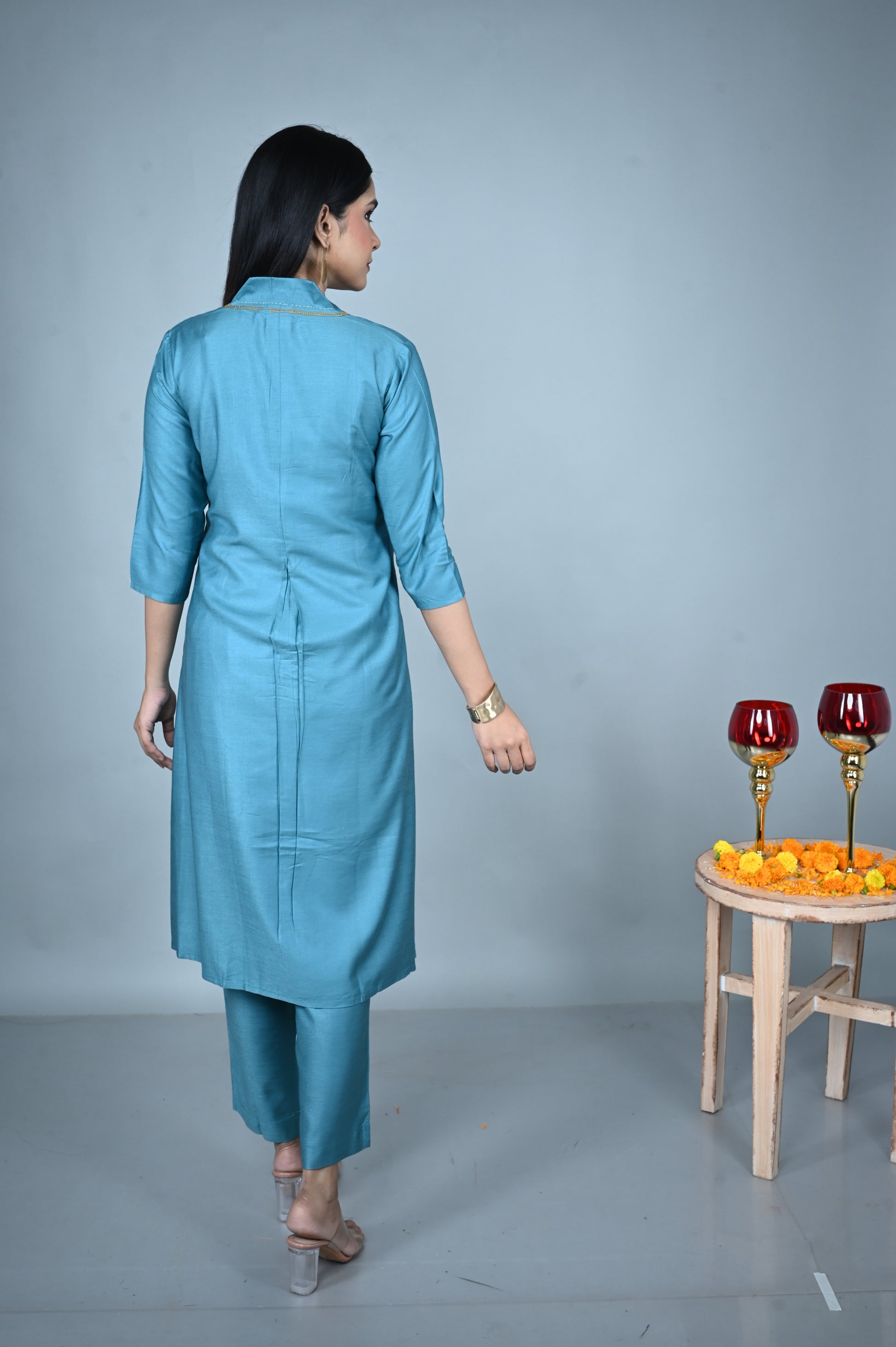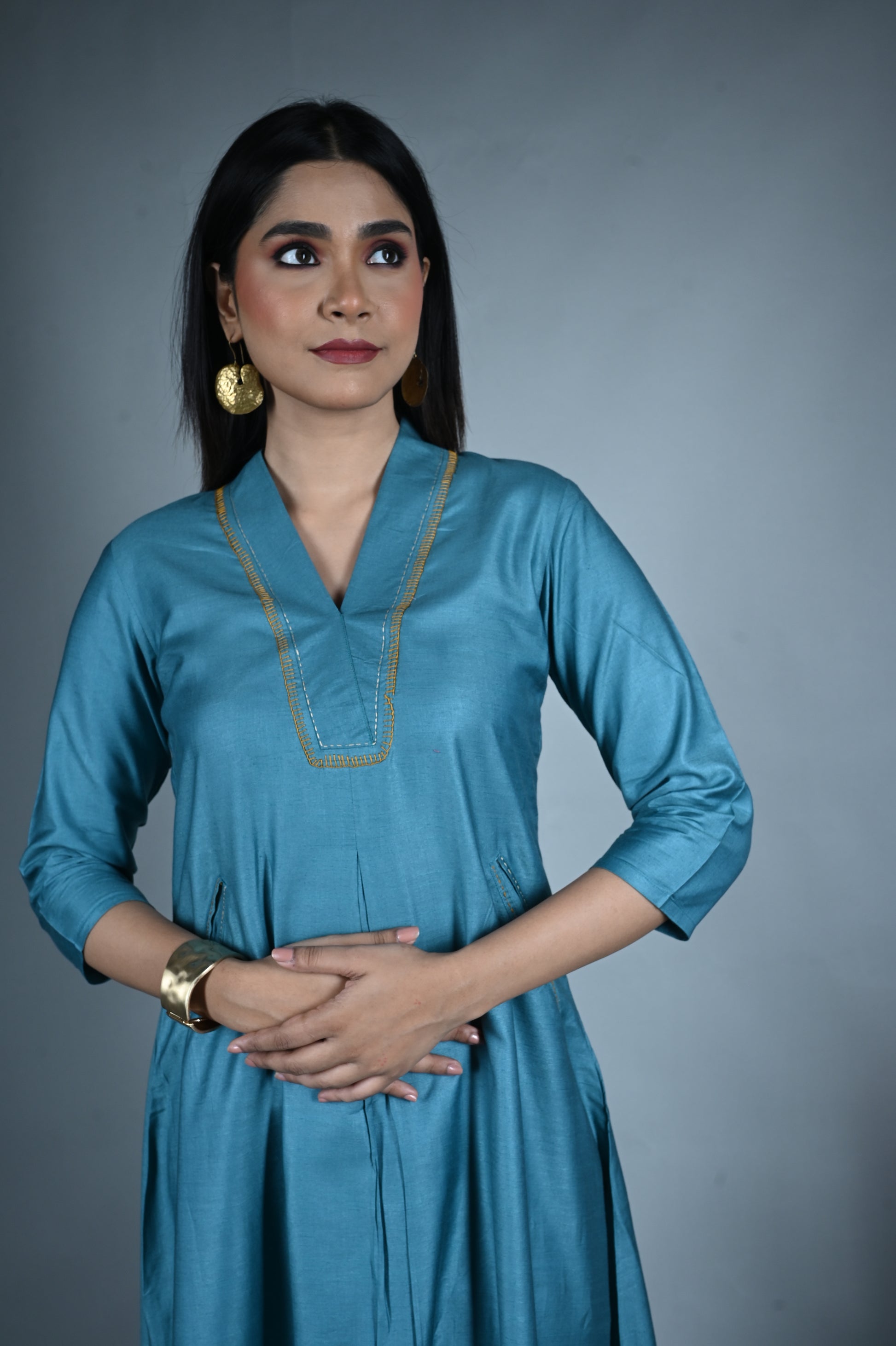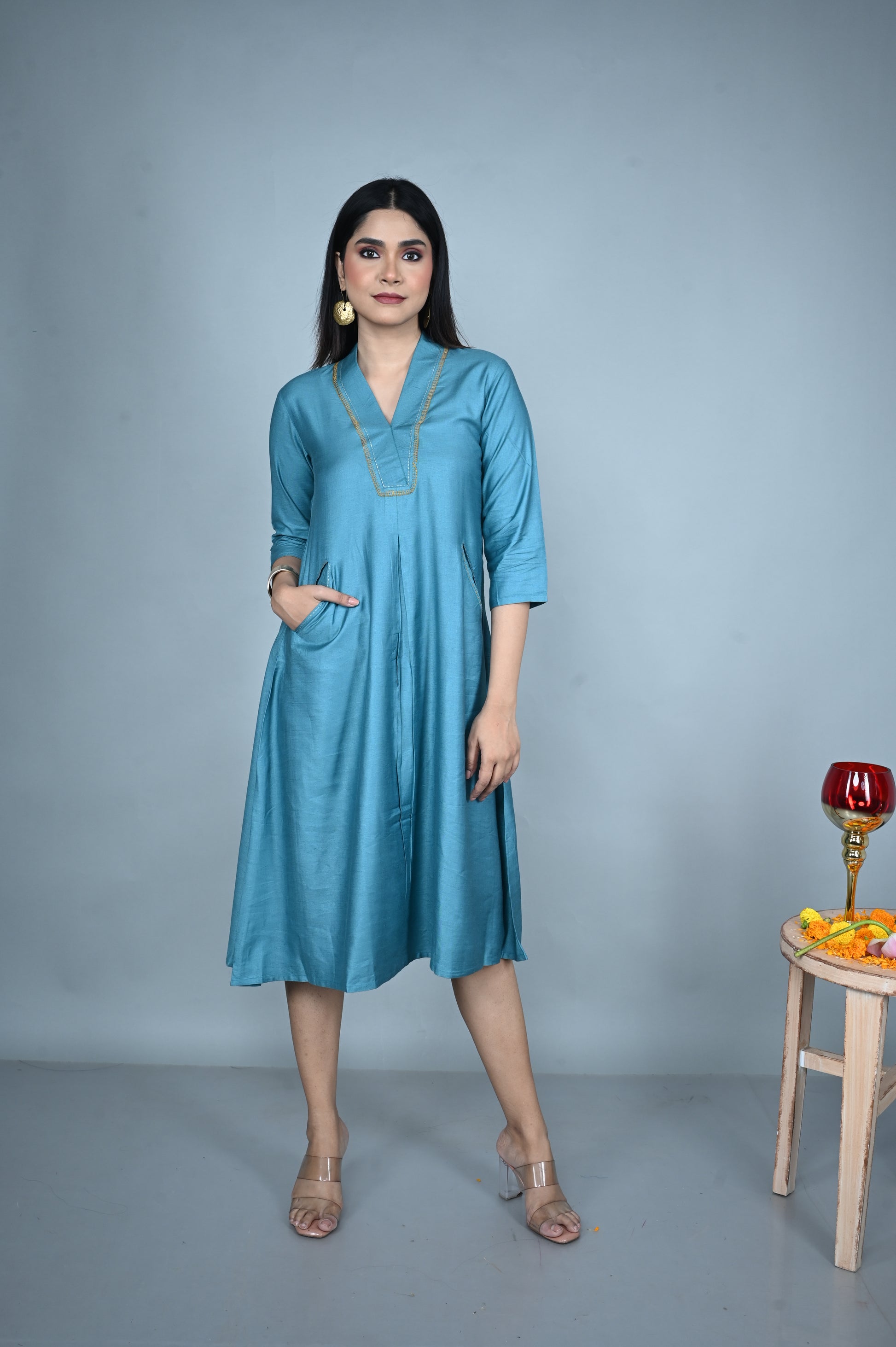 Teal Silk Slub Dress with Hand Embroidery Detailing