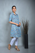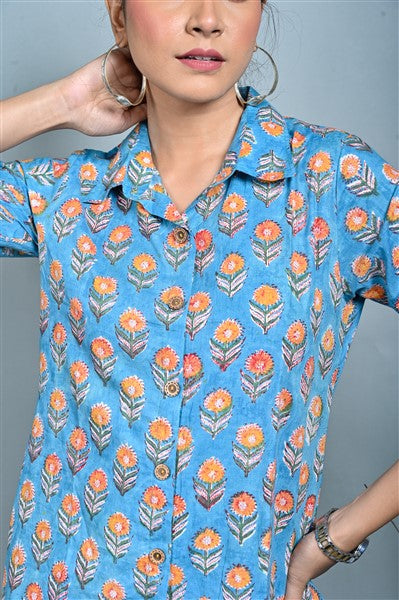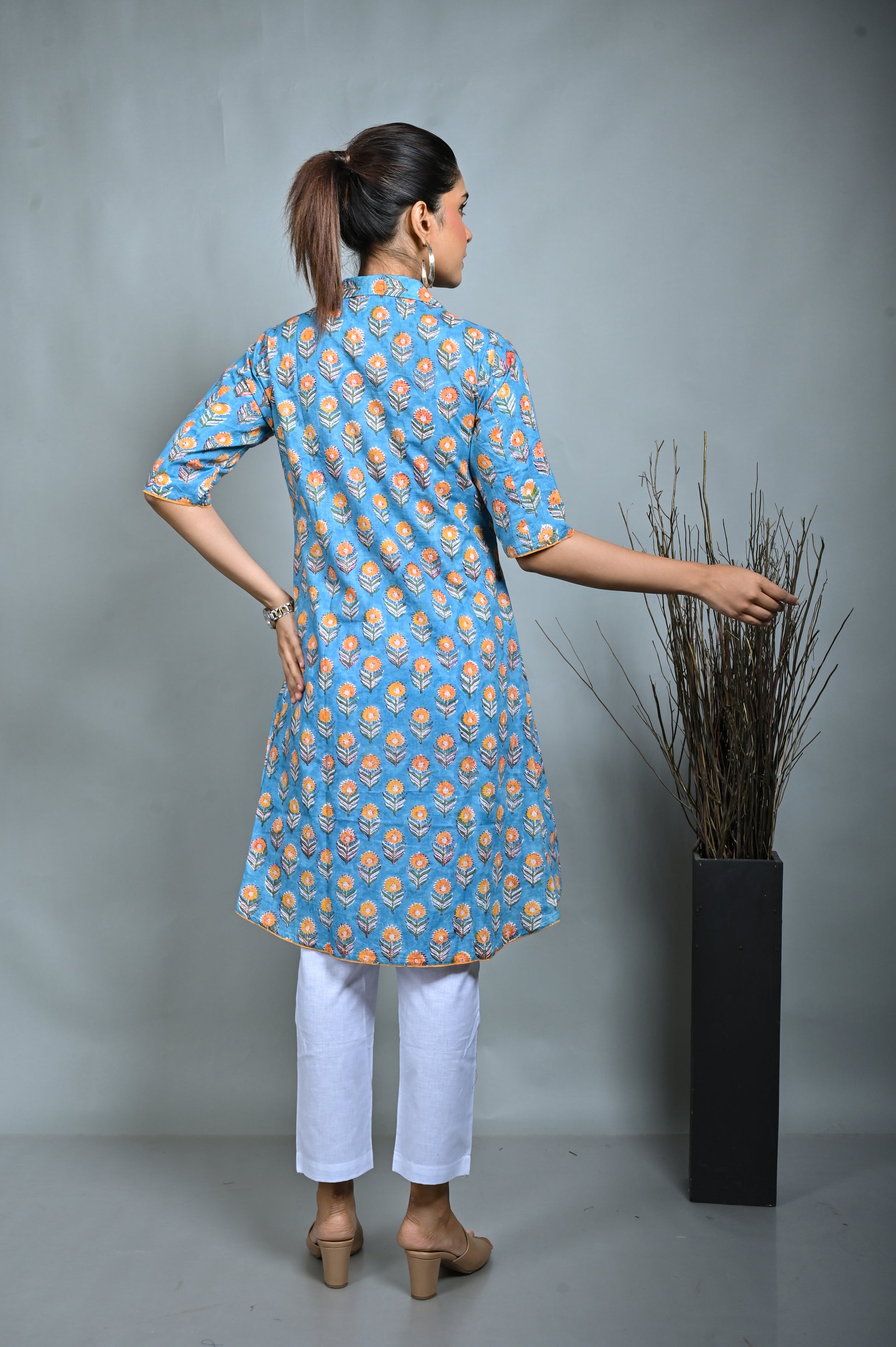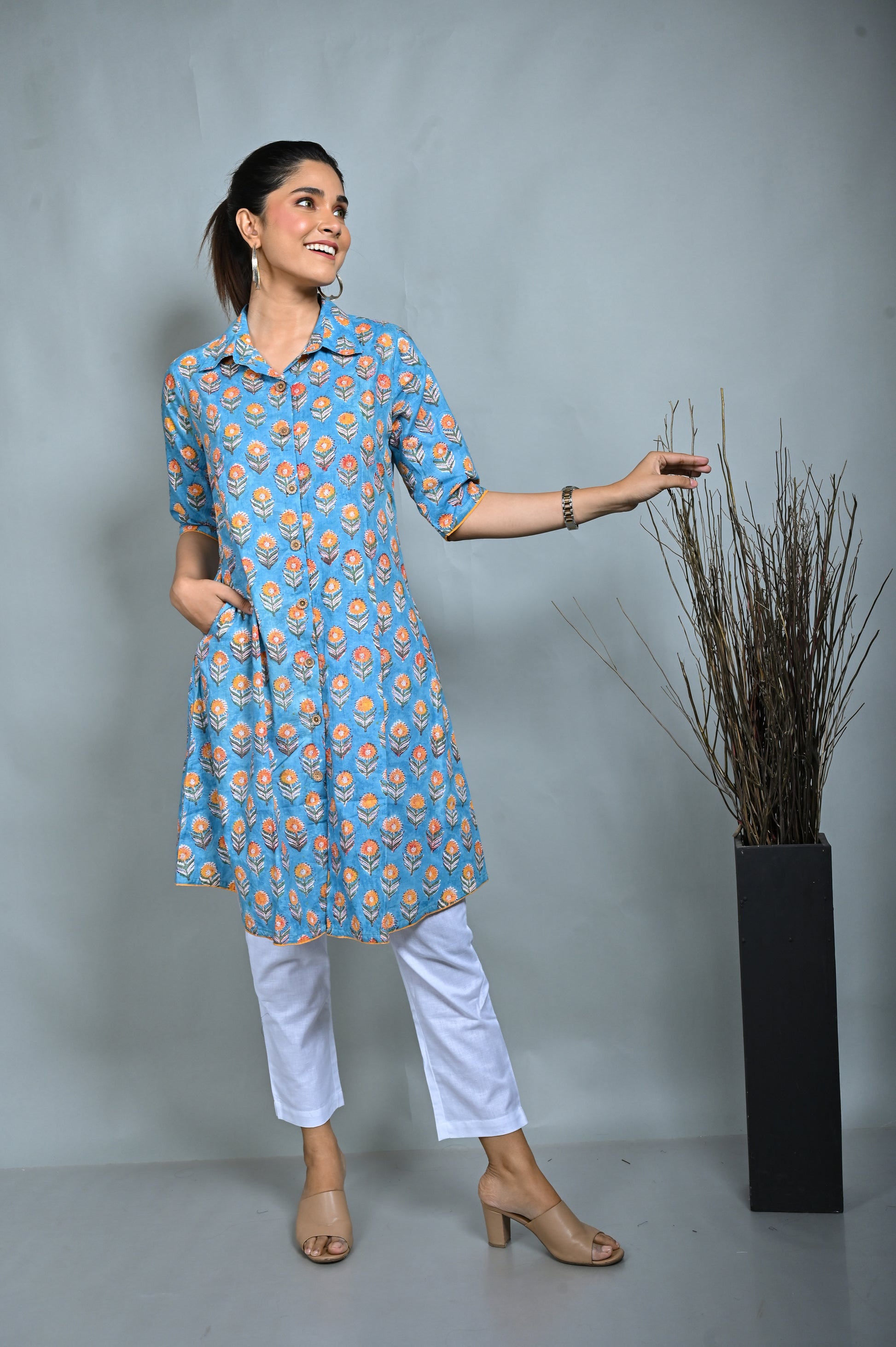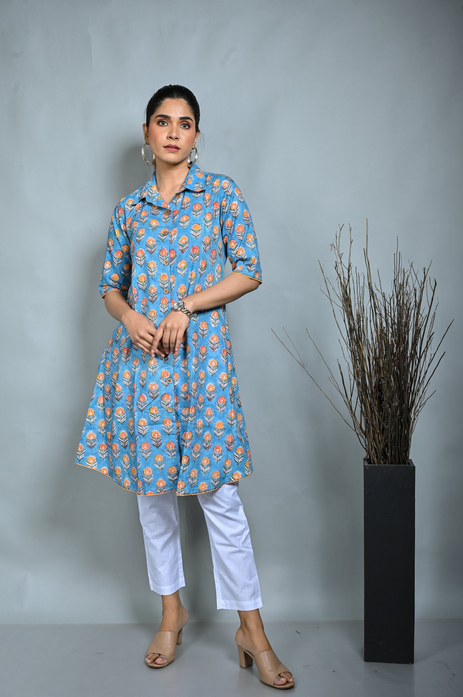 This Turquoise Block Printed Dress features a stylish front-open design, perfect for layering or wearing alone. The vibrant block print adds a bold touch to your wardrobe, blending traditional patterns with modern flair.