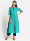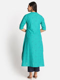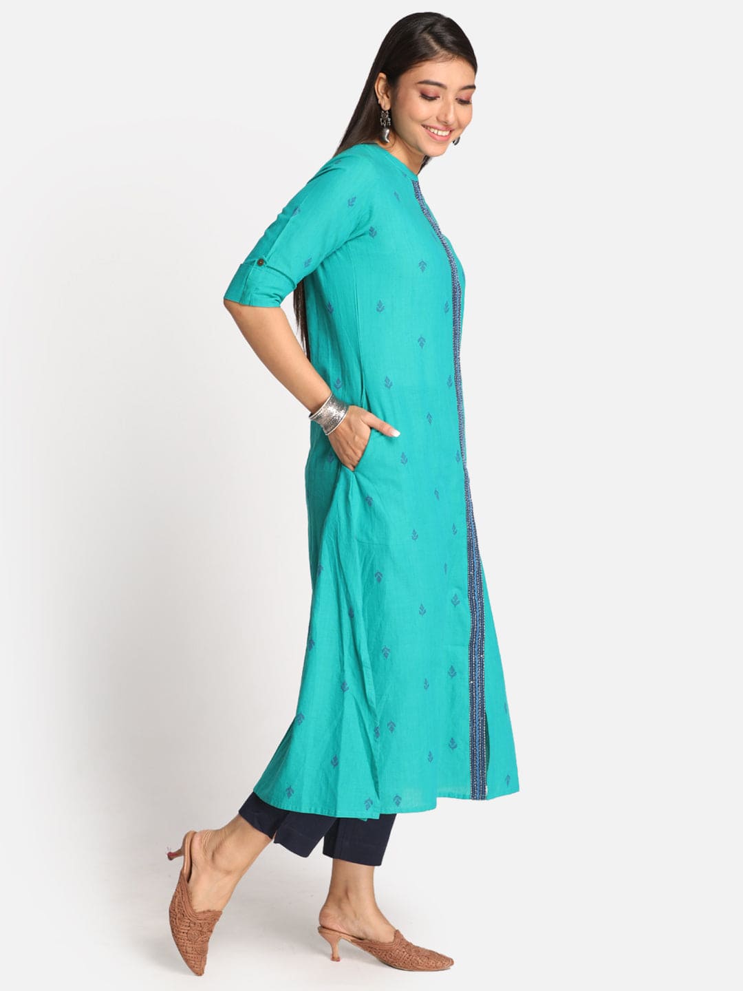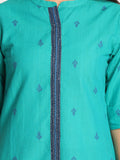 Turquoise Blue Printed Dobby Kurta with Hand Embroidery Detailing