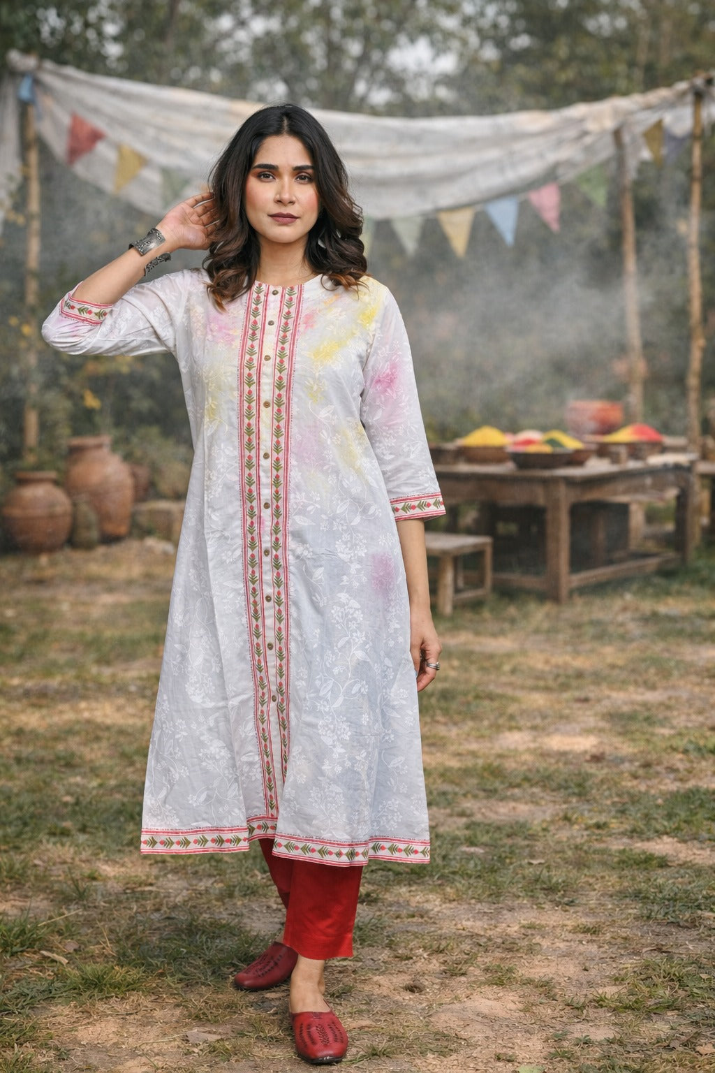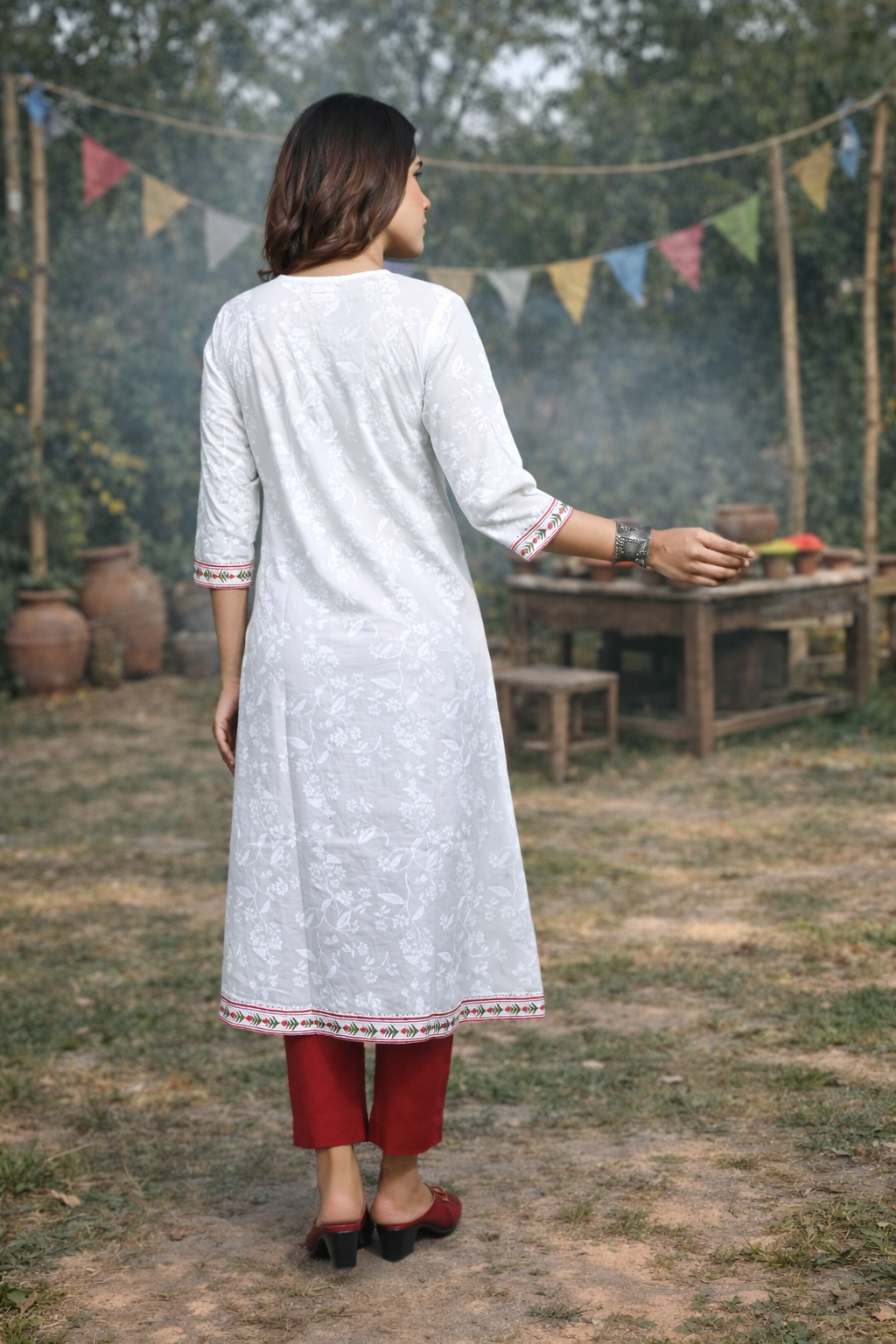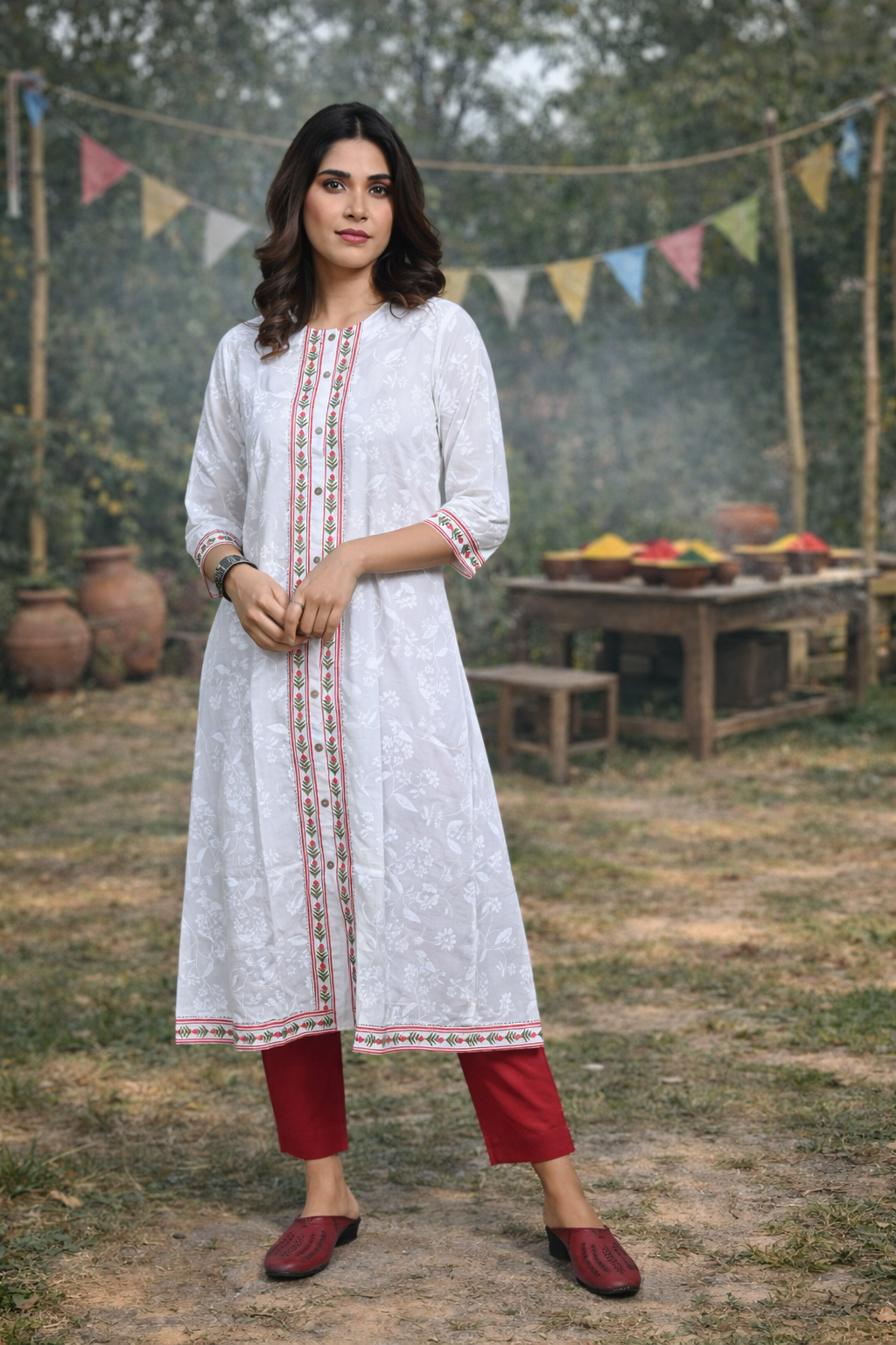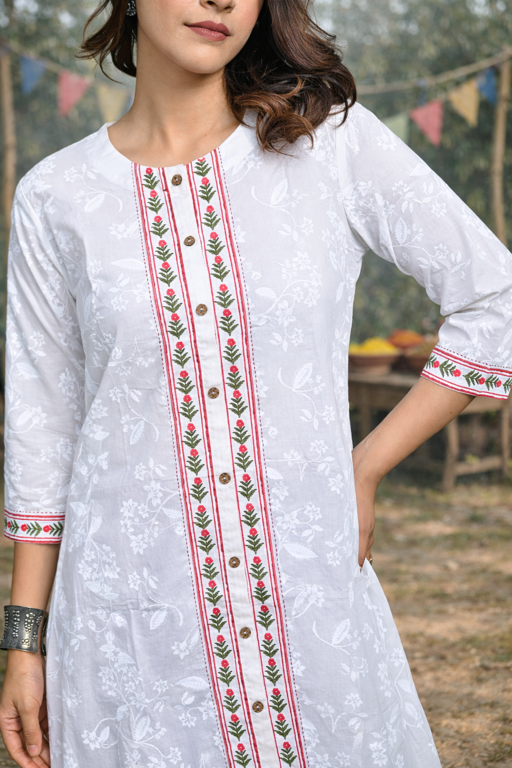 Elevate your style with this White Floral Print Front-Open Kurta, featuring a graceful A-line silhouette for a flattering fit. Designed in soft cotton with a delicate floral print, it’s perfect for both casual and festive occasions.