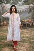 White Floral Printed Cotton A-Line Front Open Kurta