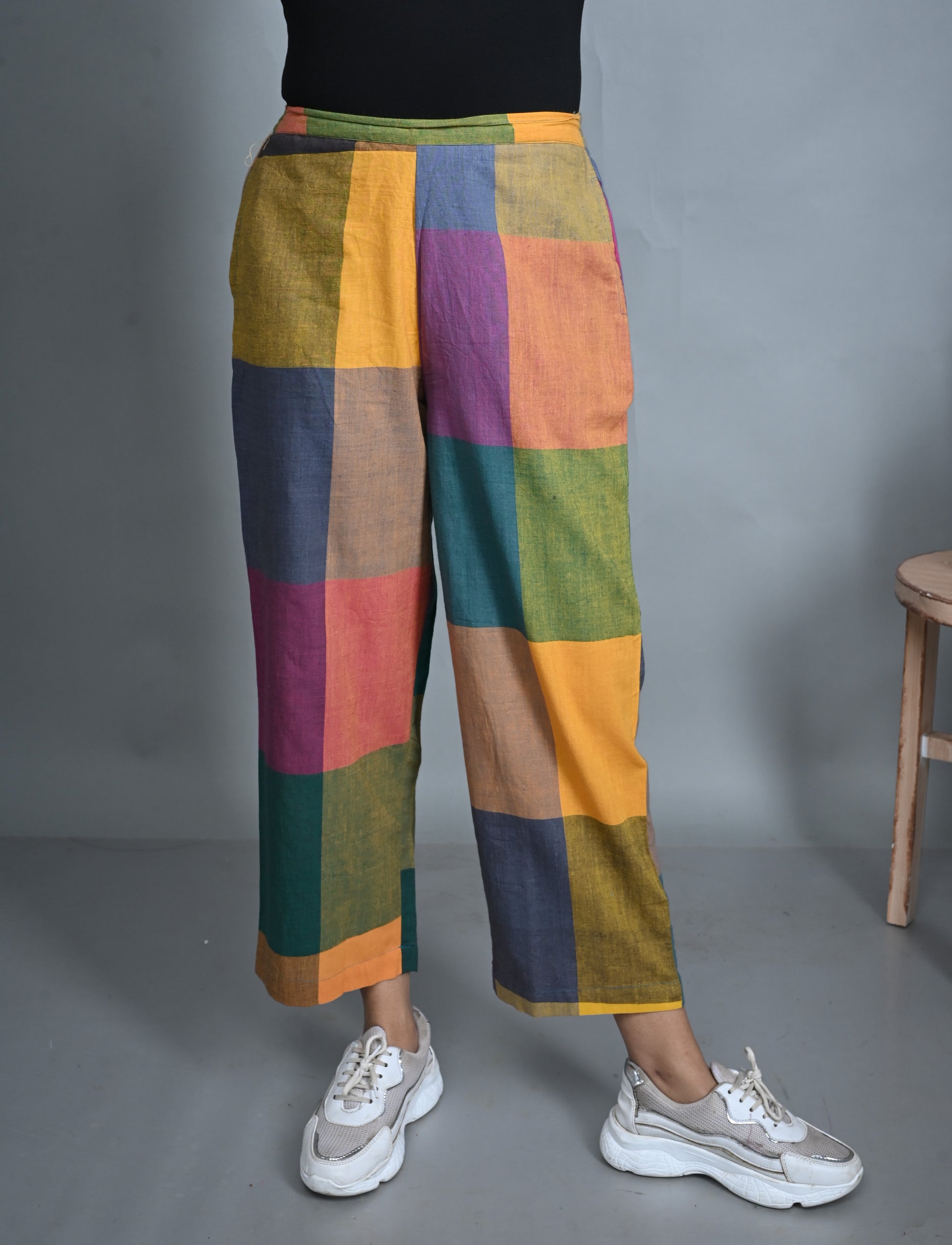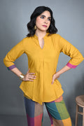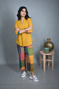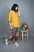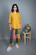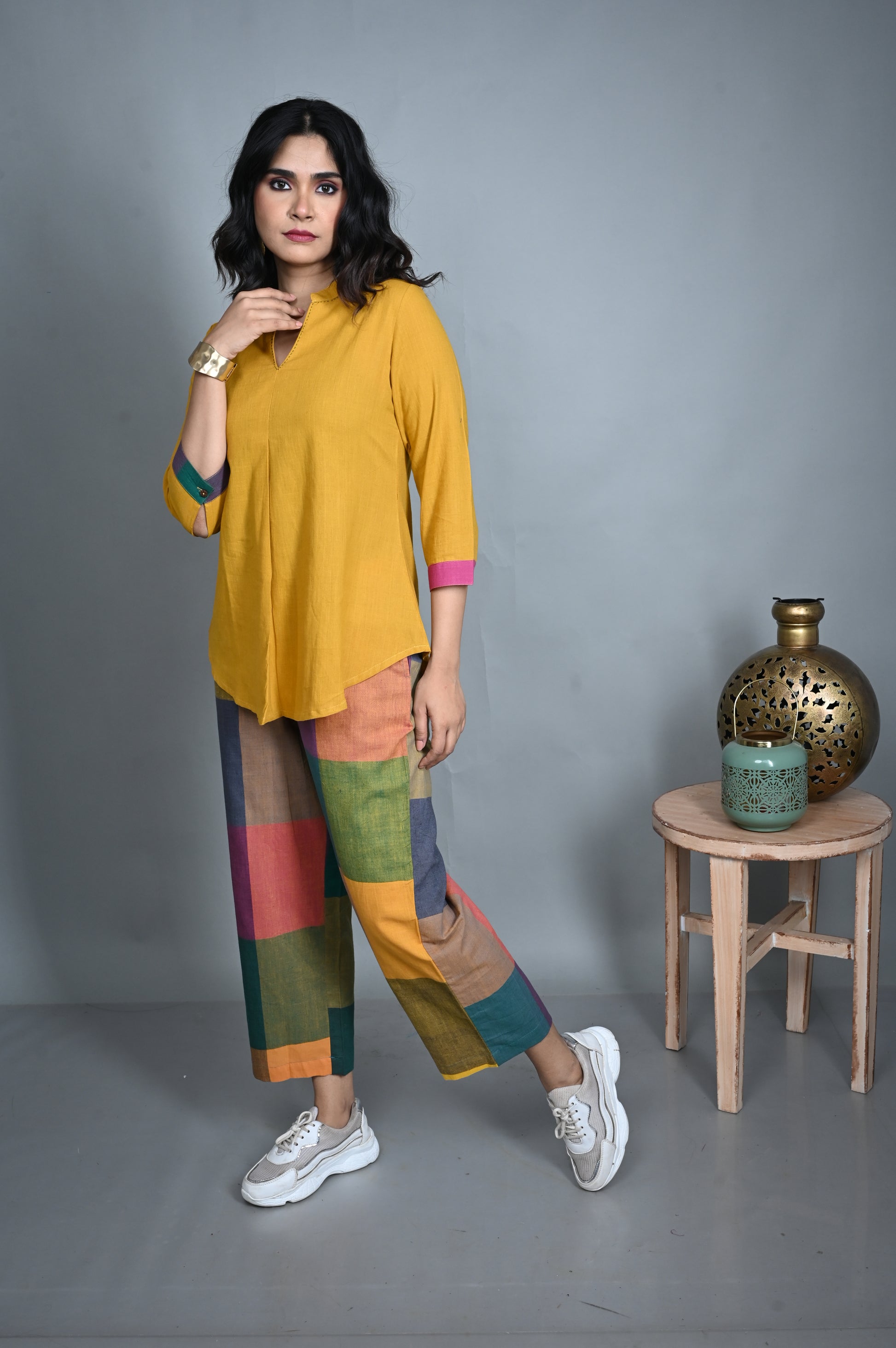 Yellow Front-Pleat Handwoven Top with Mustard Multi-Coloured Pants Co-ord Set (set of 2)
