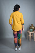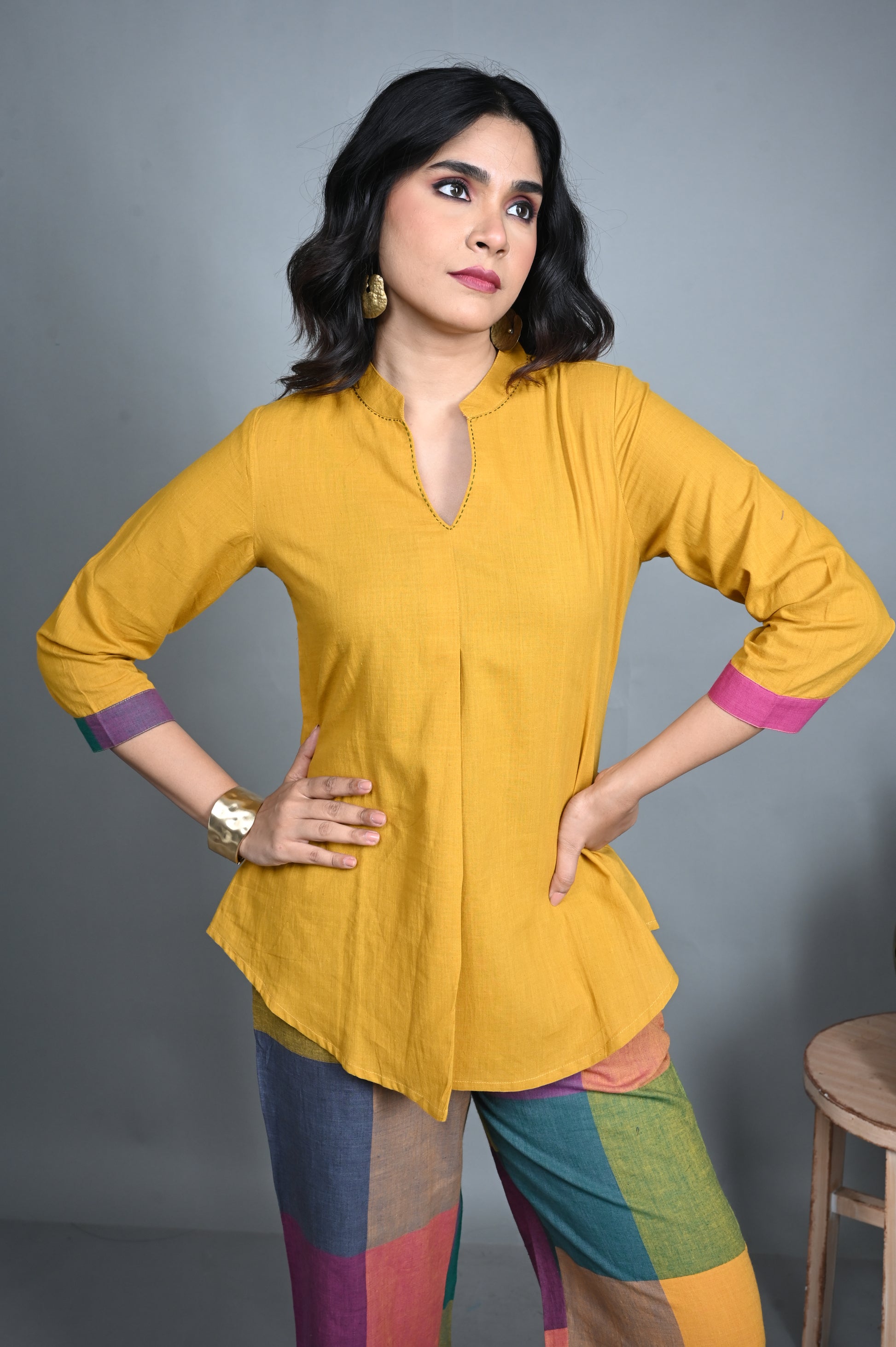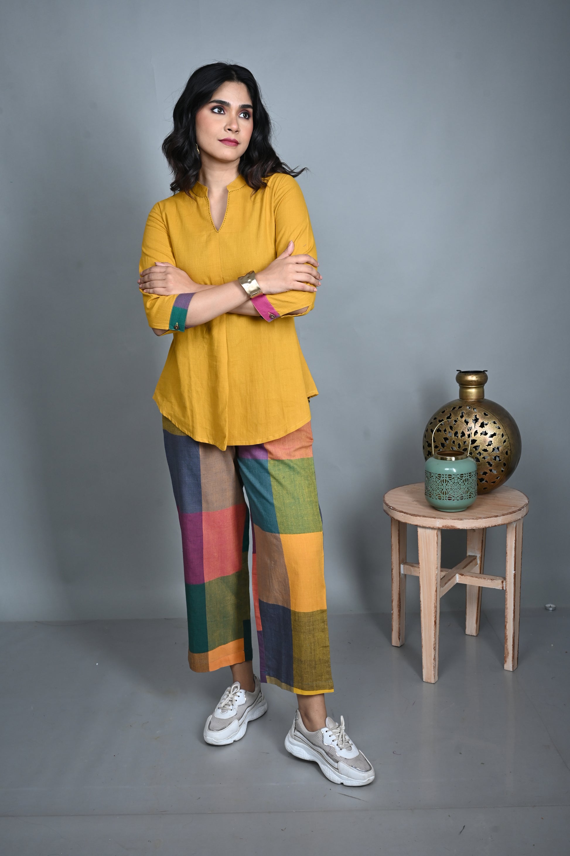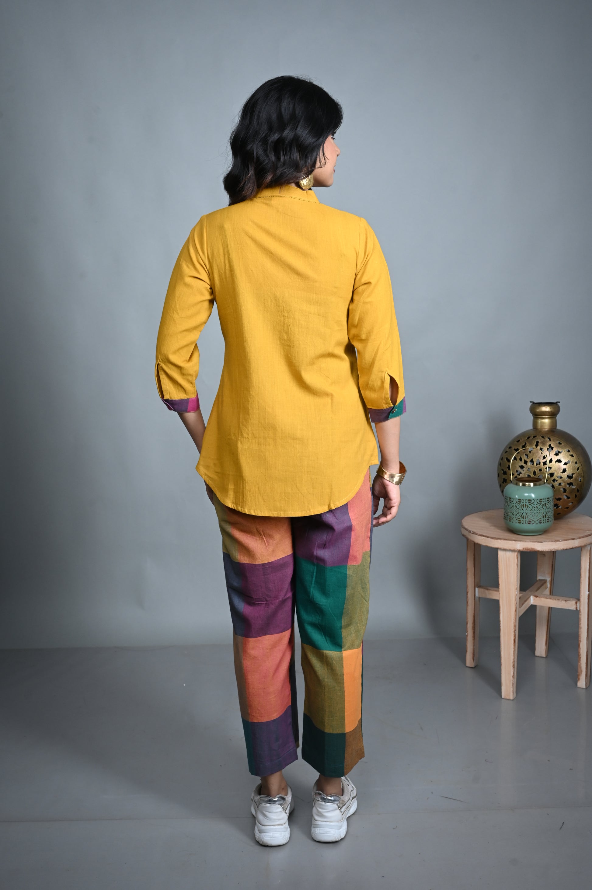 Bright and cheerful, this yellow band-collar top features a graceful front pleat and delicate hand embroidery along the neckline, adding a touch of artisanal charm. The cuffs are detailed with a patch of the mustard multi-coloured checks from the coordinating pants, creating a cohesive, playful look. Paired with mustard multi-coloured pants, this ensemble effortlessly balances traditional craftsmanship with modern style, perfect for casual gatherings or festive occasions.