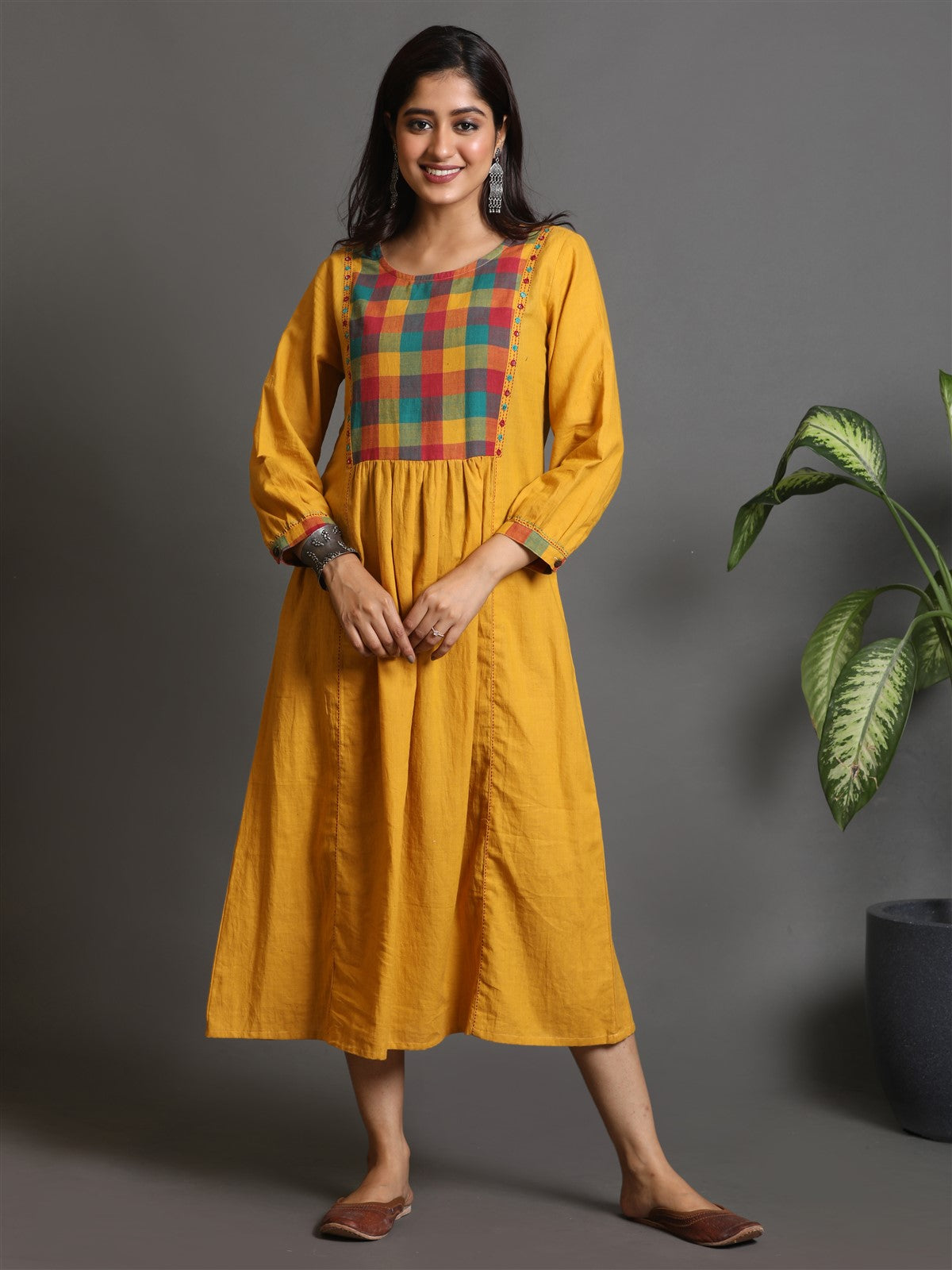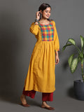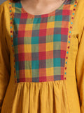 Yellow multi-colour Checks Yoke Handwoven Gather Dress With Mirror Work